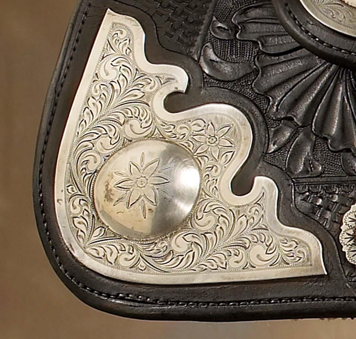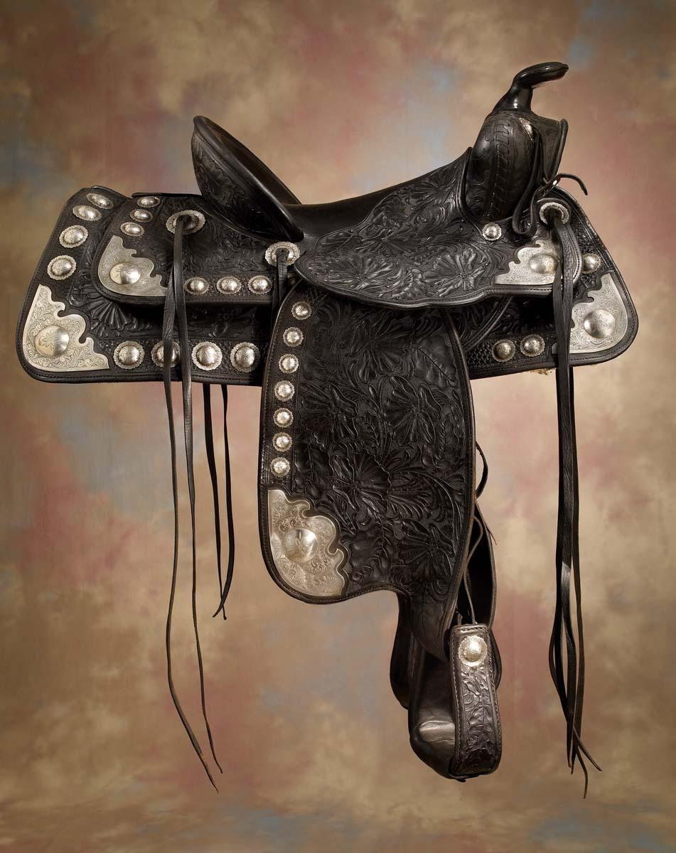 Unmarked Keyston style, black floral carved show saddle with 14" seat, 4" high cantle, scalloped conchos in sizes from 1 1/4" to 2", fancifully engraved corner plates. Fine overall condition, c 1940s