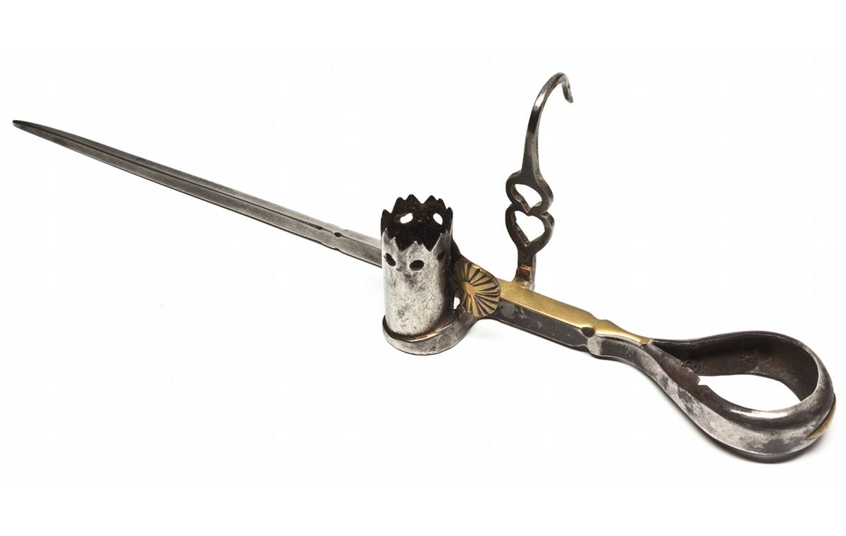 Fancy figural blacksmith measures about 12” with steel and brass ornamentation. There is some wear present. The candlestick is decorated with two heart shape design cutouts on the hook handle. There is also a brass design on the thumb lever and side on the handle. Thimble has been decorated with several cutout designs. This candlestick is also a high grader’s stick with indented handle. Not listed in Wilson. RSC 84. - Ken & Rosemary Roberts Collection -59209