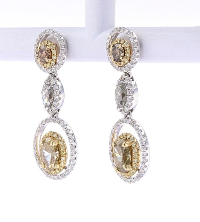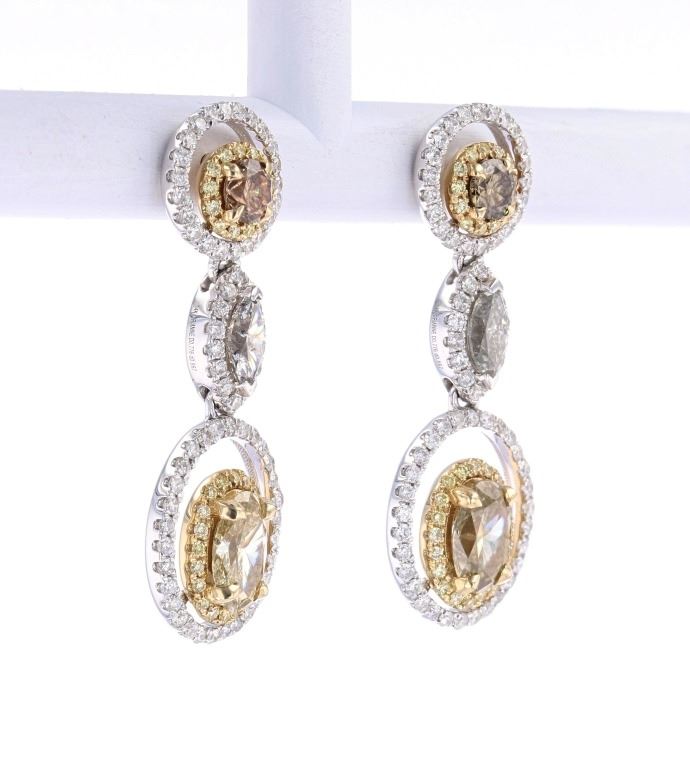 The lot features a magnificent set of Fancy Colored Diamond dangle earrings in 14K gold with paperwork. Overall the earrings show a total of 2.69 carats of diamonds including two oval cut 1.14 carat light yellow diamonds with an SI1 to I1 clarity; two round brilliant cut 0.30 carat diamonds with light brown coloring and SI2 to I1 clarity; two marquise cut diamonds 0.36 carats with a H-I nearly colorless color and SI2 to I2 clarity; and 200 round brilliant 0.89 carat diamonds with an SI1 to I1 clarity and light yellow to yellow and white coloring. The earrings show a combination of yellow and white 14 karat gold construction and are signed 14K and ORIANNE. The set comes with an AIG (American International Gemologists, a GIA certified lab AIGL#: 000720035006) report and appraisal confirming the above info and giving a value of $11,700.00. Total weight 5.80 grams.