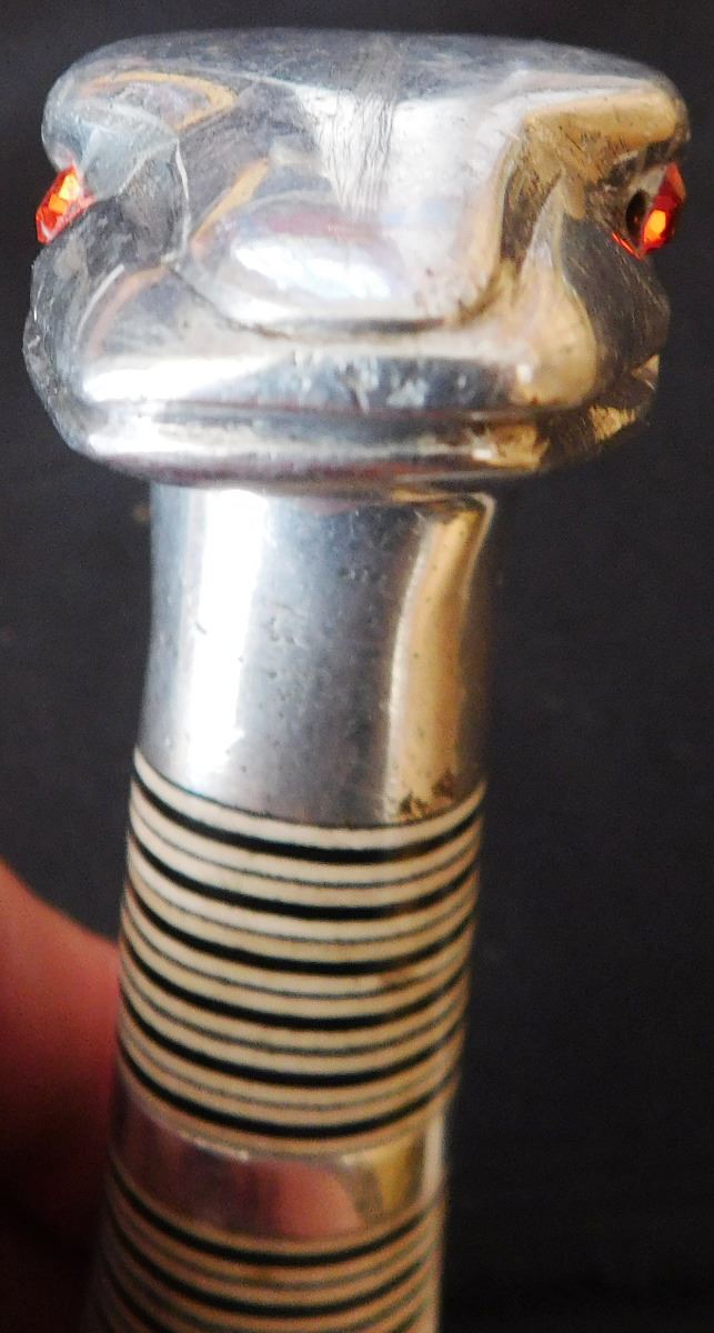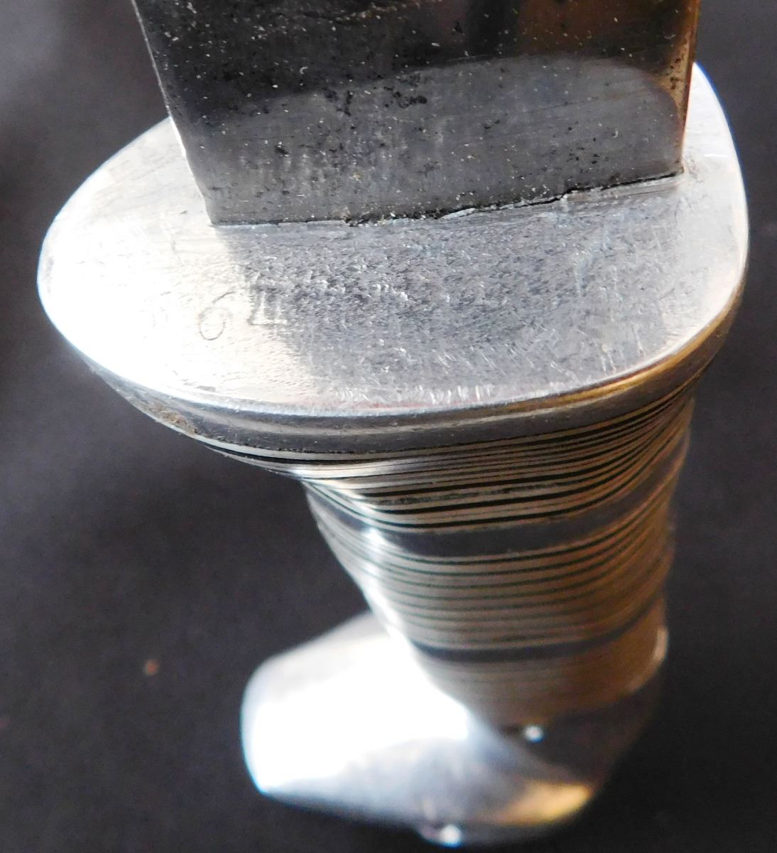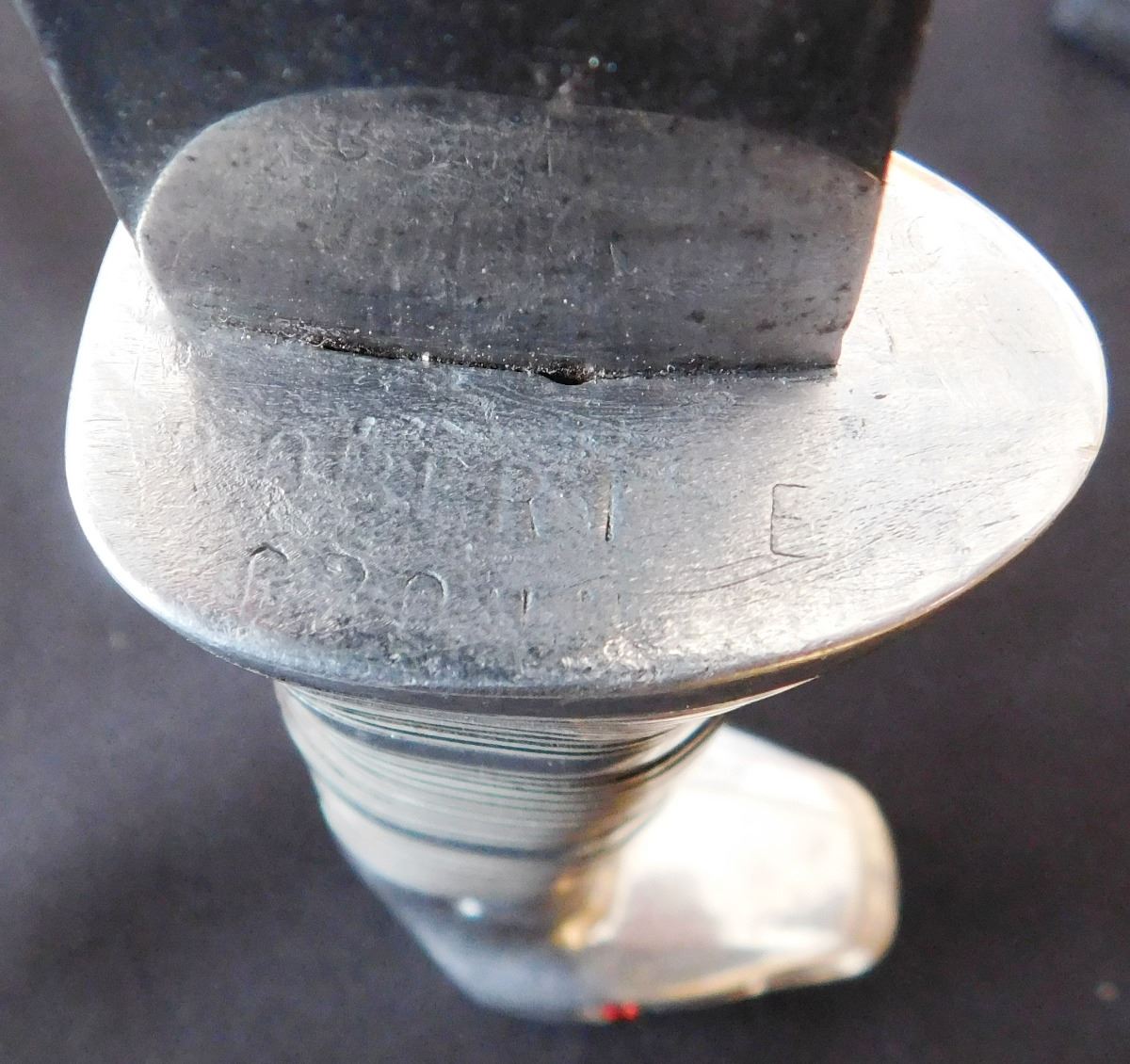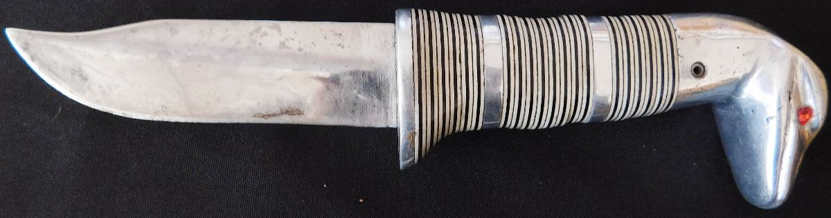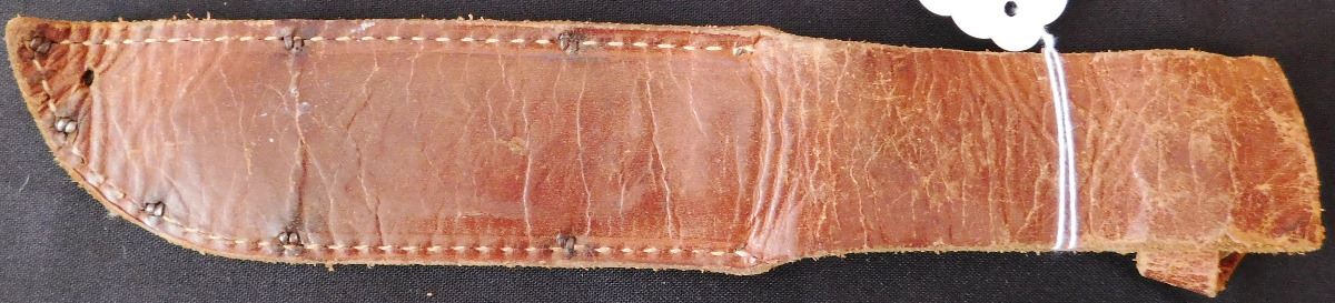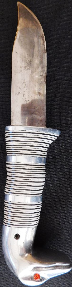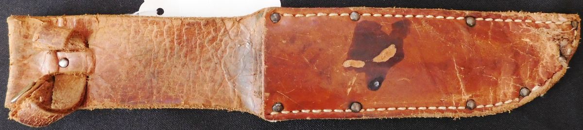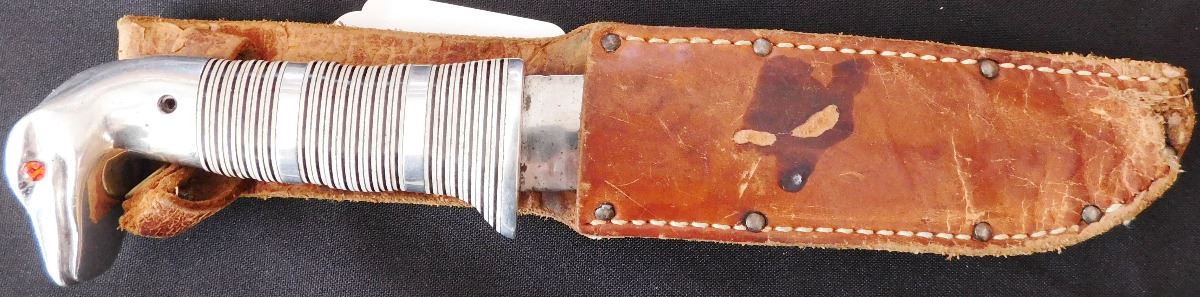 Fancy Custom Hunting Knife, circa 1950s. Made of leather, carbon steel, glass, vinyl, and aluminum. Item measures 9" x 2" x 1", 11.5" with sheath. Name appears to be Robert E Cronn. Condition: Some stains, sheath may be a replacement, has broken snap, see images. Shipping: 15.50.