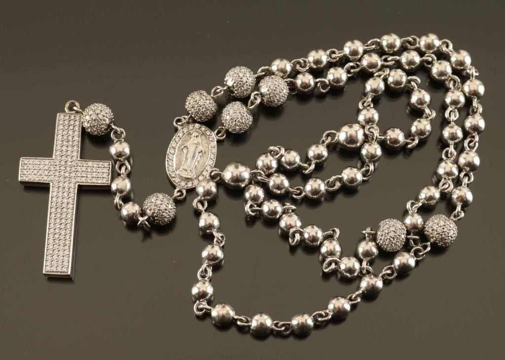 All Sterling necklace with diamond cross and round beads and a diamond incrusted Mary. Very heavy and high quality.
