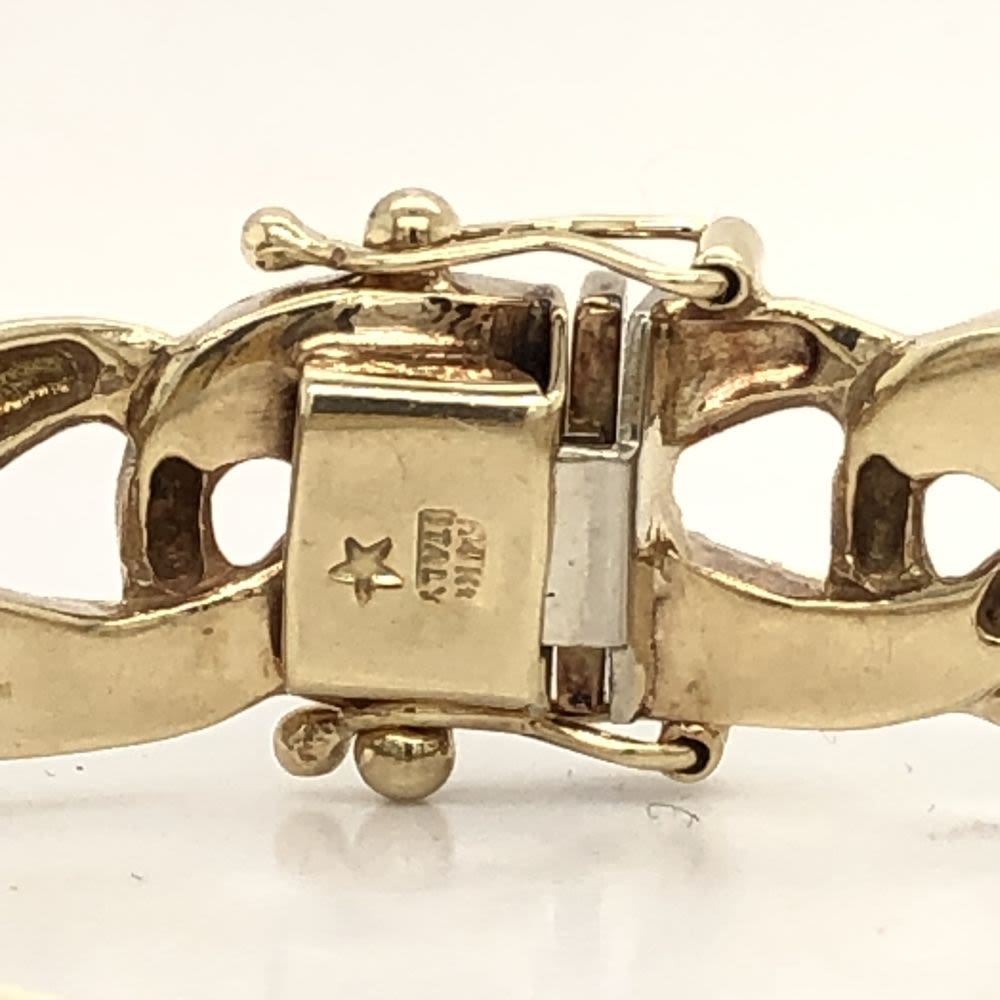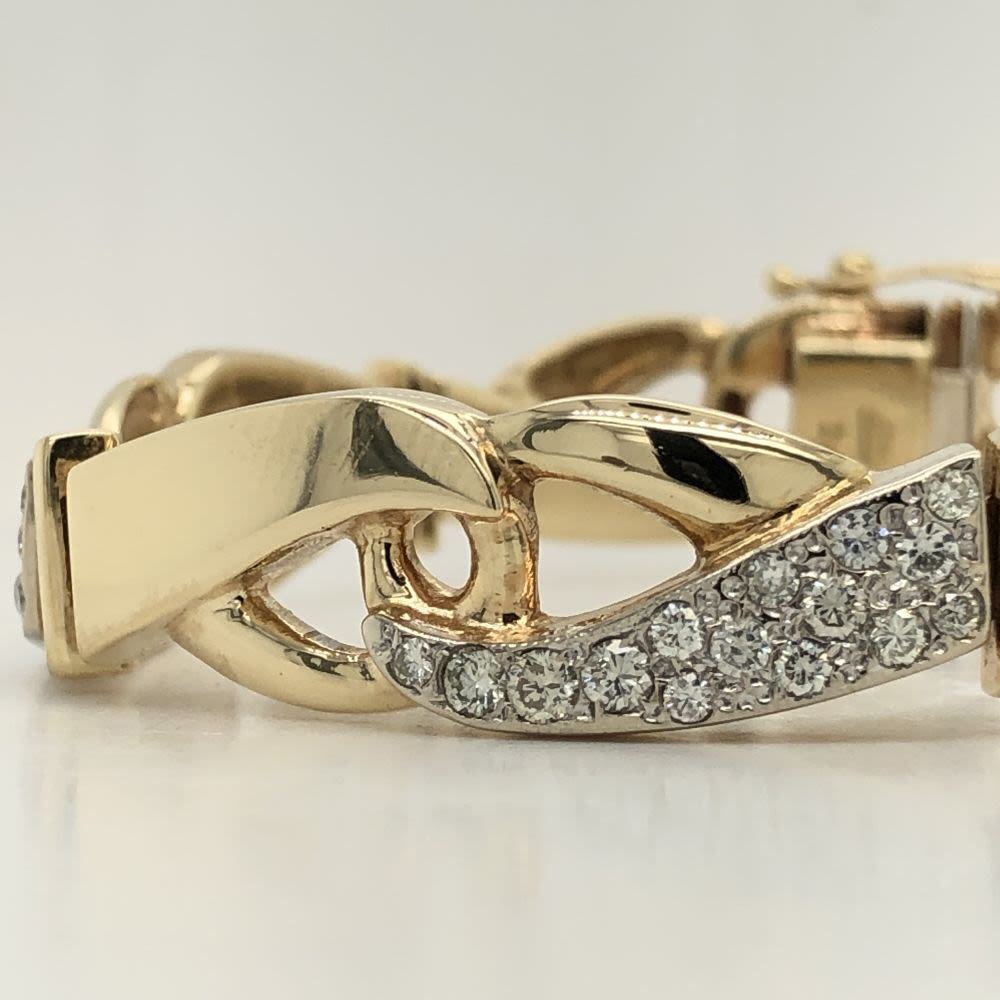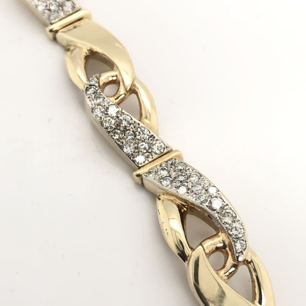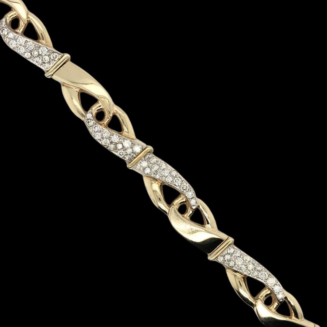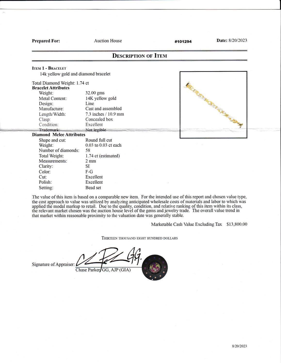 S11/20.6 - OYSS TITLE DESCRIPTION: Exquisite Luxury Diamond Infinity Panel Bracelet DESCRIPTION DETAIL: Earth-Mined Diamond Bracelet OVERALL CONDITION: Excellent, Like New DIAMONDS: Weight: 1.50 Carats Total Weight Shape: Round, Brilliant-Cut Color: F - G Clarity: SI METAL: 14K Yellow Gold WEIGHT : 32.00 grams SIZE: 7" APPRAISAL REPORT: This bracelet is certified and appraised for $13,800.00 estimated retail replacement value by Flawless Gem Lab. Auction Code: S11/20.6 - oyss THIS ITEM IS FROM AN ORDERED LIQUIDATION OF A MAJOR JEWELRY MANUFACTURER OVERSTOCKED INVENTORY WITH A VERY LOW RESERVE PRIOR TO BIDDING READ THE DESCRIPTION, TERMS, AND CONDITIONS CAREFULLY This description and condition report is provided for your convenience based on the information provided by the consignor. CAA is not responsible for any discrepancies between this information and other opinions. Buyers Premium: 18% Shipping Billed Separately Payment Due in 7 days All items shipped to registered address - NO EXCEPTIONS .