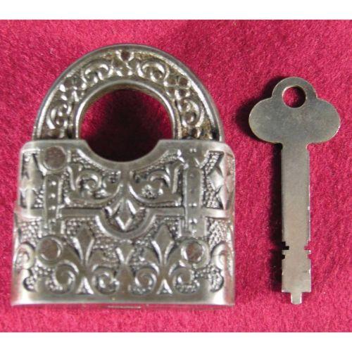 Fancy Engraved Iron Padlock with key, no maker. Excellent condition. 2 1/4 X 3 inches.