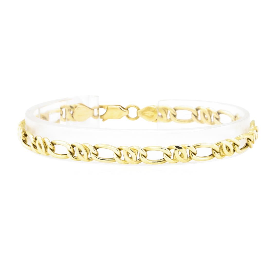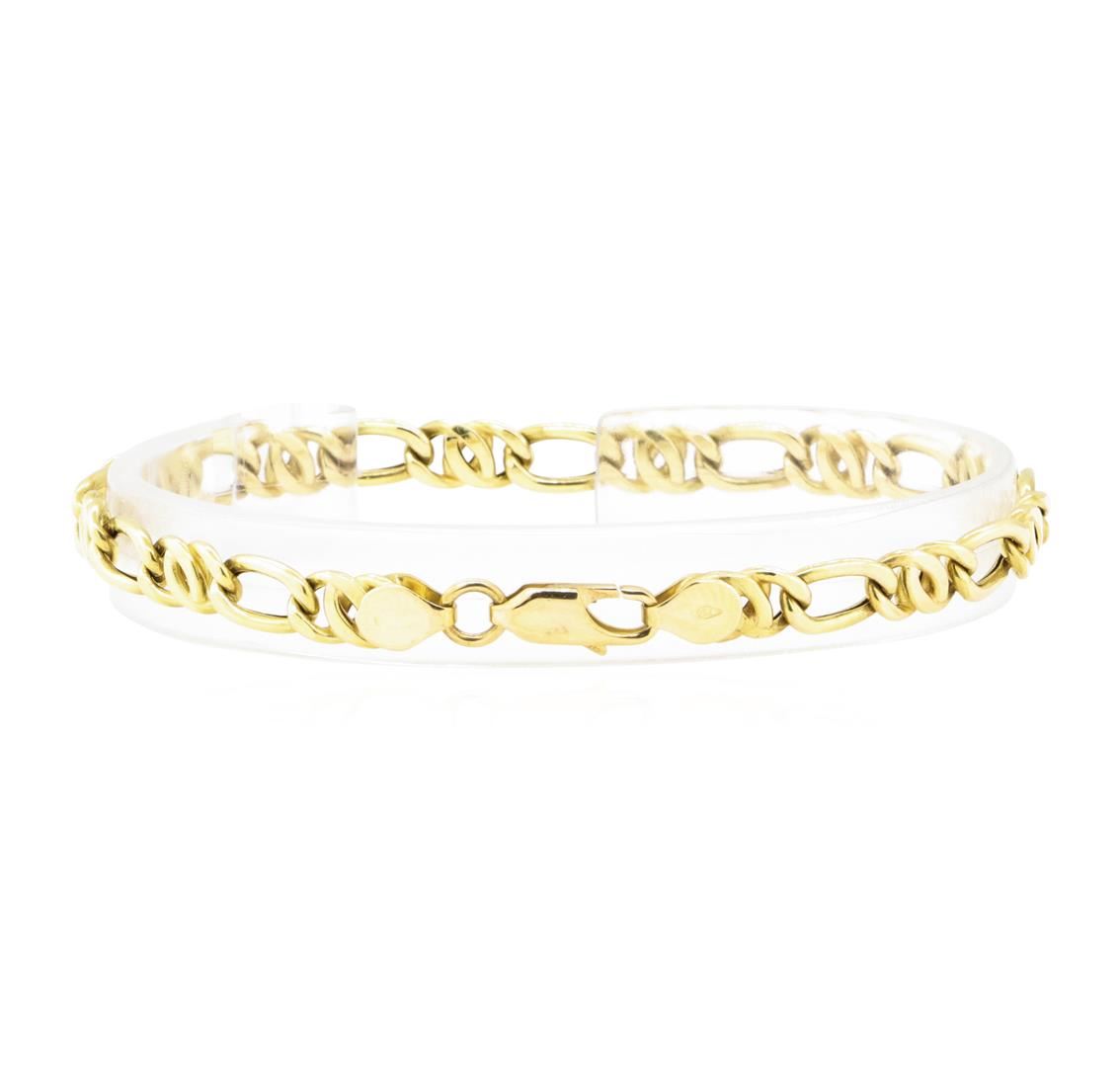 One fancy Figaro link bracelet measuring seven inches in length and 5.5mm in width featuring: 18KT yellow gold weighing 5.6 grams.