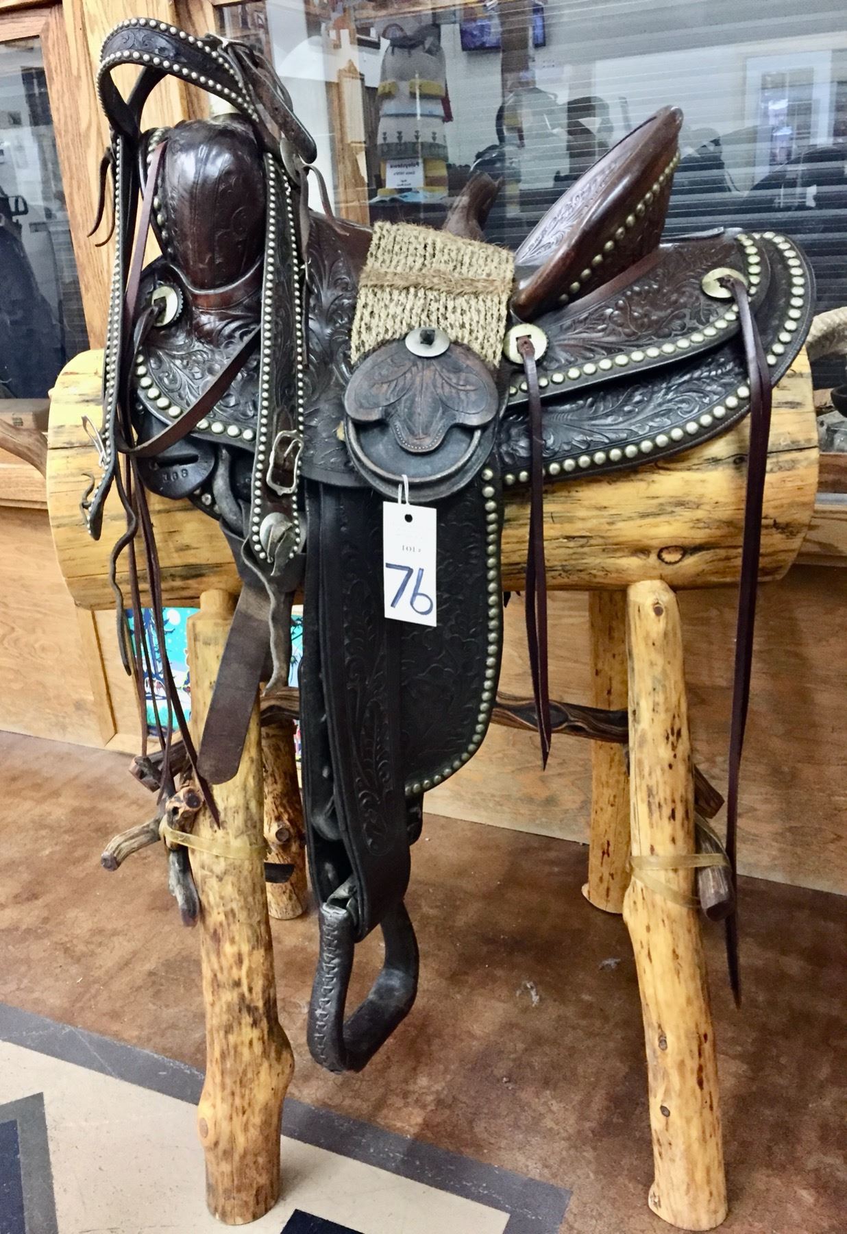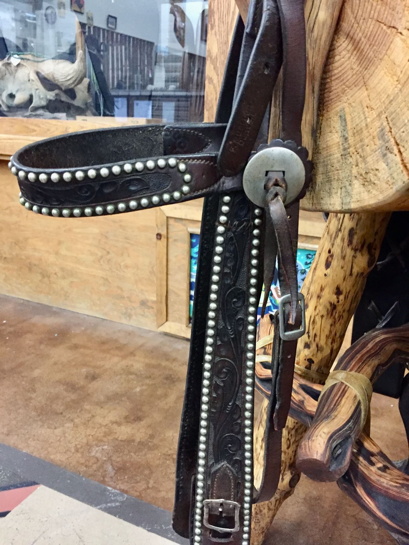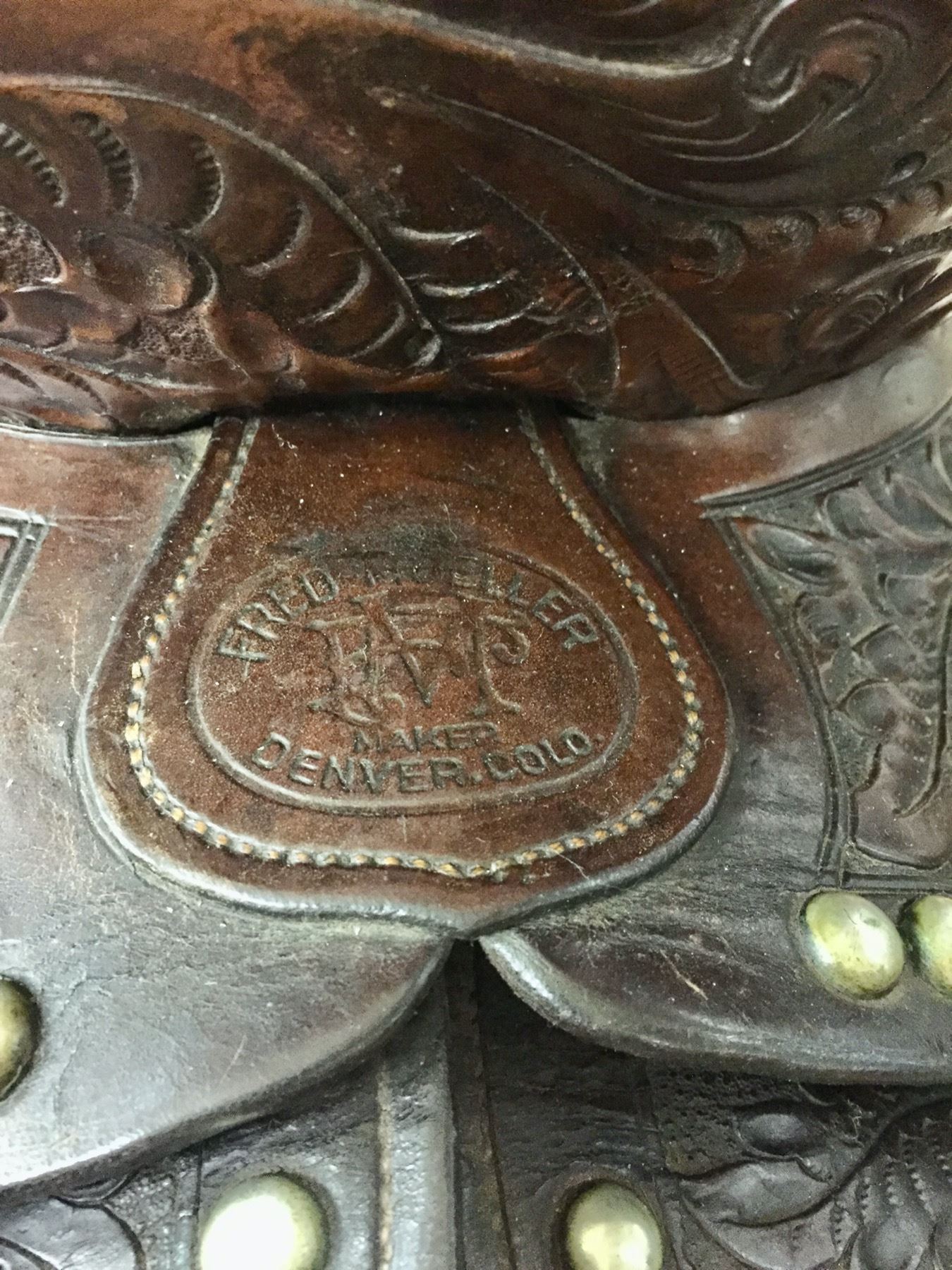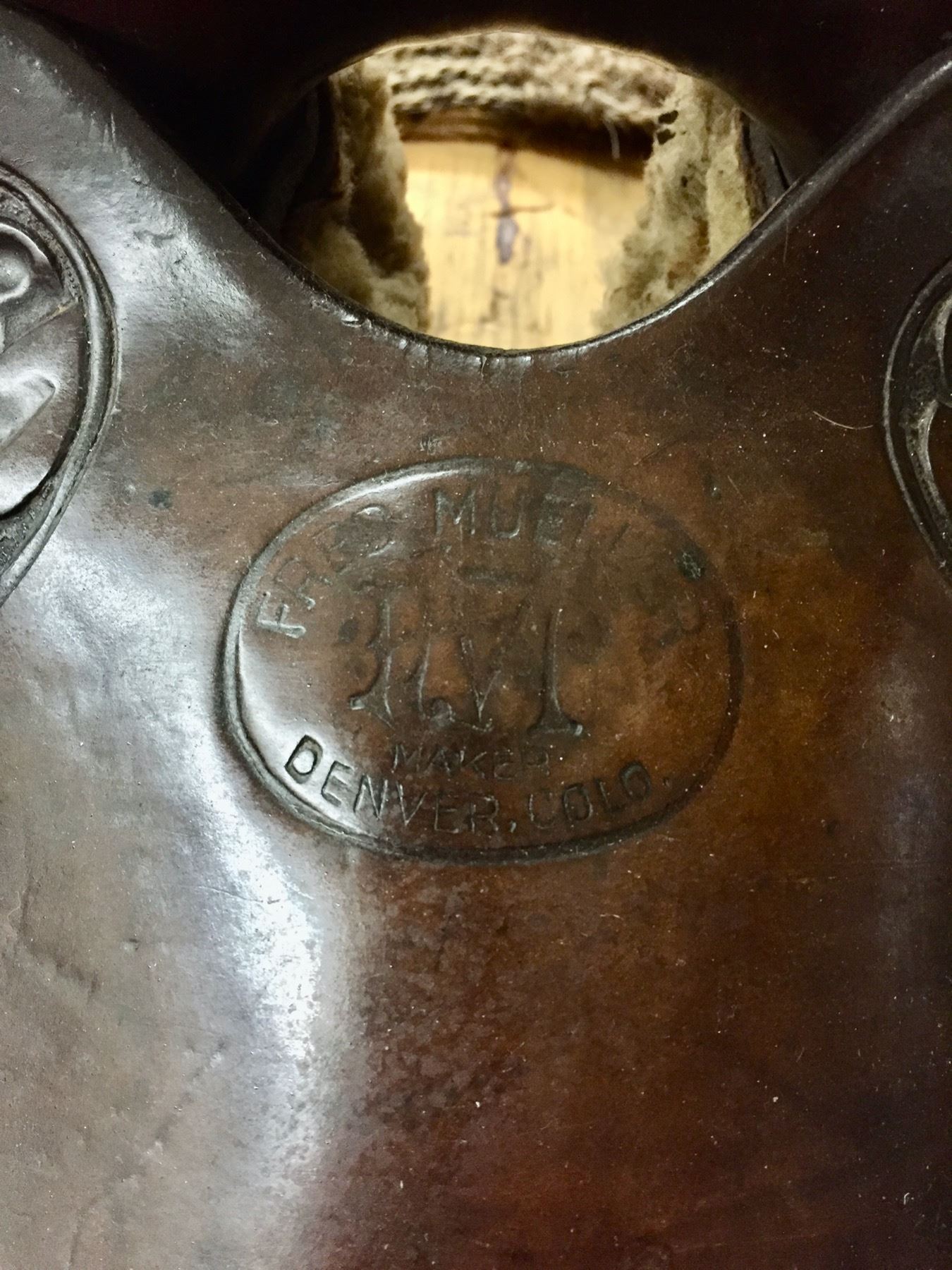Description: For sale in this is lot is a fancy, Fred Mueller saddle and bridle. This fine example has great tooling and studs accenting it. It comes with an old mohair cinch which may or may not be original to the piece, but certainly is of the same time period. The stand can go with it if you can pick it up within a week. We will not ship the stand or hold it for long. Maker: Both the saddle and bridle are well marked by Fred Mueller, Denver Colo.. Approx. Age: Early 1900s. Size: Saddle seat is 14 inches. Condition: Good for their age, normal wear expected. Please look closely at the pictures - they are an important part of our description. Shipping: There will be a $20 handling, packaging fee for shipping this lot. The actual cost of postage will be added on top of that.