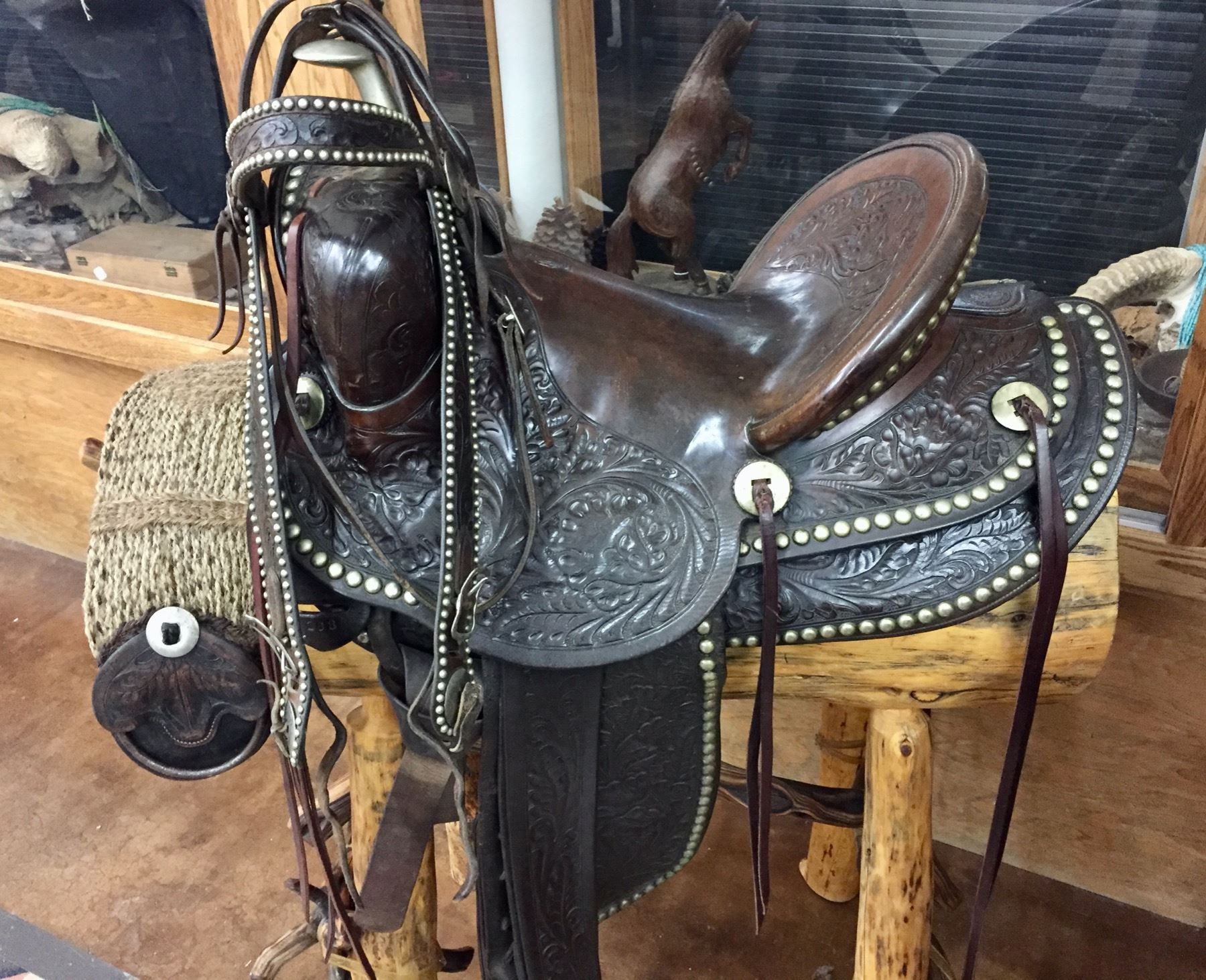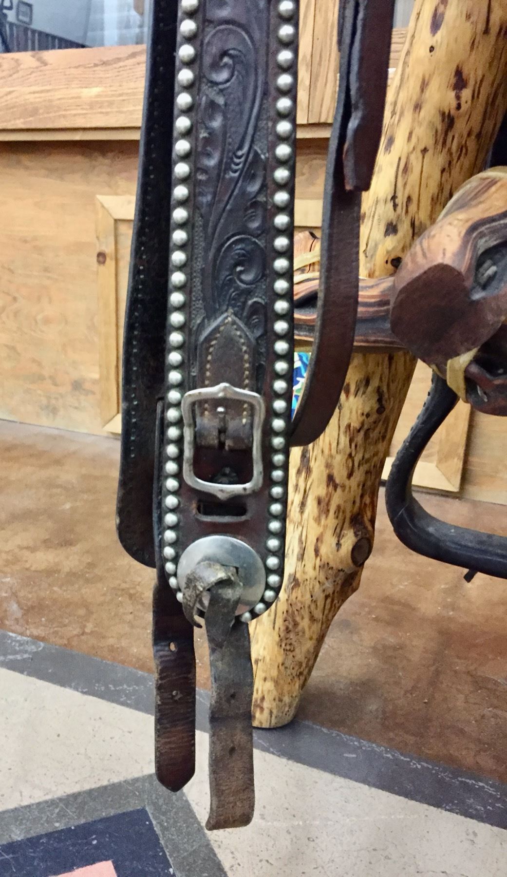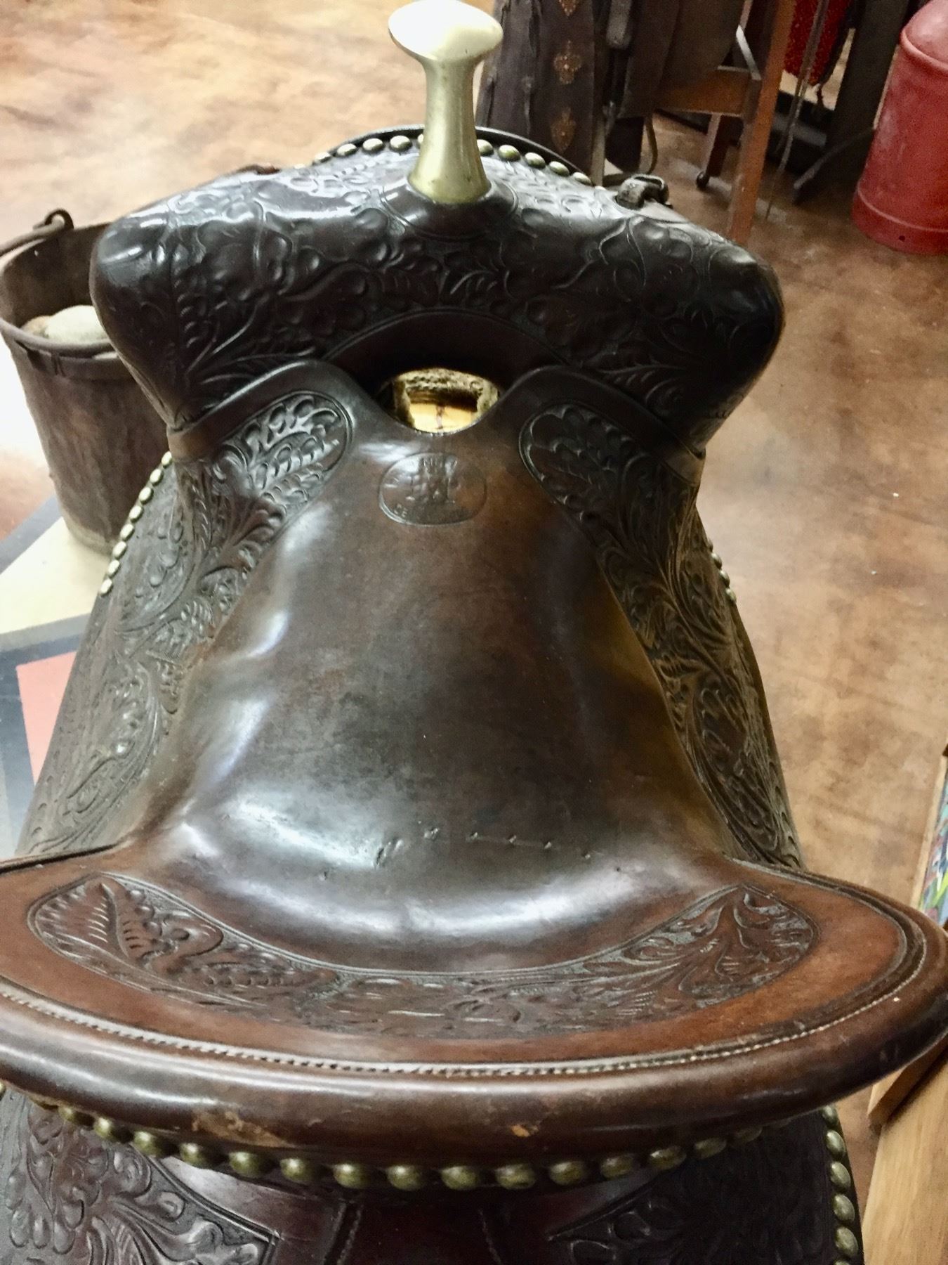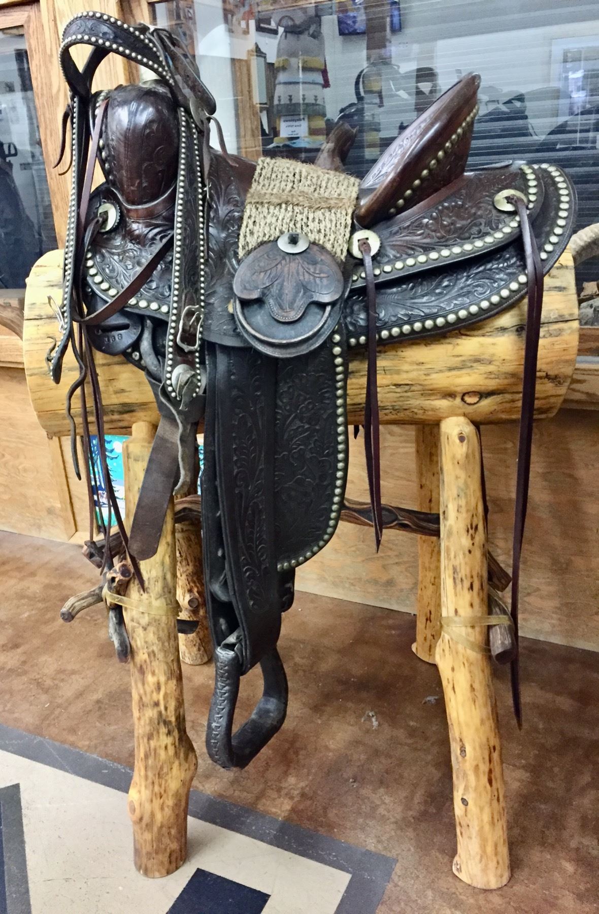 Description: For sale in this is lot is a fancy, Fred Mueller saddle and bridle. This fine example has great tooling and studs accenting it. It comes with an old mohair cinch which may or may not be original to the piece, but certainly is of the same time period. The stand can go with it if you can pick it up within a week. We will not ship the stand or hold it for long. Maker: Both the saddle and bridle are well marked by Fred Mueller, Denver Colo.. Approx. Age: Early 1900s. Size: Saddle seat is 14 inches. Condition: Good for their age, normal wear expected. Please look closely at the pictures - they are an important part of our description. Shipping: There will be a $20 handling, packaging fee for shipping this lot. The actual cost of postage will be added on top of that.
