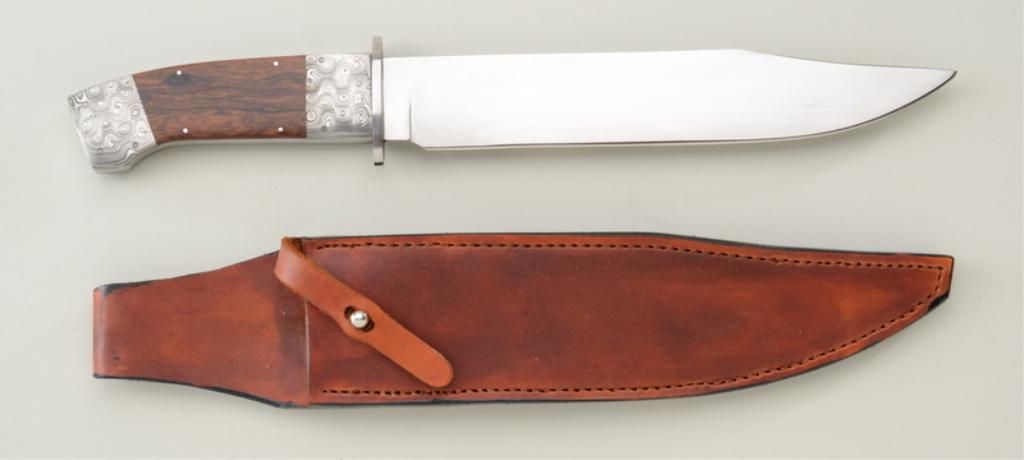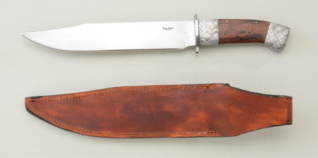 Fancy Gary Biggers, Ventura, CA custom knife with fancy exotic wood and meteorite-style mounts in like new condition with leather sheath, approx. 14” overall with an approx. 9” blade. Est.: $500-$1,000.