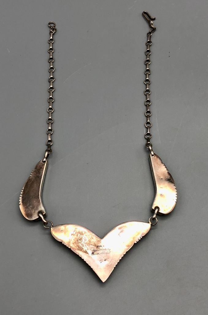 Offered for sale in this lot is a fancy inlay necklace and earring set by Oscar Alxius. It is set with high grade turquoise, lapis, coral and white shell. This is a gorgeous set with matching earrings, perfect to layer or wear alone. Stamped as sterling silver. MAKER: Hallmarked Handmade Oscar Alxius, (1949-; Navajo). Active since the 1970s. APPROX AGE: Fairly modern. SIZE: Necklace fits 14 inch neck. Earrings are 1-1/2 inches long X 5/8 inches wide. Combined weight is 64.4 grams. CONDITION: Good for its age, normal wear expected. Please look closely at the pictures as they are an important part of our description and are hereby incorporated into the description, specifically with regards to condition. SHIPPING: There will be a $5 handling / packaging fee for shipping this lot. The actual cost of postage will be added on top of that. BUY IT NOW: If you would like to buy this item now, without waiting for the auction day to bid on it, we do offer this option (which is available up to 48 hours before the actual auction starts). The “Buy it Now” price is the high estimate of this lot (plus applicable fees and the Buyer's premium is discounted to 10% when using the Buy it Now option). If you would like to exercise this option, you must contact us by email (or phone as long as you talk to someone live). Reference this lot number and your intention to "Buy it Now."