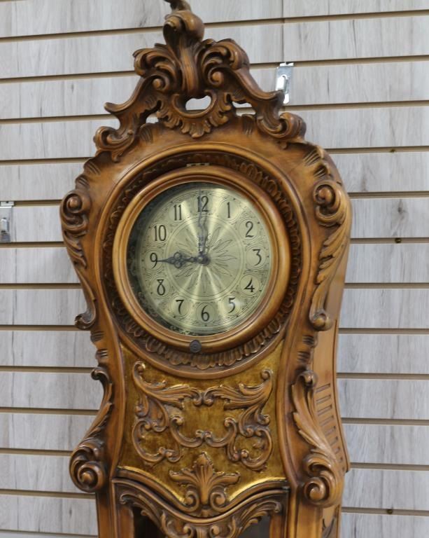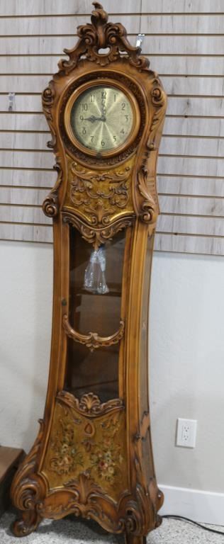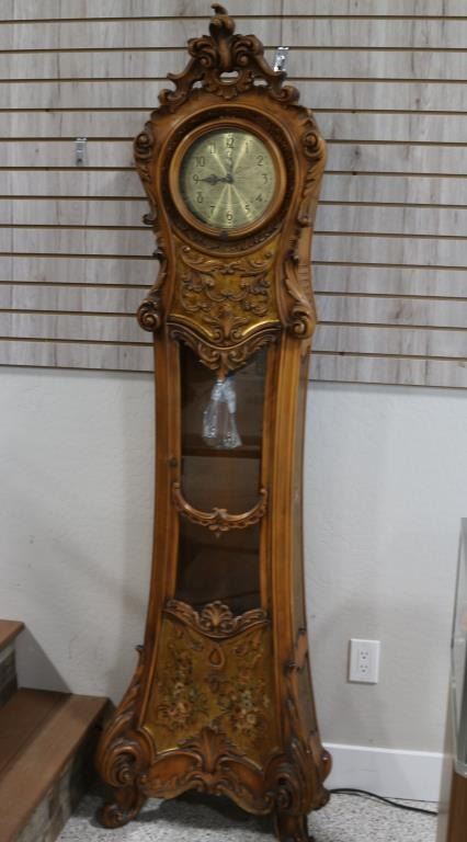 Reproduction, maple case, handpainted with floral motif and gold details. 80" tall, 22" wide, 12" deep. In working condition. **Shipping must be arranged by buyer or local pickup only.**
