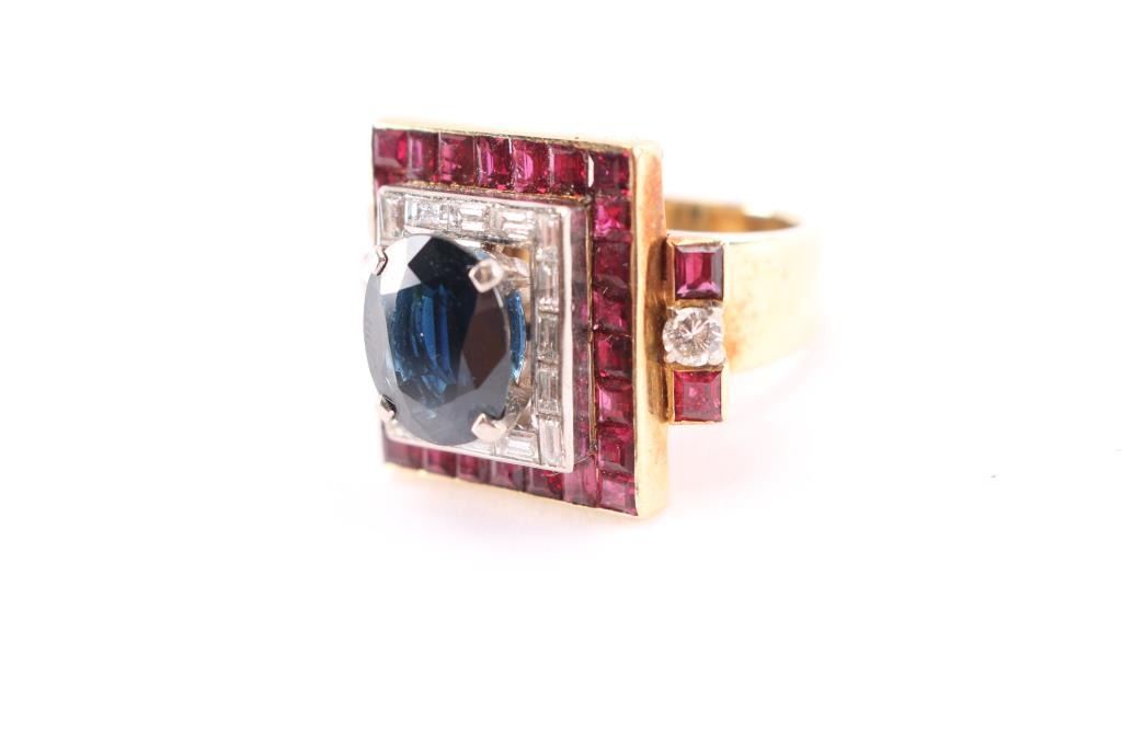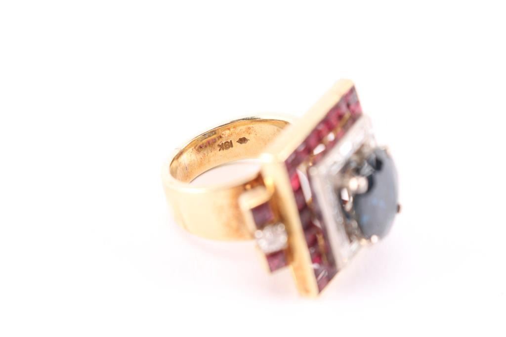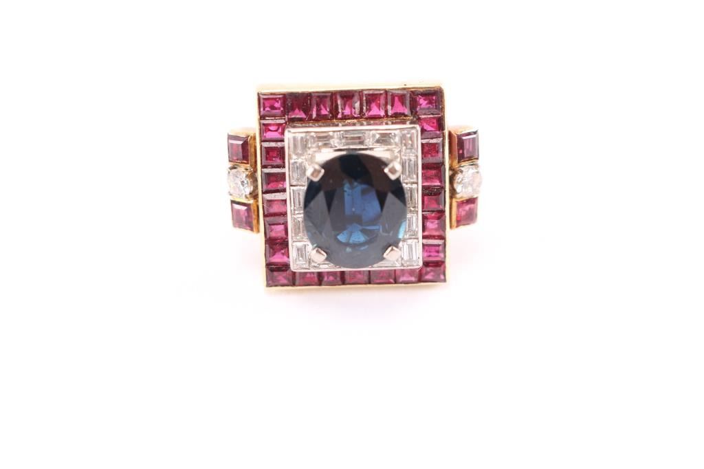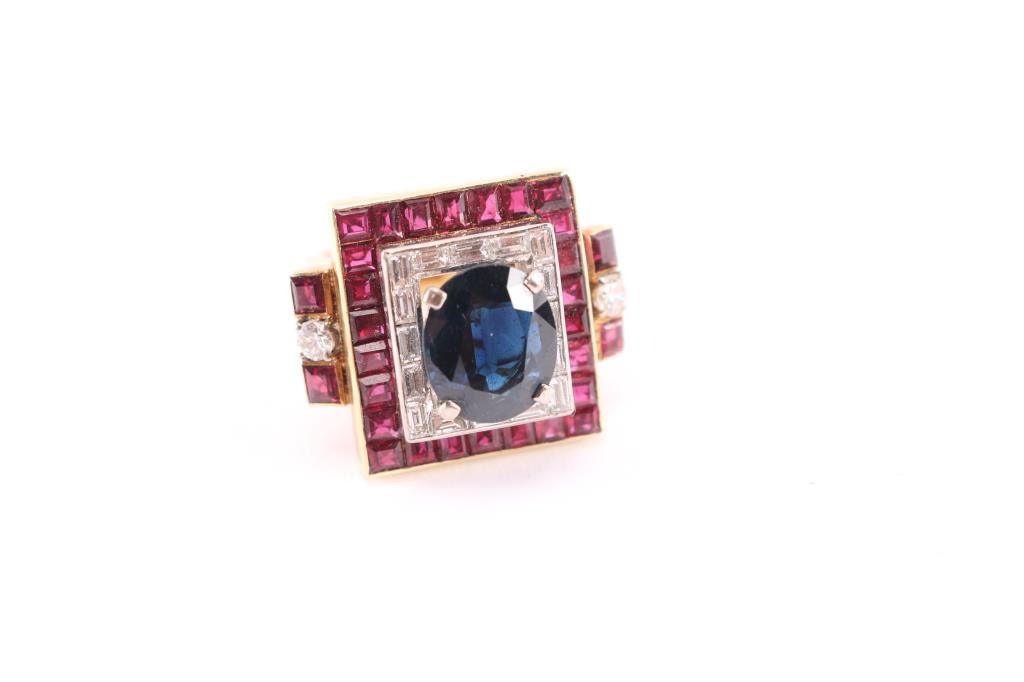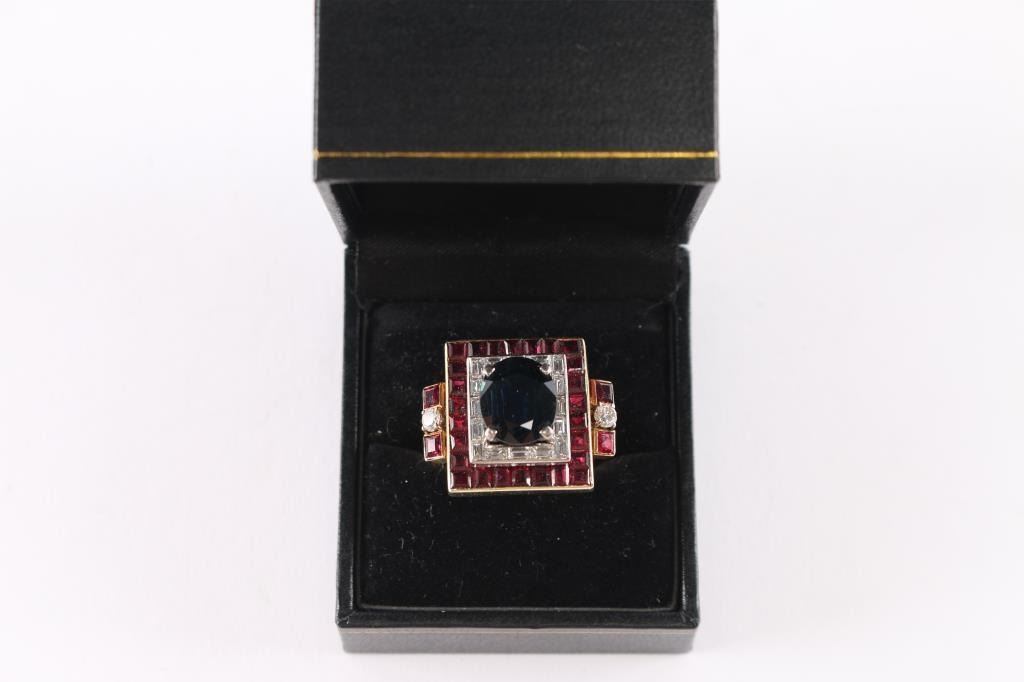 Features a oval cut center 3ct Sapphire,surrounded by Rubies & Diamonds set in 18K yellow Gold Ring Size 6.