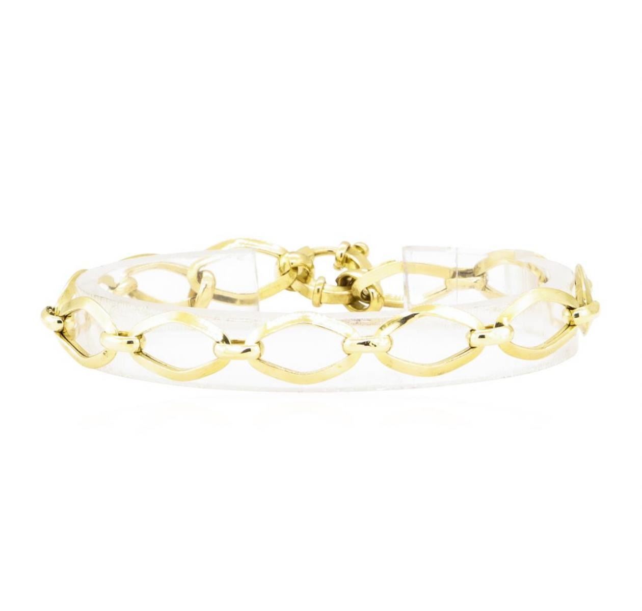 One fancy link bracelet measuring approximately seven and a half inches in length and 9mm in width featuring: 18KT yellow gold weighing 6.3 grams.