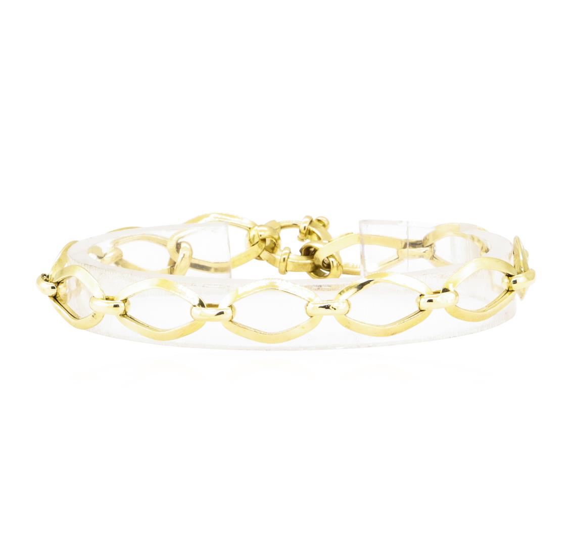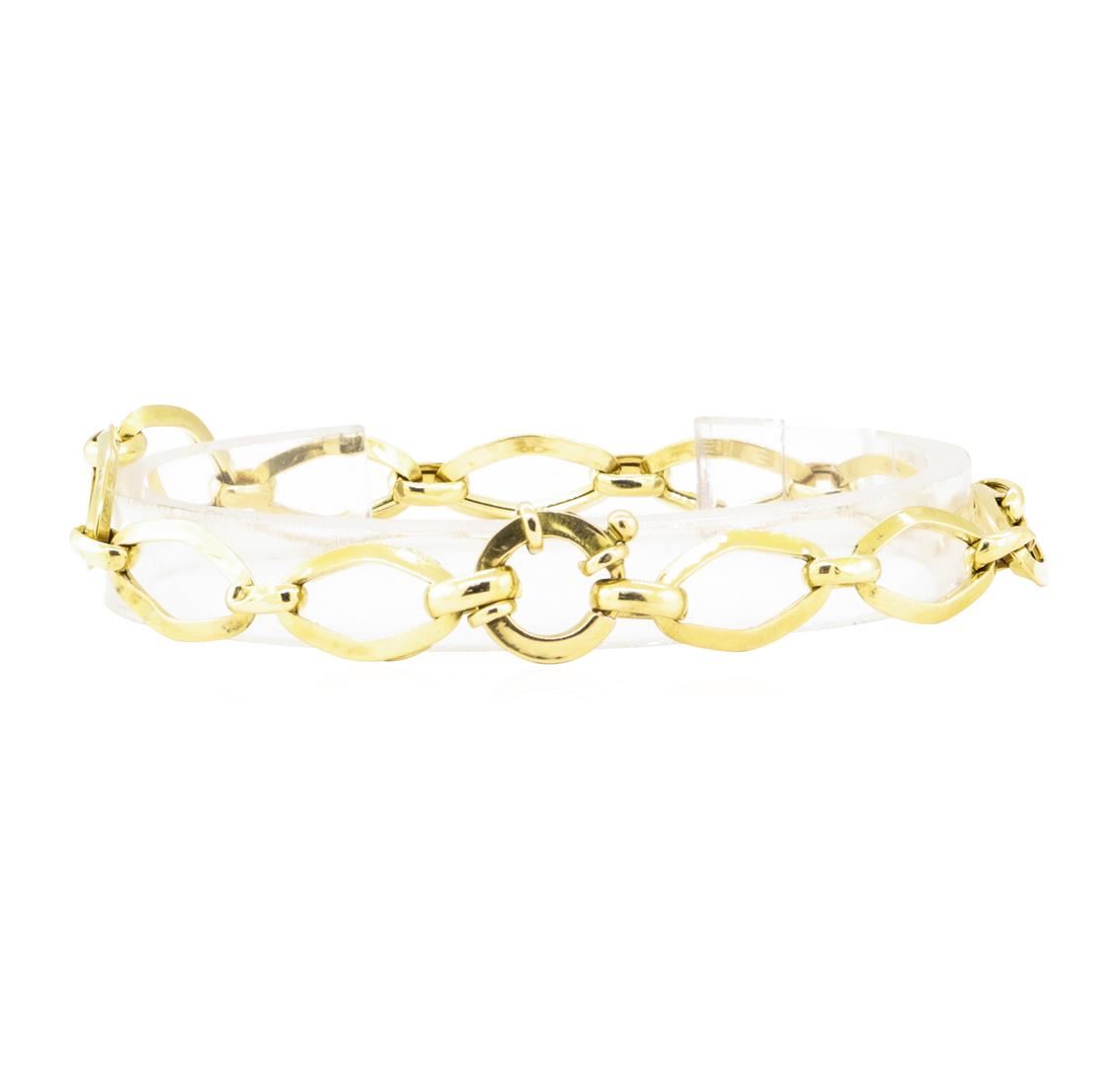 One fancy link bracelet measuring approximately seven and a half inches in length and 9mm in width featuring: 18KT yellow gold weighing 6.3 grams.
