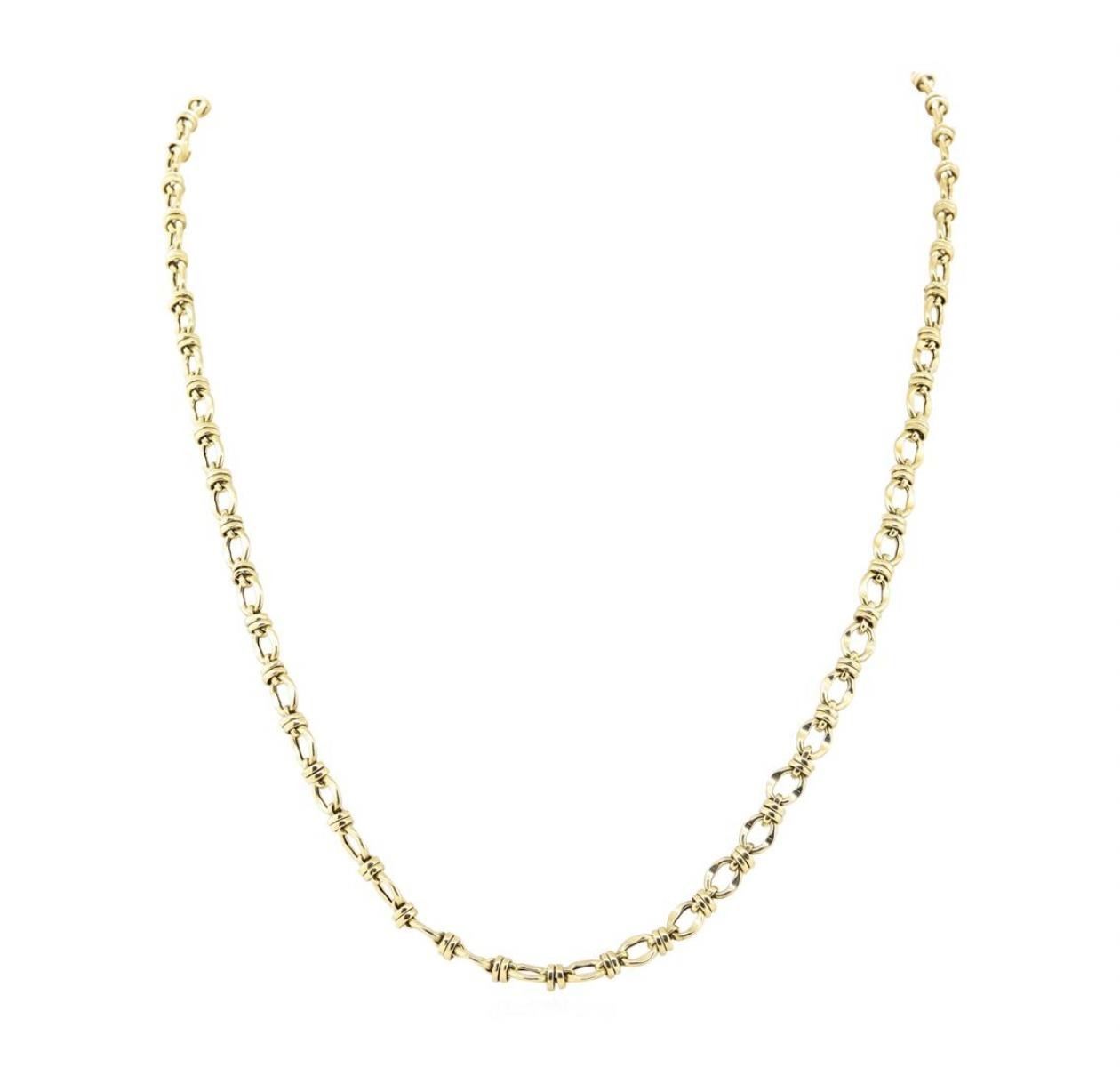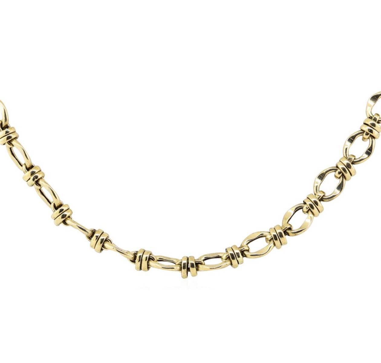 One fancy link chain necklace featuring: 14KT yellow gold weighing 13.7 grams. The necklaces measures twenty-four inches in length.
