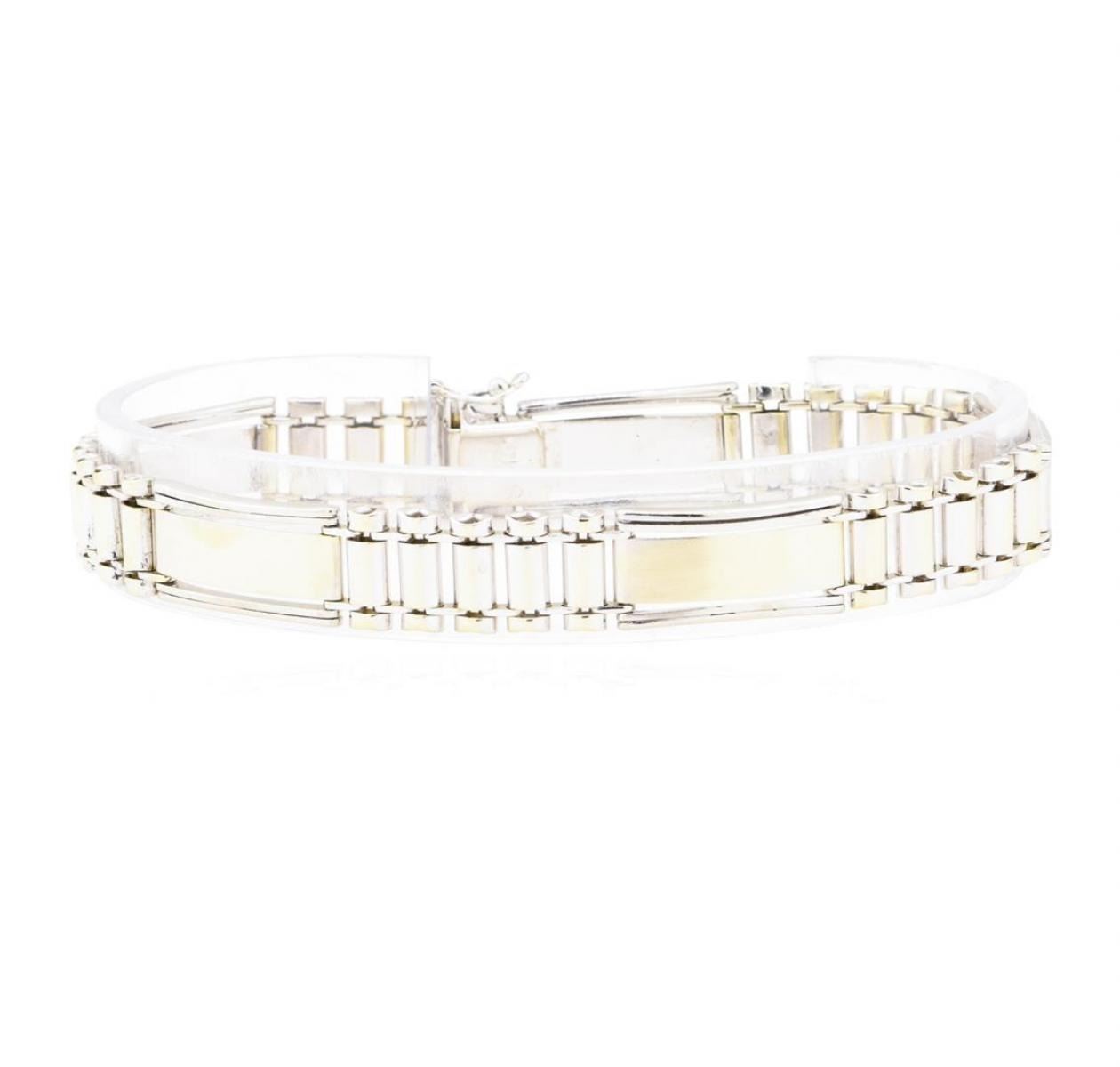 One men's fancy link bracelet measuring approximately eight inches in length and 10.5mm in width featuring: 14KT yellow and white gold weighing 23.0 grams.