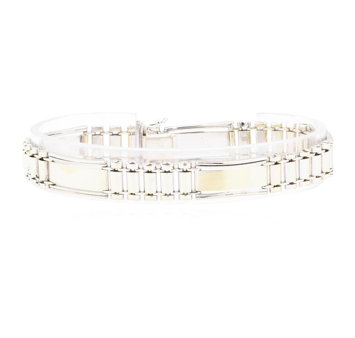 One men's fancy link bracelet measuring approximately eight inches in length and 10.5mm in width featuring: 14KT yellow and white gold weighing 23.0 grams.