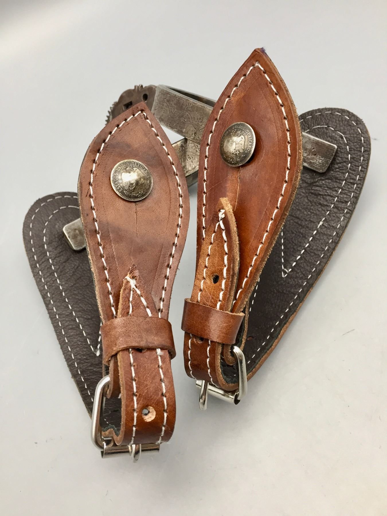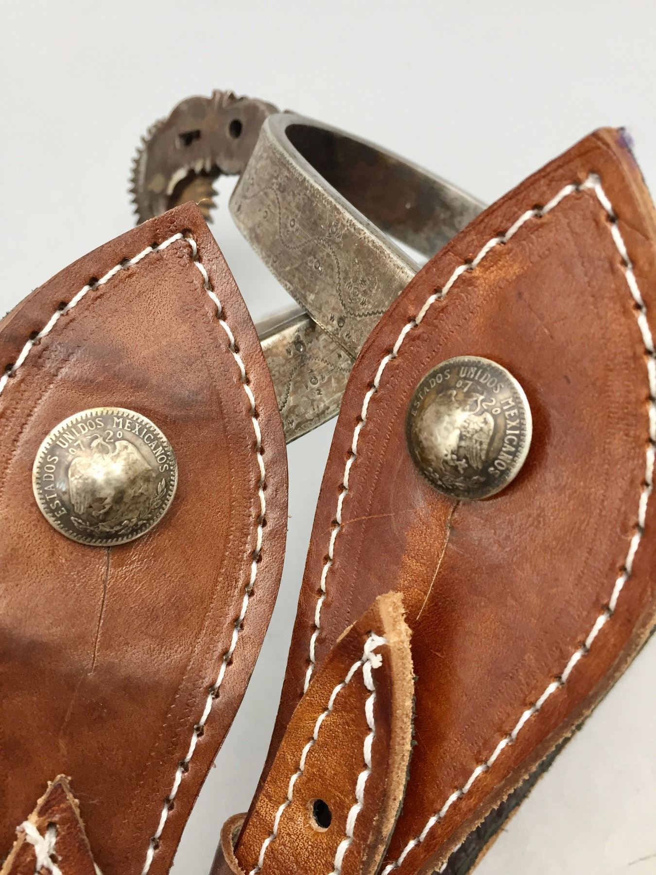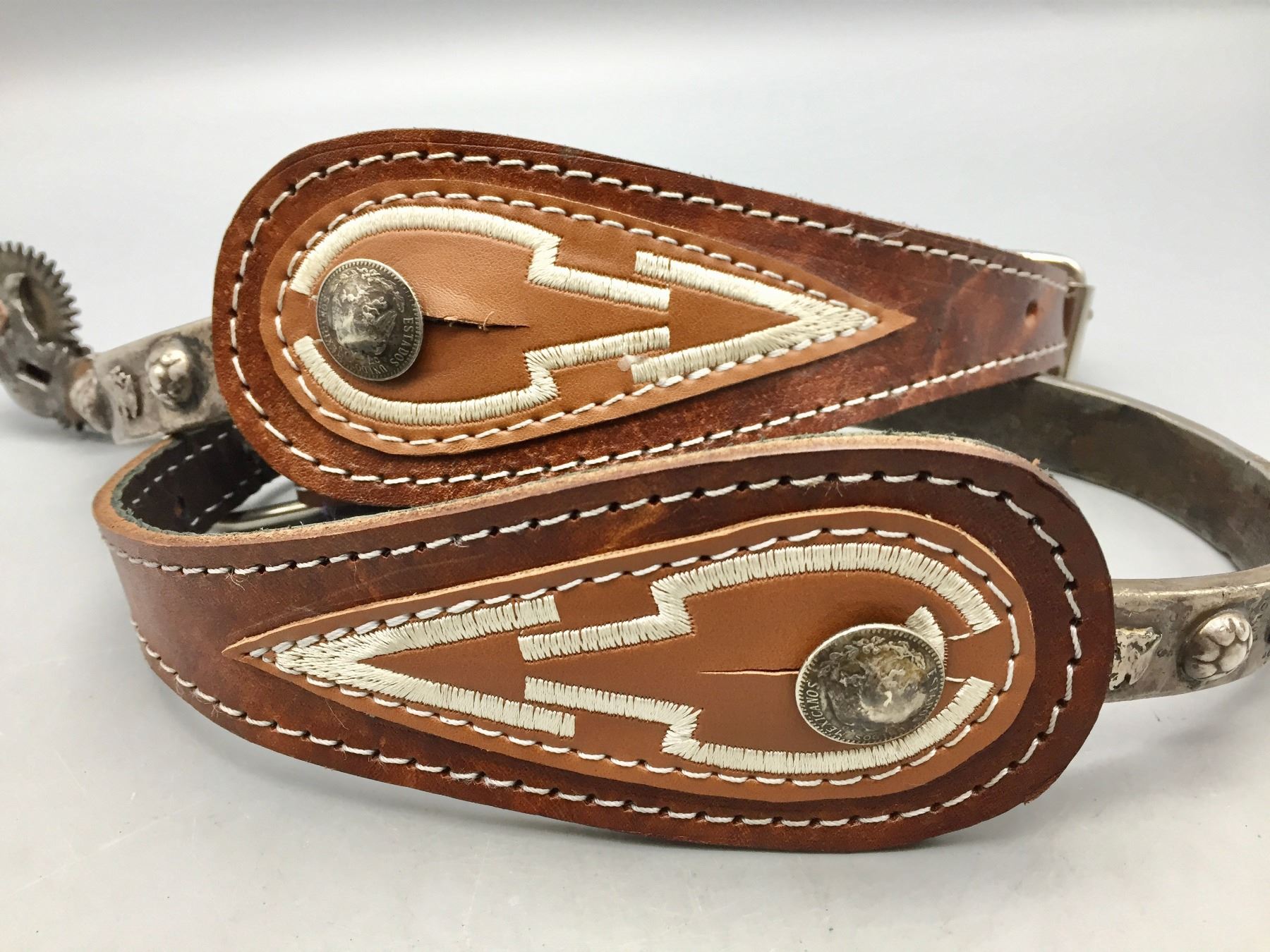 Description: Offered for your bidding pleasure is this pair of fancy, hand forged, Mexican spurs featuring nice designs and great leather spur straps. Maker: Unknown. Approx. Age: Vintage. Size: Heel measures 3-1/8”. Shank measures 2”. Condition: Good for their age, normal wear expected. Please look closely at the pictures - they are an important part of our description. Shipping: There will be a $5 handling / packaging fee for shipping this lot. The actual cost of postage will be added on top of that.