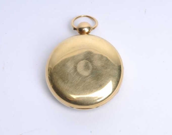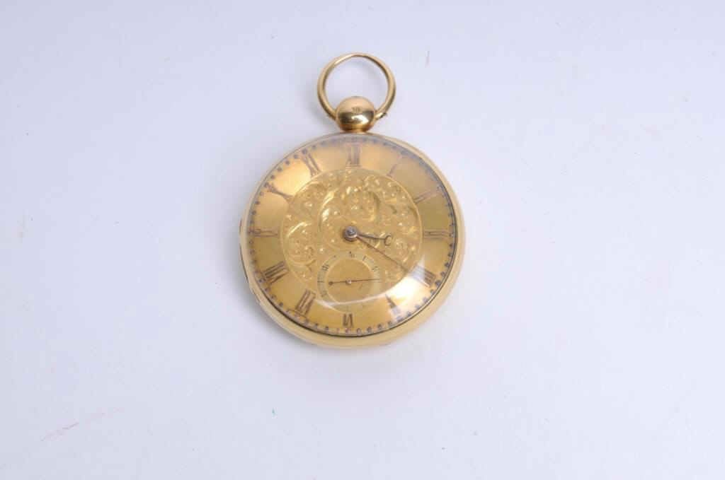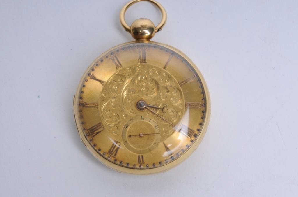 Fancy Mid-19th century English pocket watch in 18K gold. Hallmarked case with “W.F.” initials and fancy engraved face. Working condition unknown as no key available. Crystal detached. Est.: $500-$600 gold value alone. Est.: $600-$1200