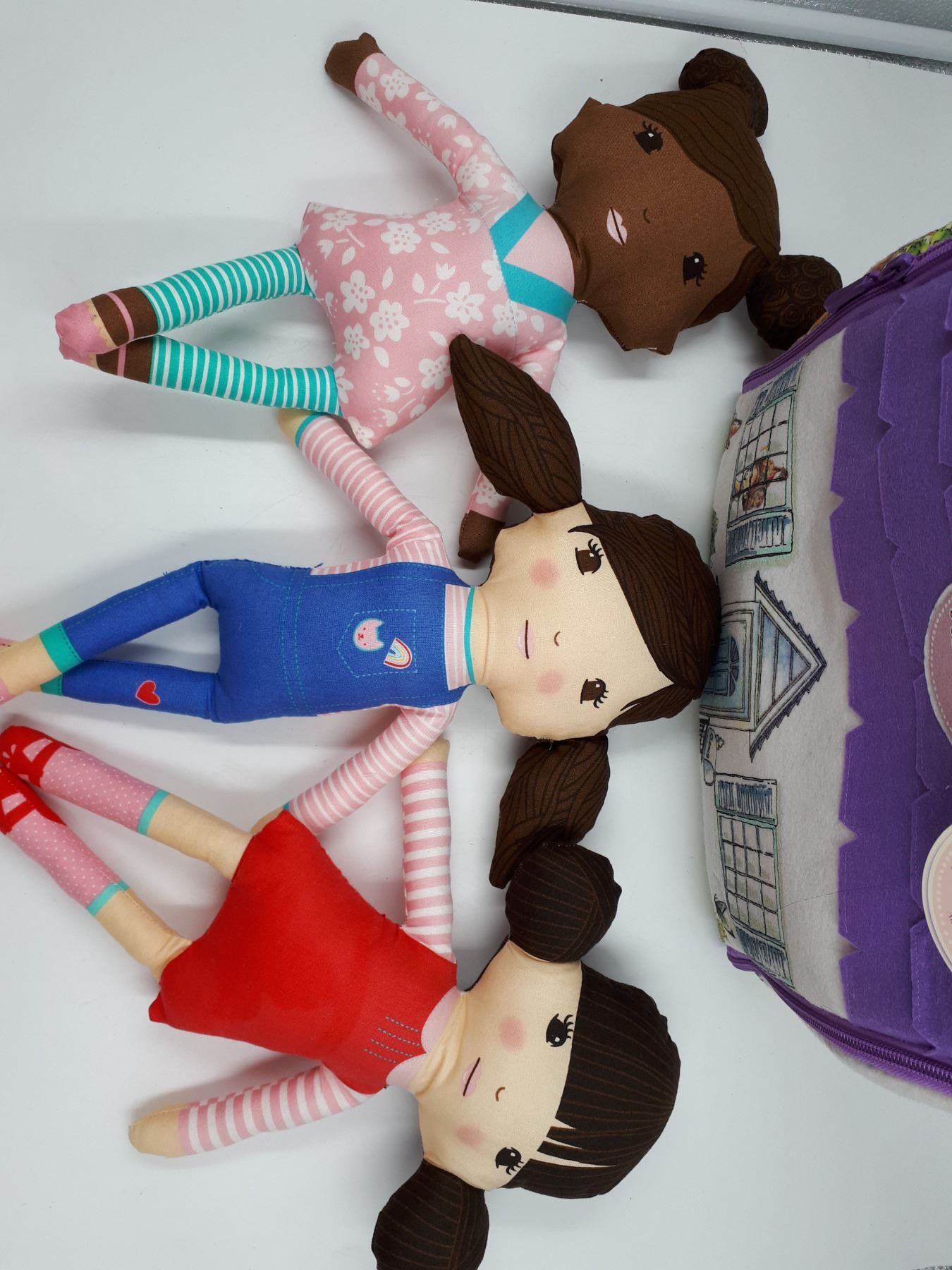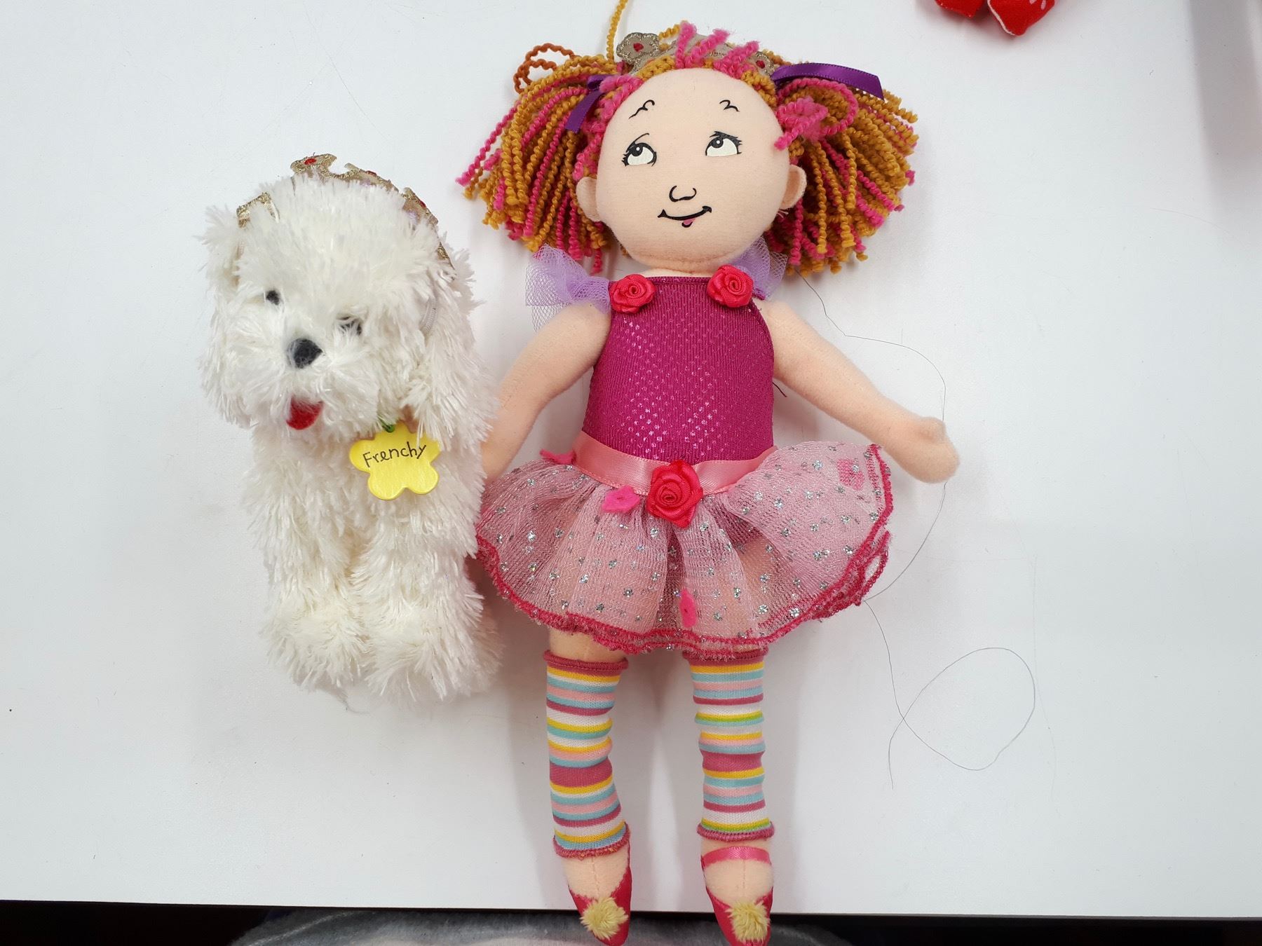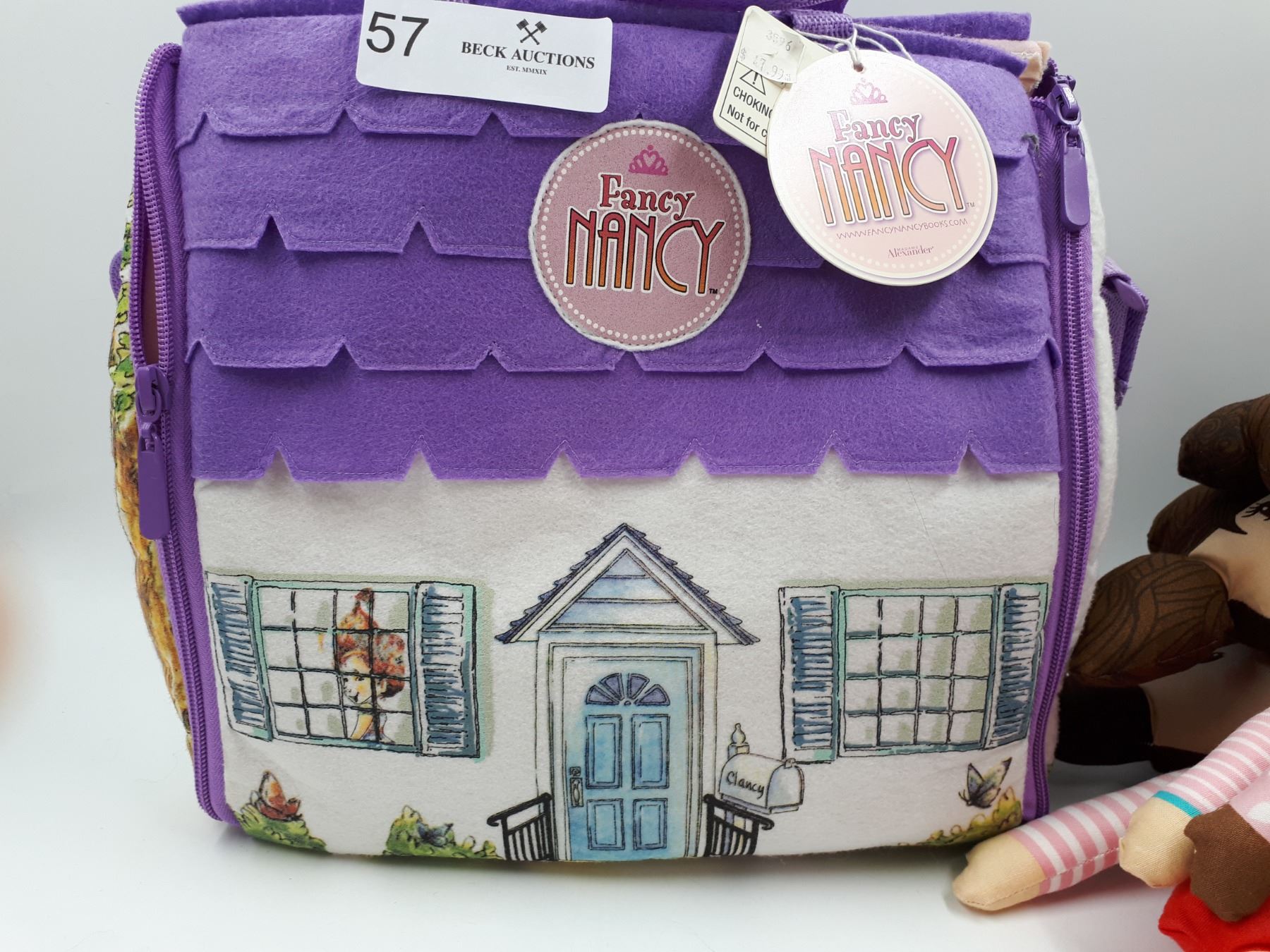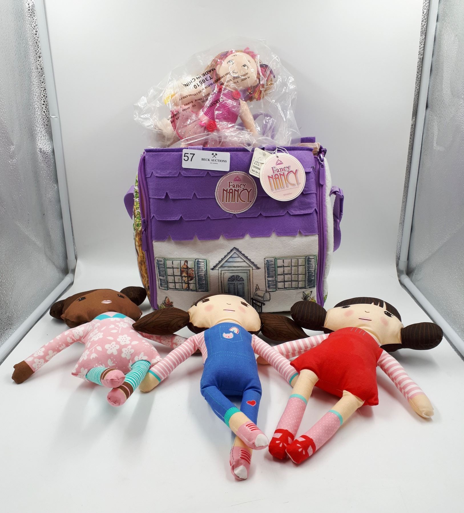 Fancy Nancy tote new with tag. Includes 4 dolls plus dog plush. Tote is 12 x 12 inches.