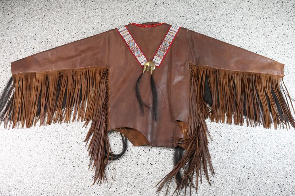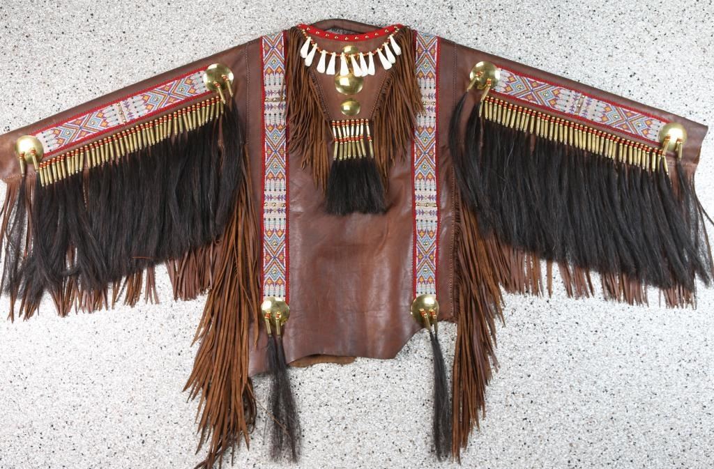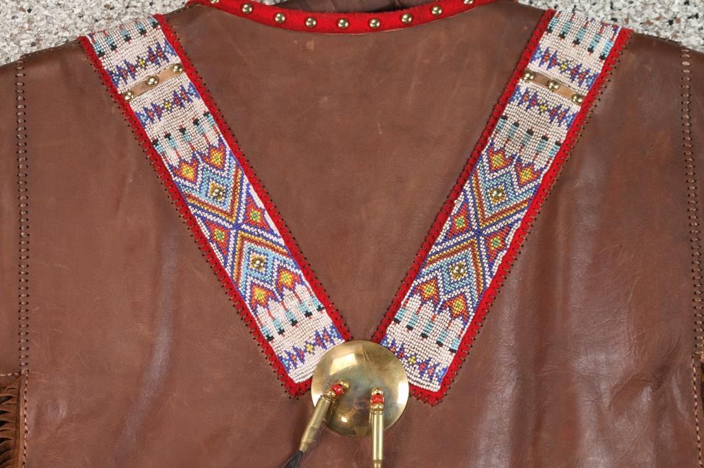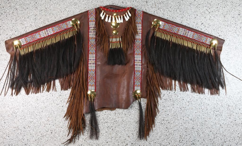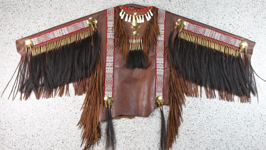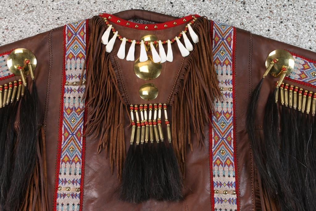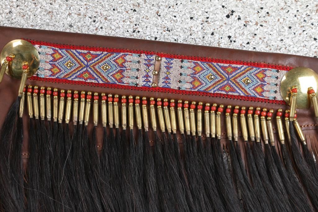 Measures 71" across hanger and 32" in length. Made of brown leather with intricate beadwork on straps and brass medalions, rifle cartridges with horsehair, leather fringe and an attached necklace made of elk teeth.