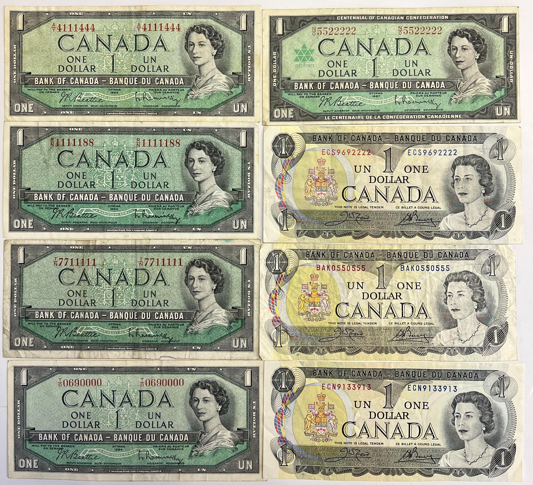 Fancy Numbers; 1954 & 1973 $1's Lot of 8 notes VF or better.