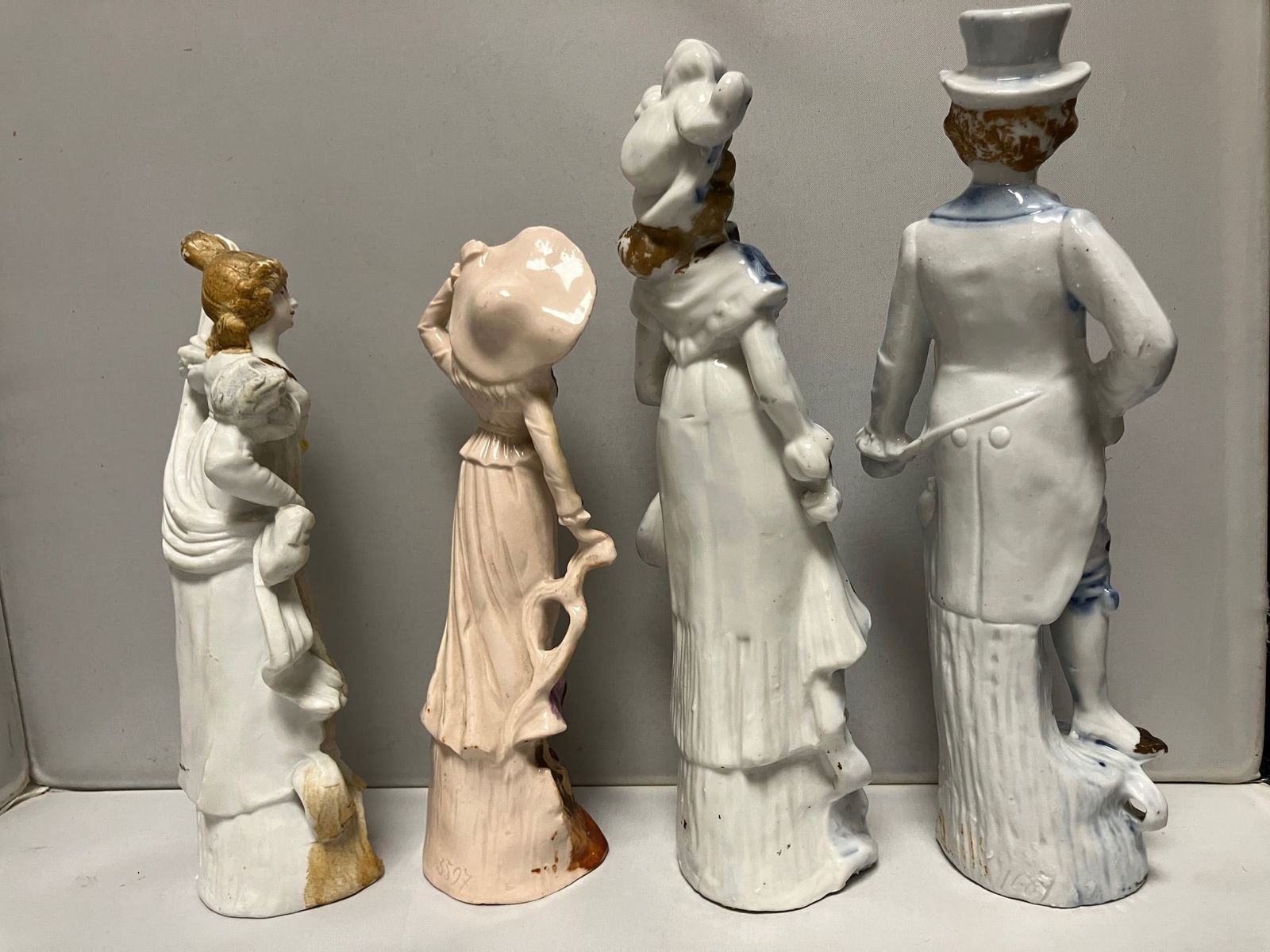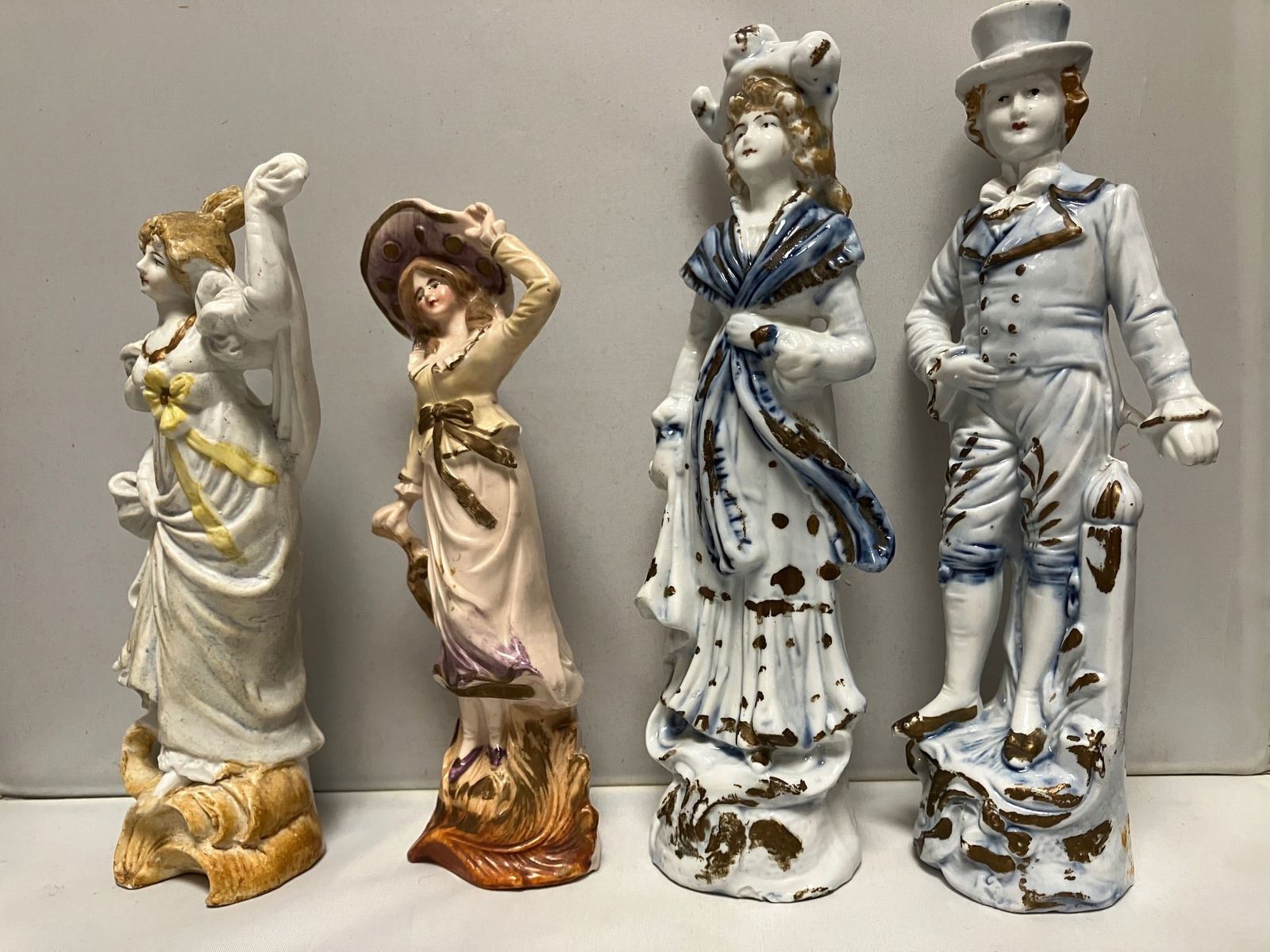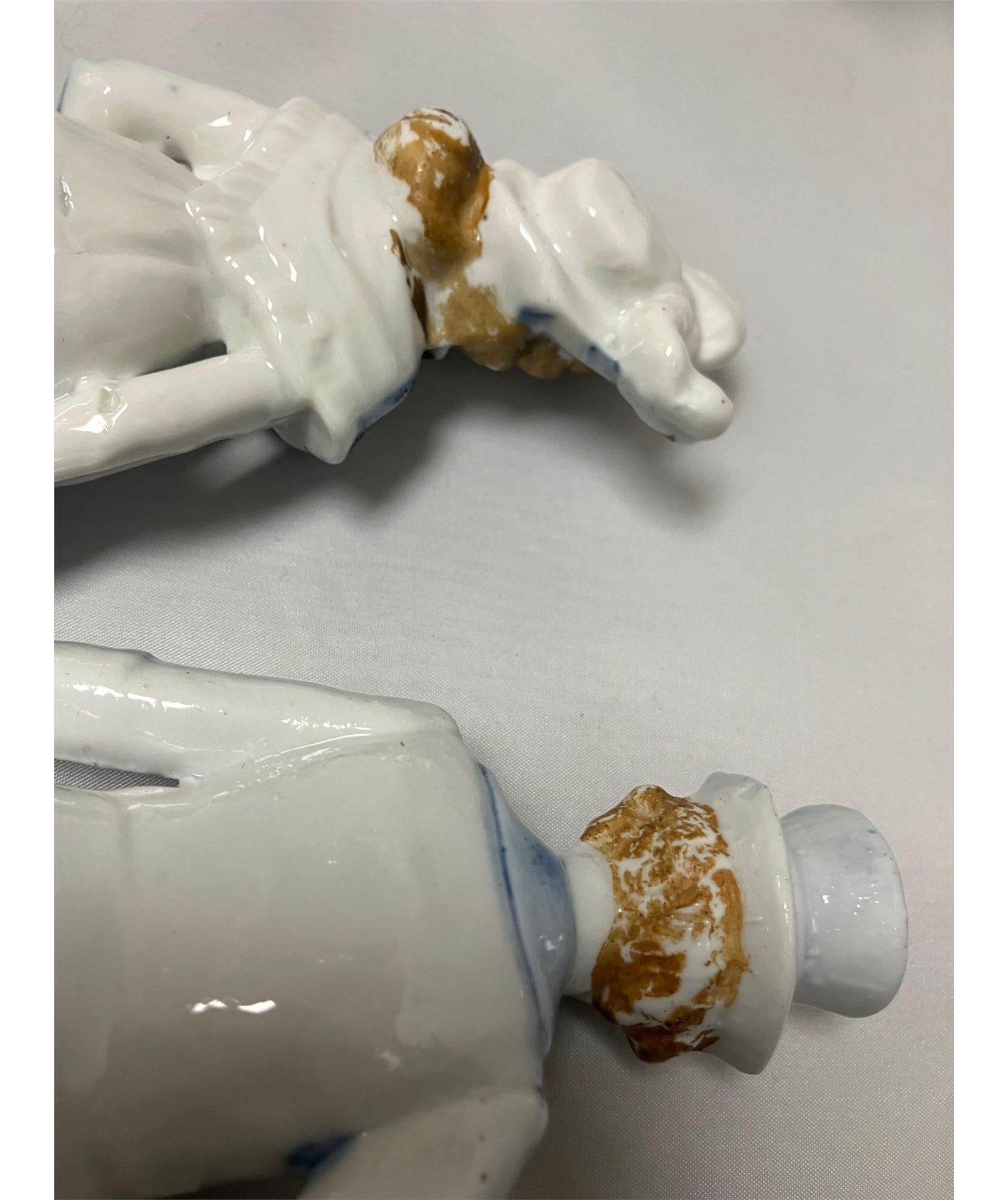 A blue and white porcelain pair man and woman in fine attire, a porcelain woman holding her hat, and a bisque woman with arm in the air. Condition as seen in photos, some paint loss as these have age. Tallest approx 10"H.