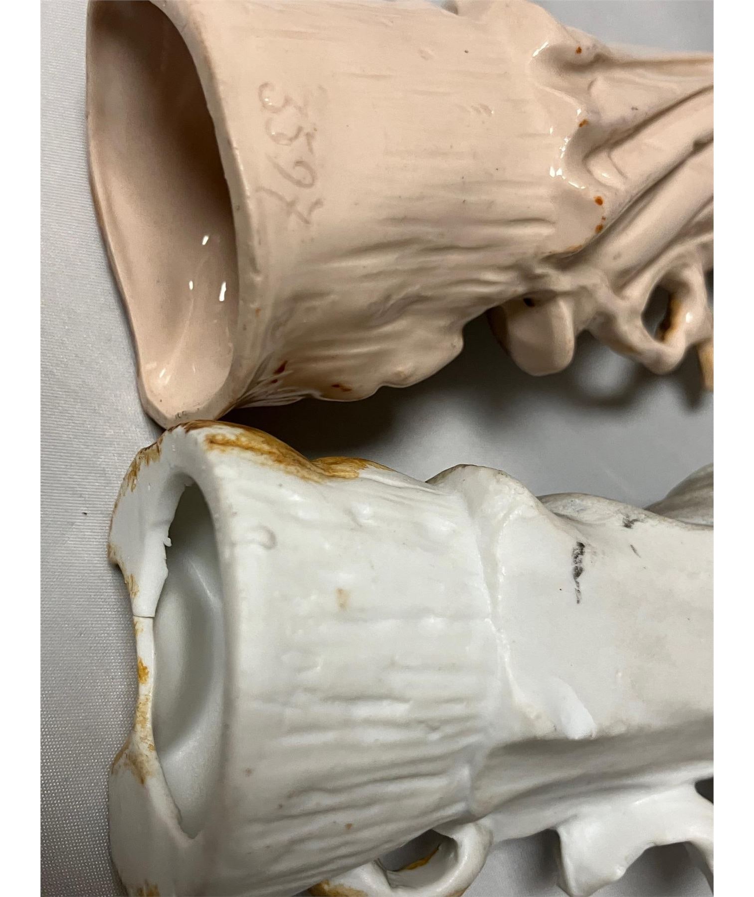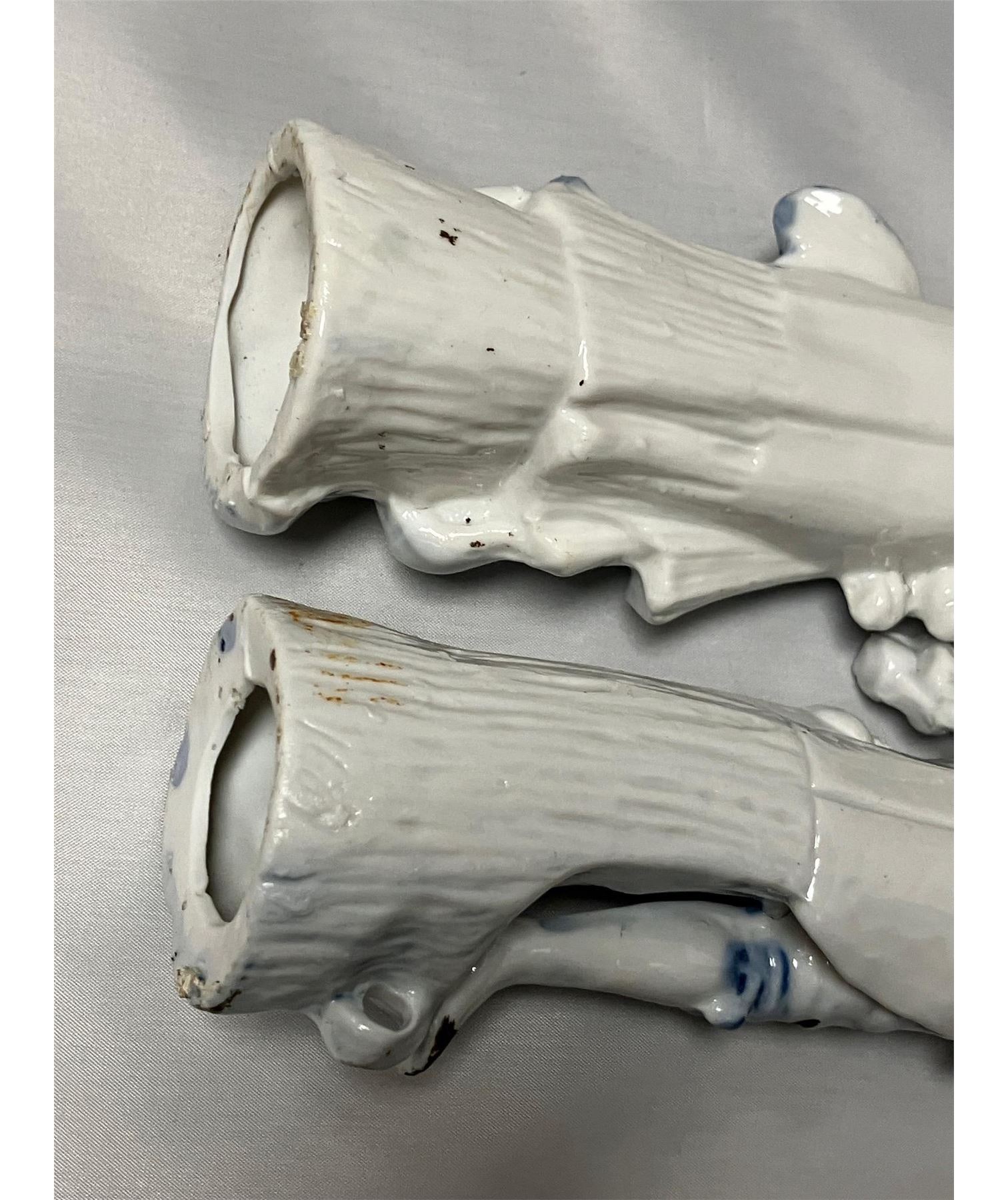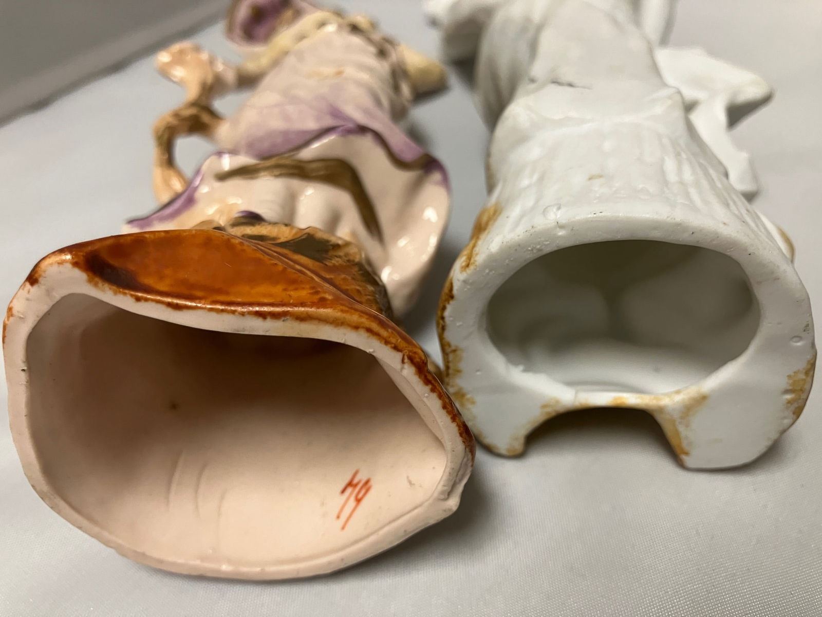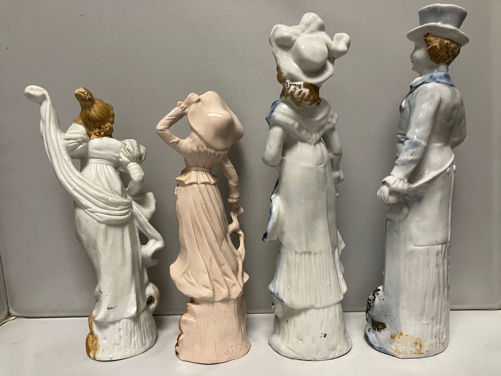 A blue and white porcelain pair man and woman in fine attire, a porcelain woman holding her hat, and a bisque woman with arm in the air. Condition as seen in photos, some paint loss as these have age. Tallest approx 10"H.