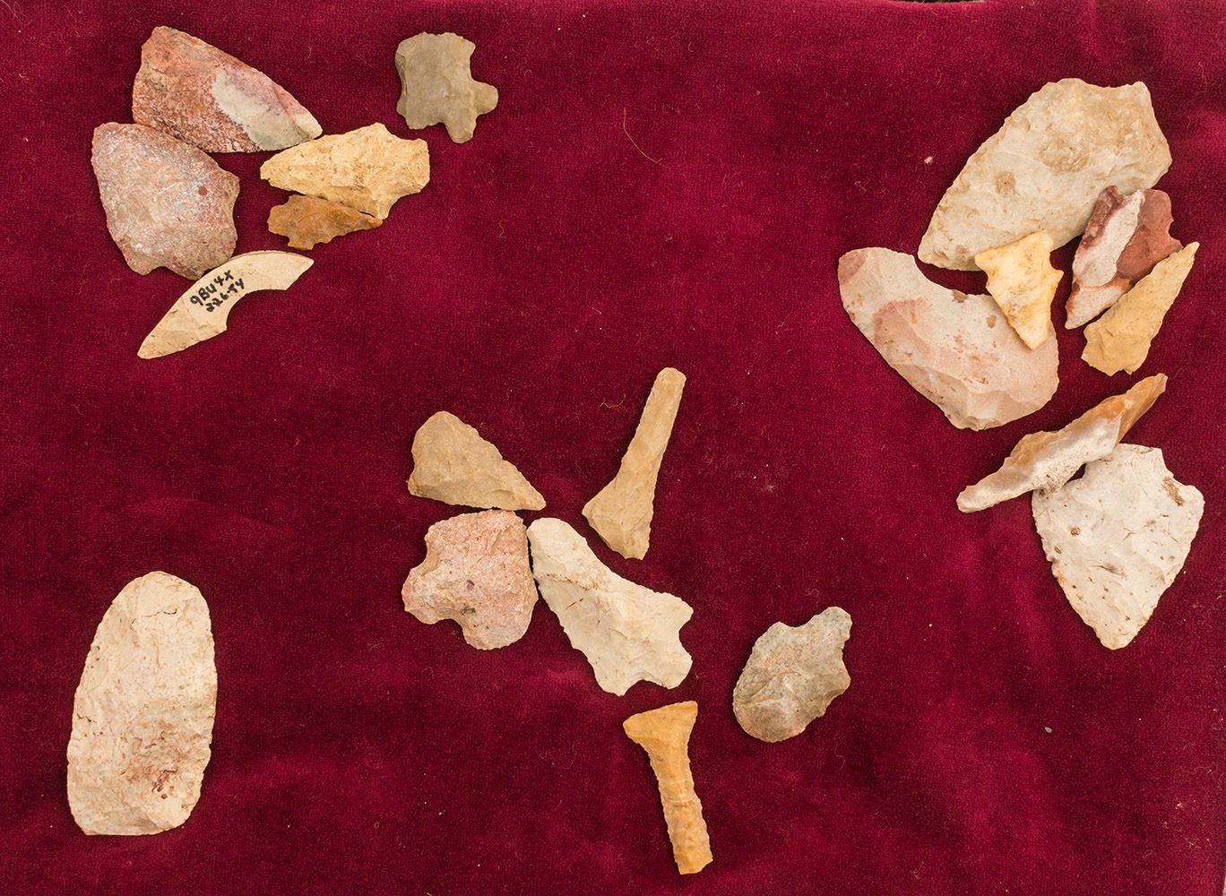 This group of approximately 25 points were hand selected by Mrs. Bradley for mounting. They include larger projectile points up to 3 1/2 inches, two drills and other uniquely shaped points. This is a very nice group, probably much older in origin than some of the obsidian points. From the Chattahoochee River near Roswell Georgia