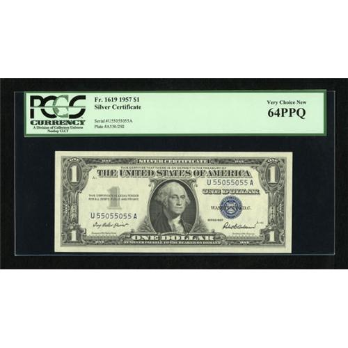 <B>Fancy Serial Number Fr. 1619 $1 1957 Silver Certificate. PCGS Very Choice New 64PPQ.</B></I><BR> This U-A block note has fancy serial number 55055055.<BR><BR><b>Shipping:</b> Coins & Currency (<a target="_blank" href="http://www.heritageauctions.com/common/shipping.php">view shipping information</a>)