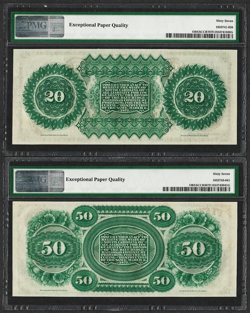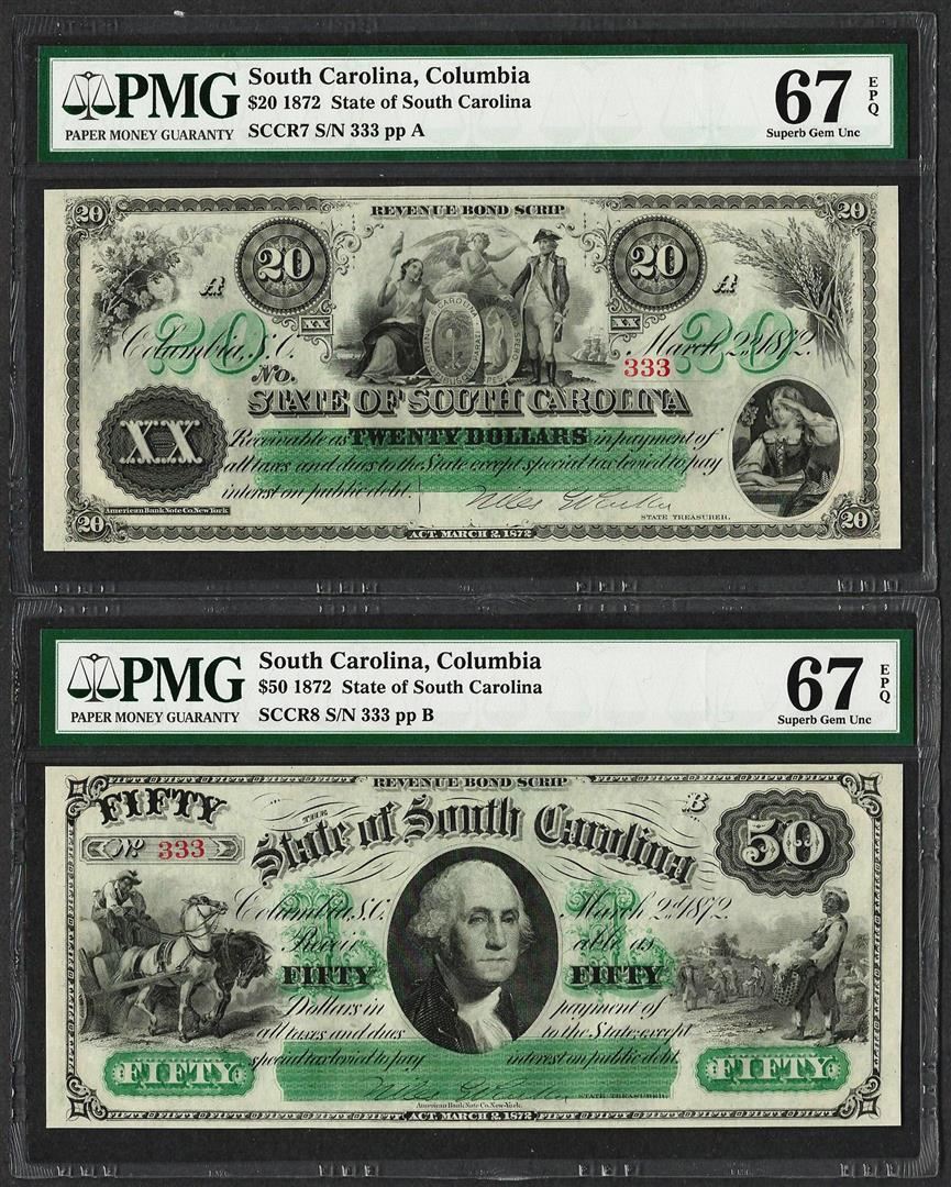One Fancy Serial Pair 1872 $20 & $50 South Carolina Obsolete Notes PMG Superb Gem Unc 67EPQ. PMG Certified.