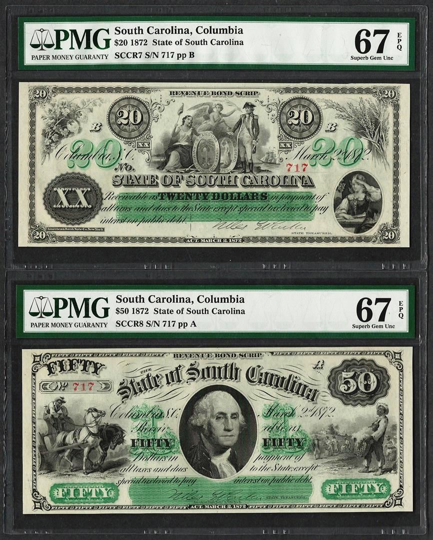 One Fancy Serial Pair 1872 $20 & $50 South Carolina Obsolete Notes PMG Superb Gem Unc 67EPQ. PMG Certified.