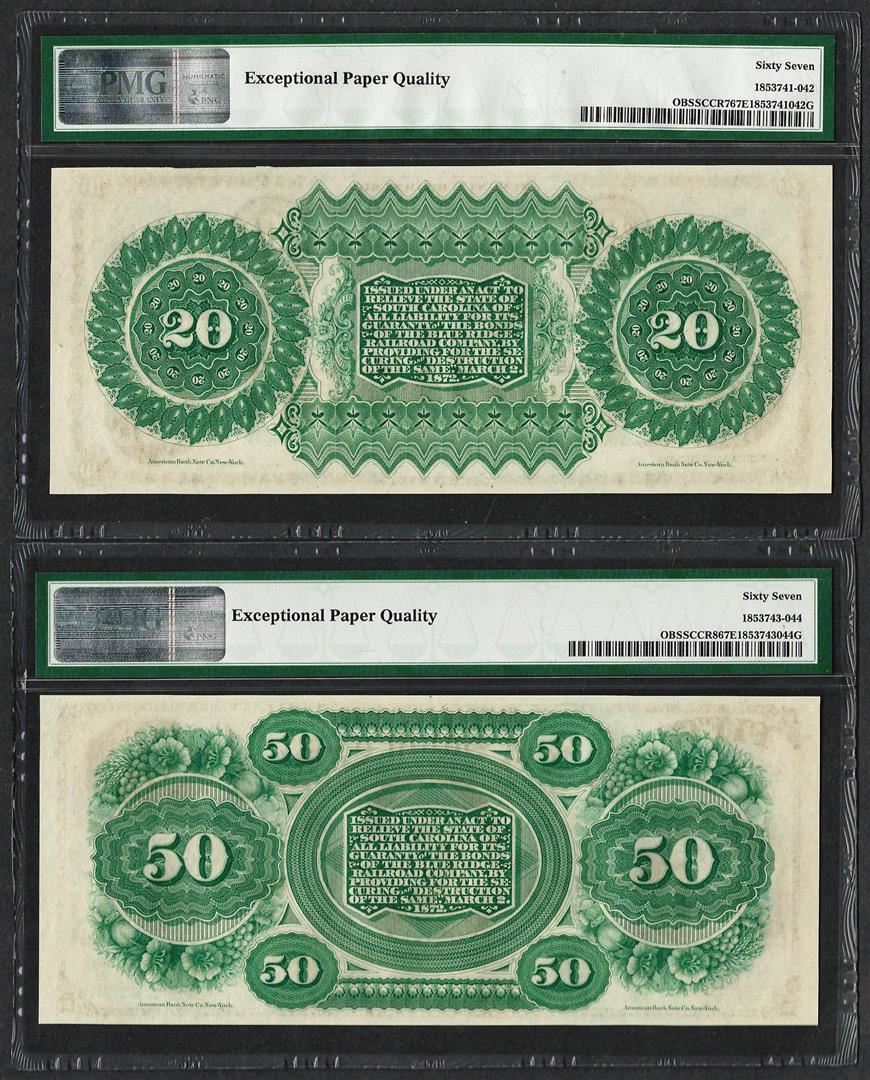 One Fancy Serial Pair 1872 $20 & $50 South Carolina Obsolete Notes PMG Superb Gem Unc 67EPQ. PMG Certified.