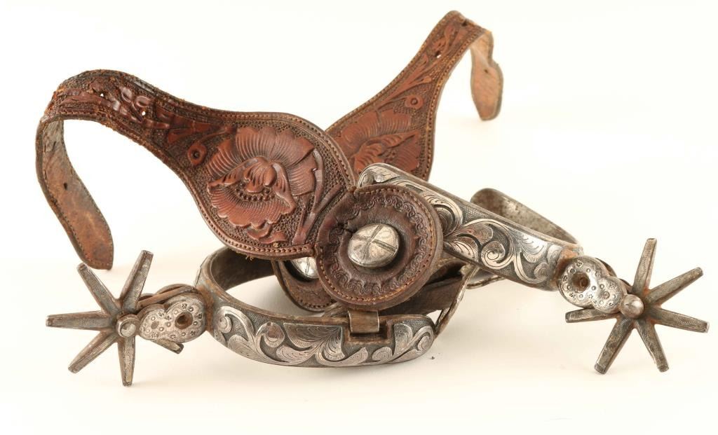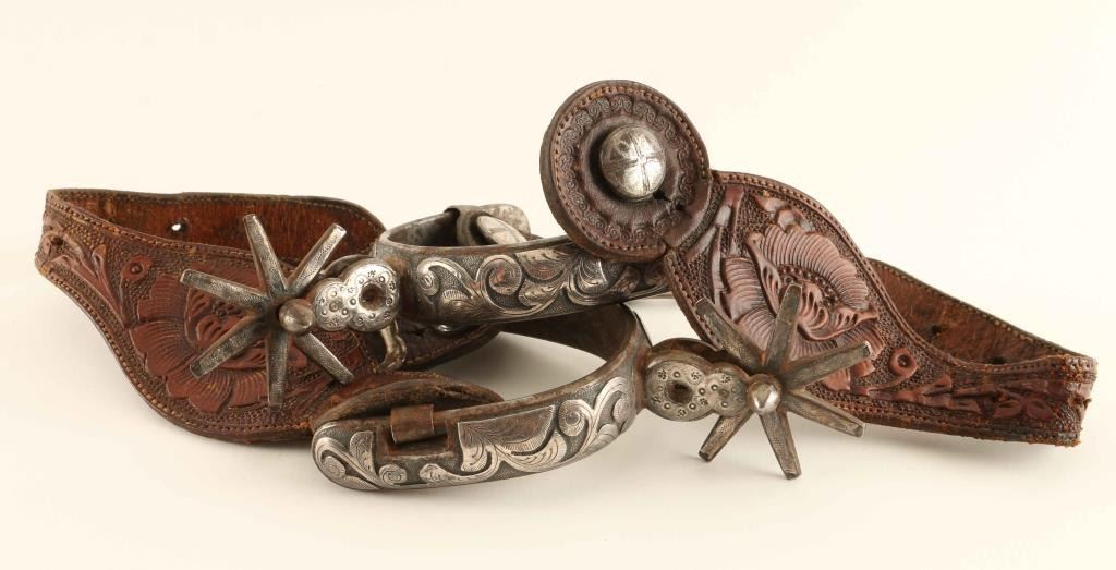 With Silver Engraved Overlaid Design Includes Floral Tooled Leather Spur Straps.