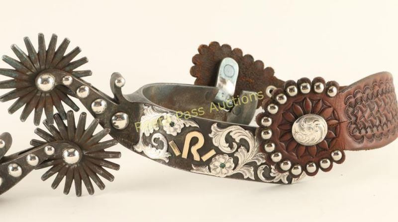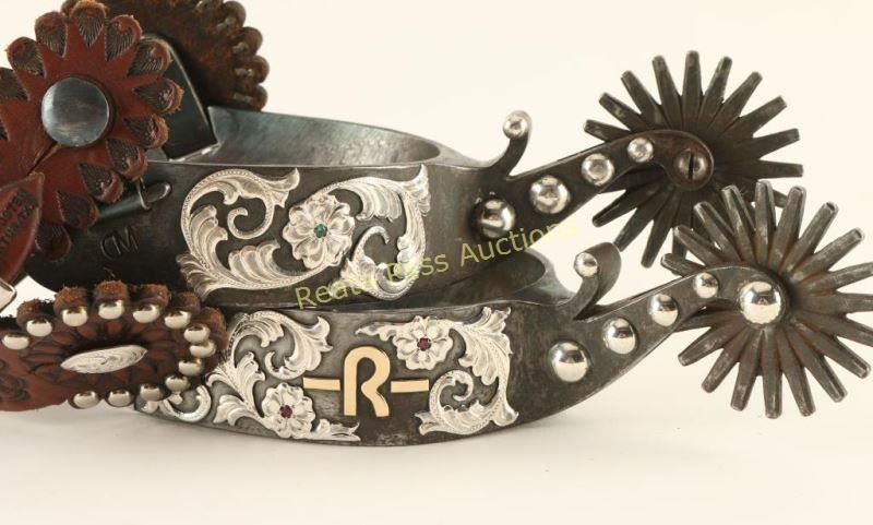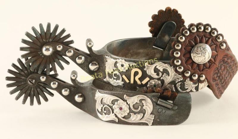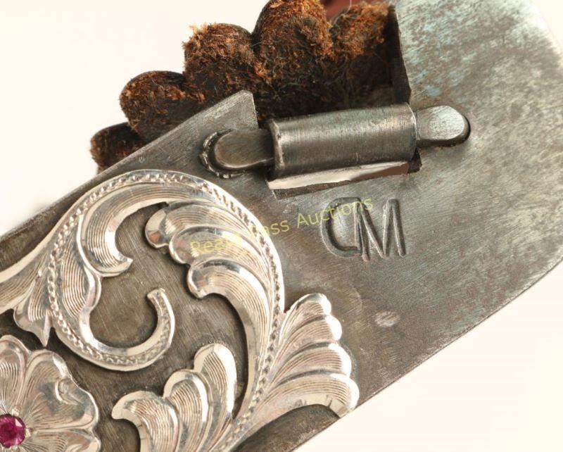 Maker marked "CM" with an engraved silver overlaid floral design set with red and green stones for Port and Starboard with tooled straps stamped Buddie Foster. he Spurs also have a brass "R"