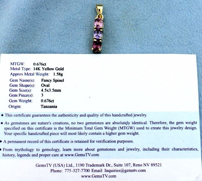 This beautiful 14k yellow gold pendant hold 3 gorgeous Fancy Spinel gems that total 0.676 carats. This piece was originally purchased from Gems TV and comes with Certificate of Authenticity. NO CHAIN 1.7g