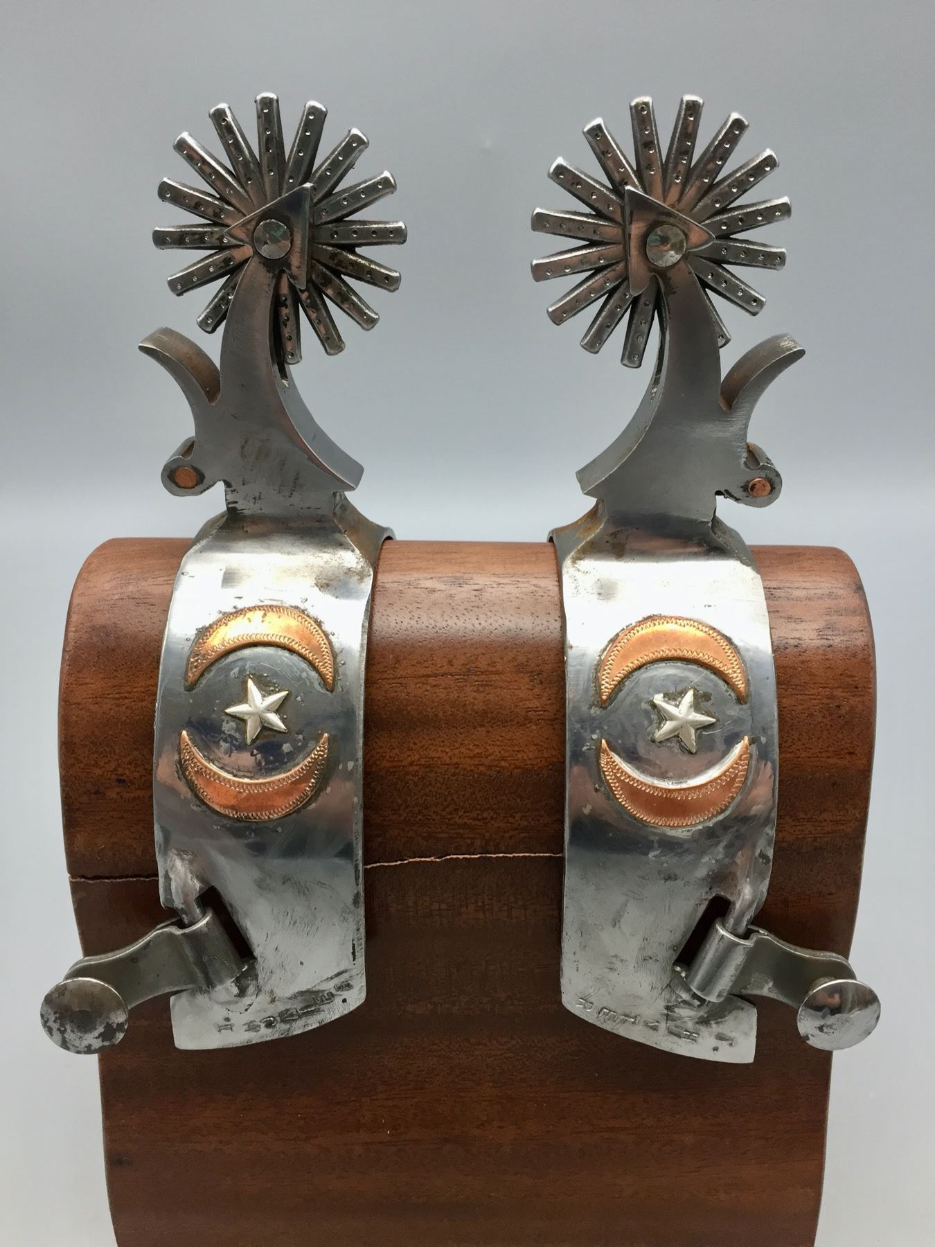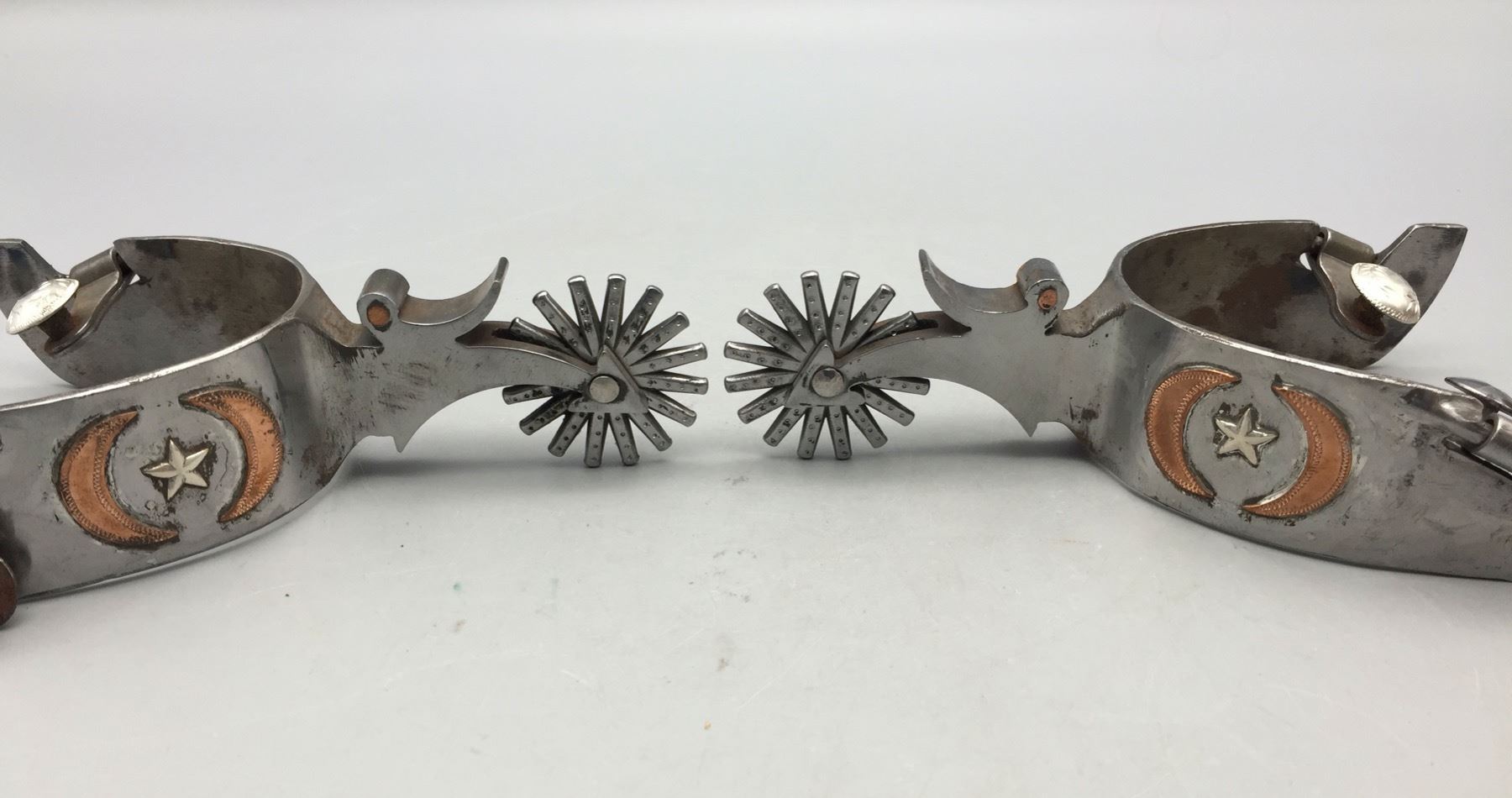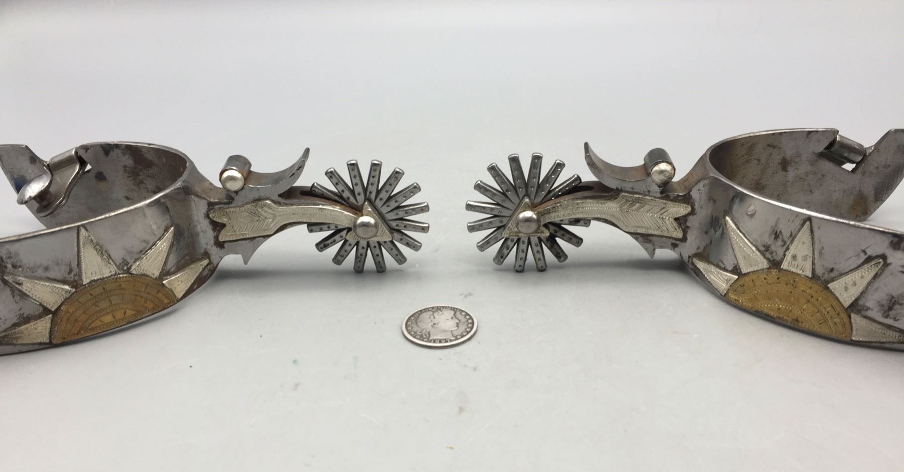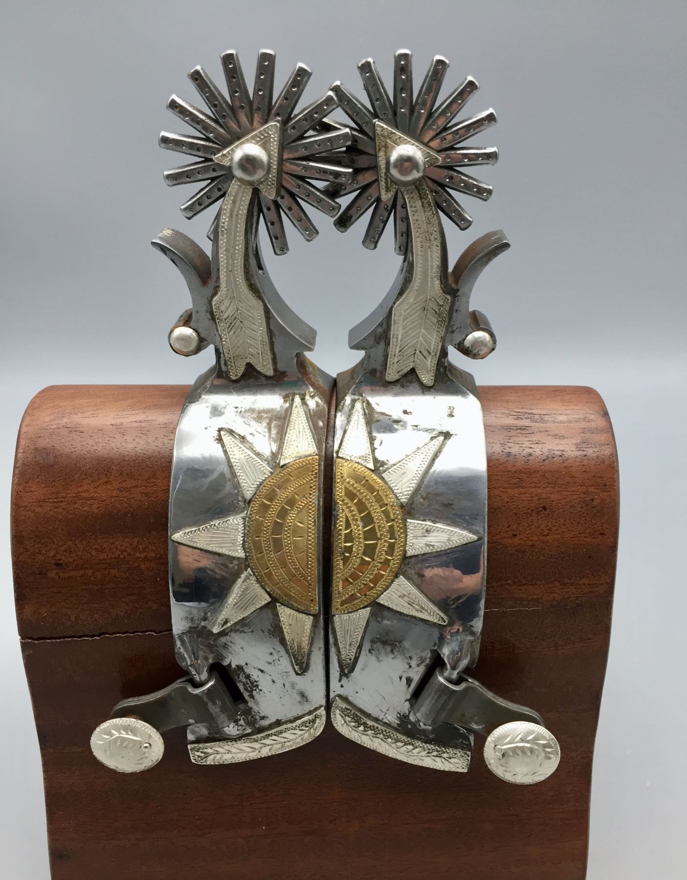 Description: Presented for your consideration we offer for sale this pair of fancy spurs featuring overlay, day and night designs on the bands and arrows on the shanks. They were created by Bill Young and Tim Hunter. Mr. Young does the iron work and Mr. Hunter does the silver work. Maker: Bill Young and Tim Hunter. Approx. Age: Vintage. Size: 3-1/4†heel, 3†shank, including rowel, 1-1/2†band. Condition: Good for its age, normal wear expected. Please look closely at the pictures - they are an important part of our description. Shipping: There will be a $5 handling / packaging fee for shipping this lot. The actual cost of postage will be added on top of that.