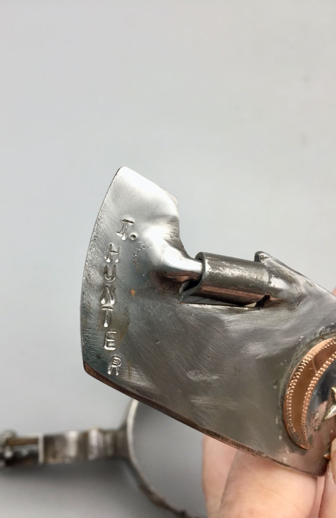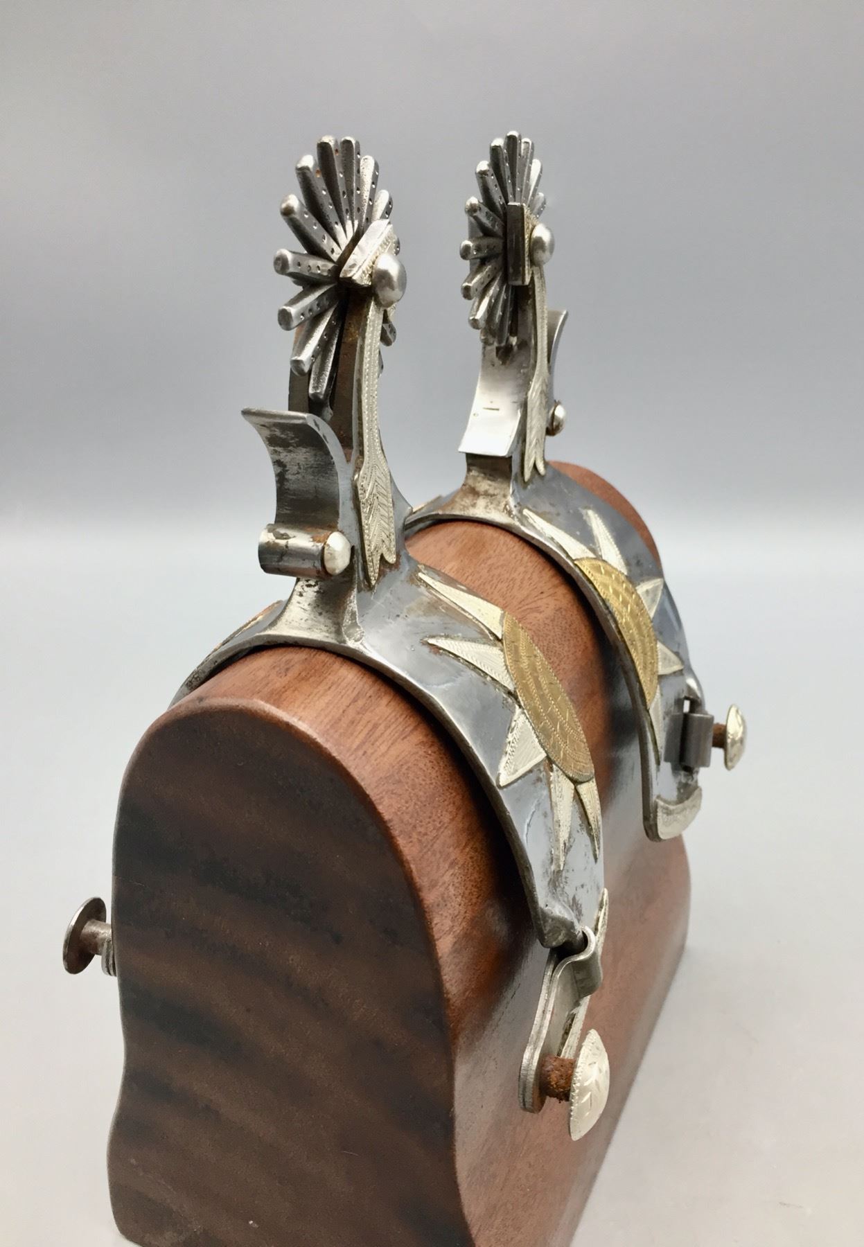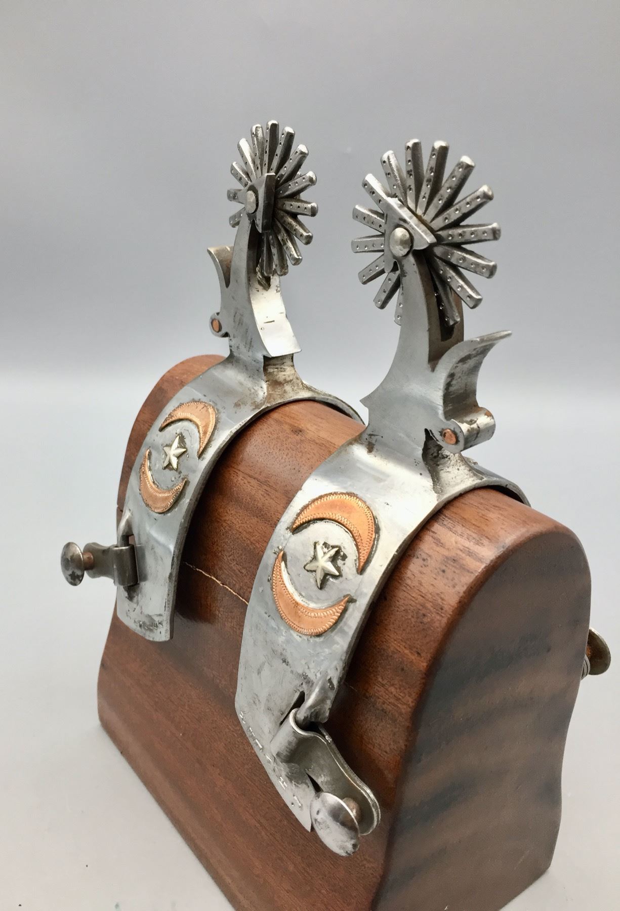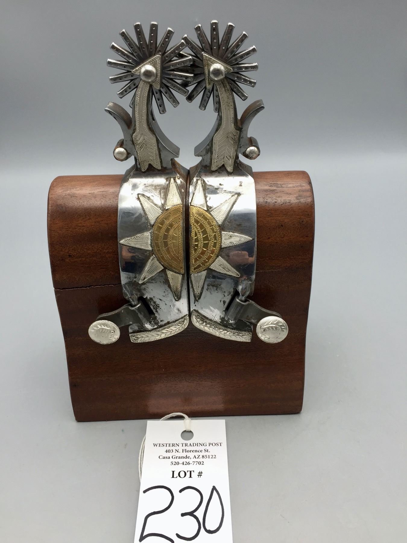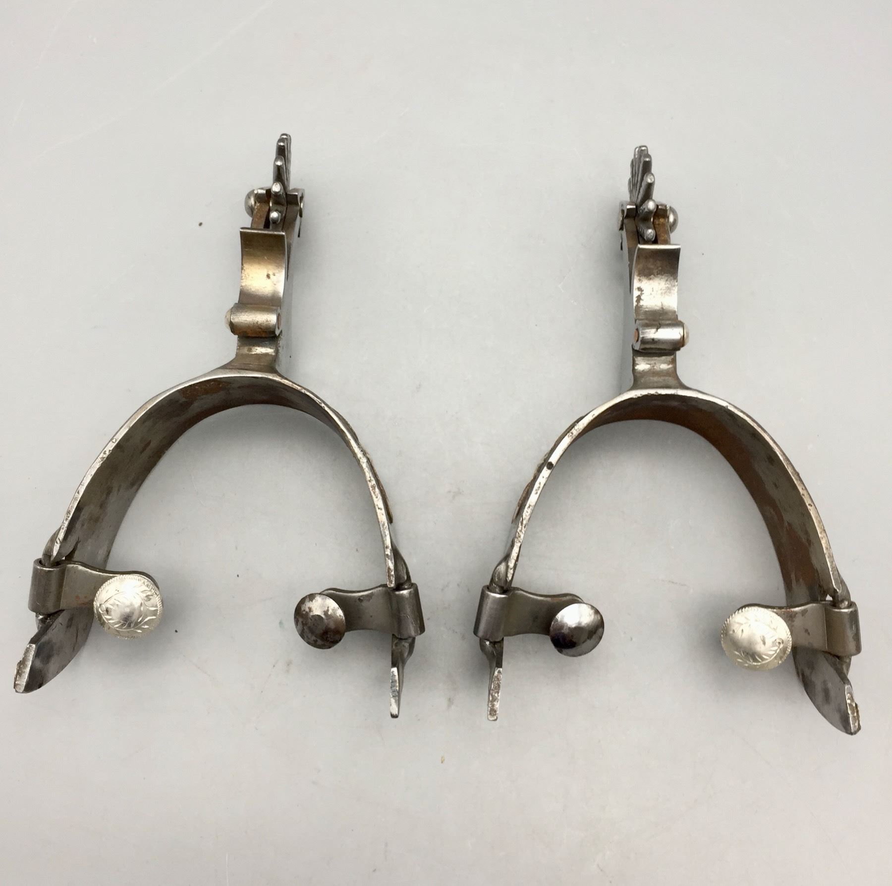Description: Presented for your consideration we offer for sale this pair of fancy spurs featuring overlay, day and night designs on the bands and arrows on the shanks. They were created by Bill Young and Tim Hunter. Mr. Young does the iron work and Mr. Hunter does the silver work. Maker: Bill Young and Tim Hunter. Approx. Age: Vintage. Size: 3-1/4†heel, 3†shank, including rowel, 1-1/2†band. Condition: Good for its age, normal wear expected. Please look closely at the pictures - they are an important part of our description. Shipping: There will be a $5 handling / packaging fee for shipping this lot. The actual cost of postage will be added on top of that.