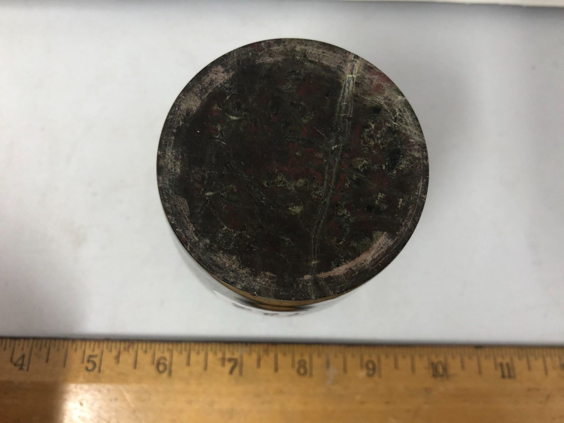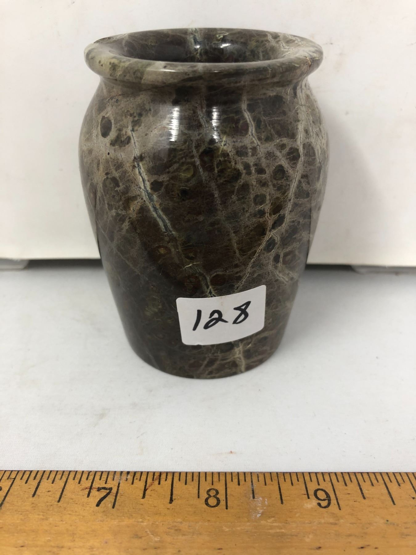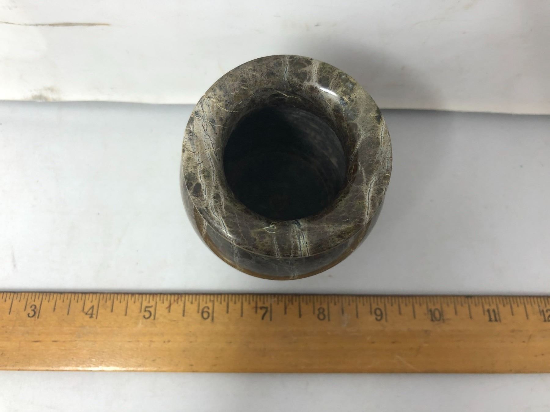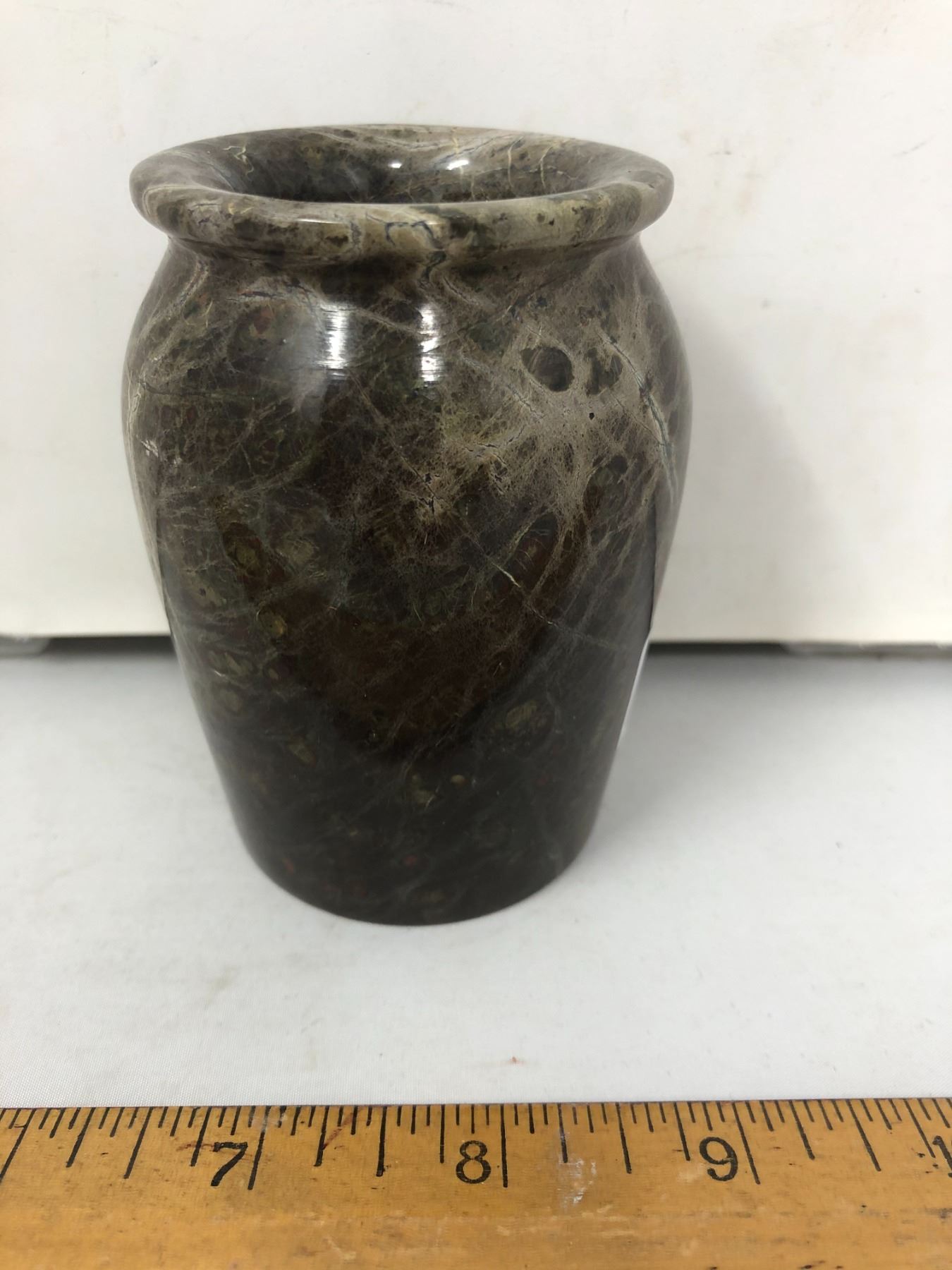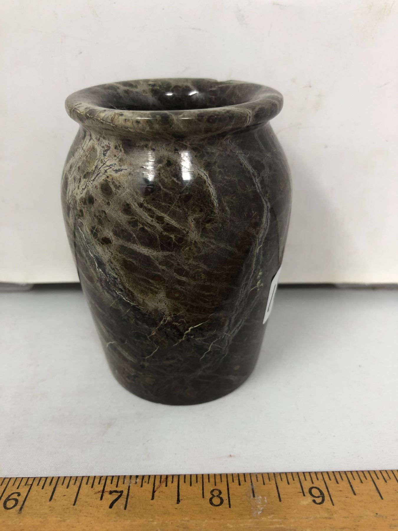 Fancy stone carved and polished urn vase open top like pencil jar. Height: 4”