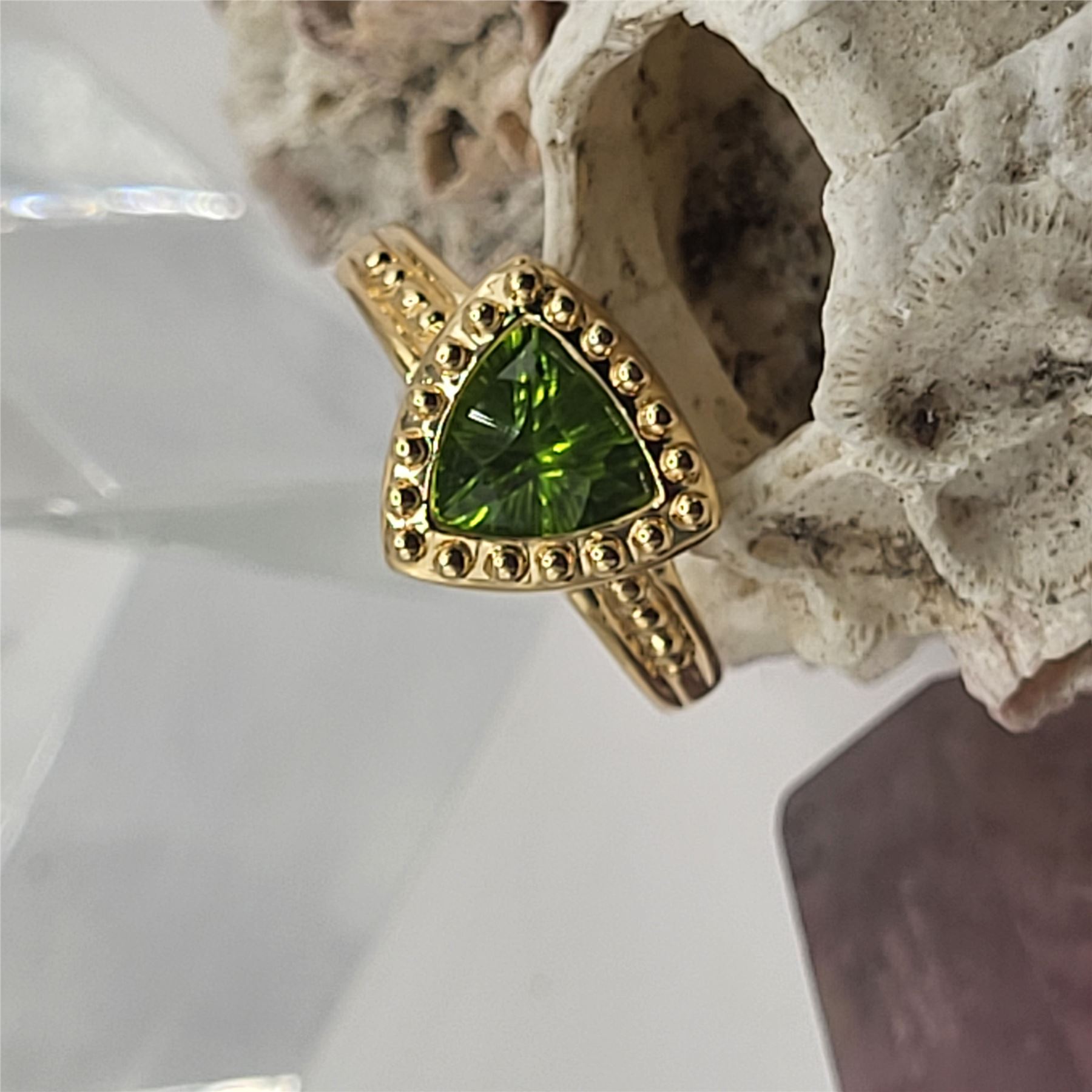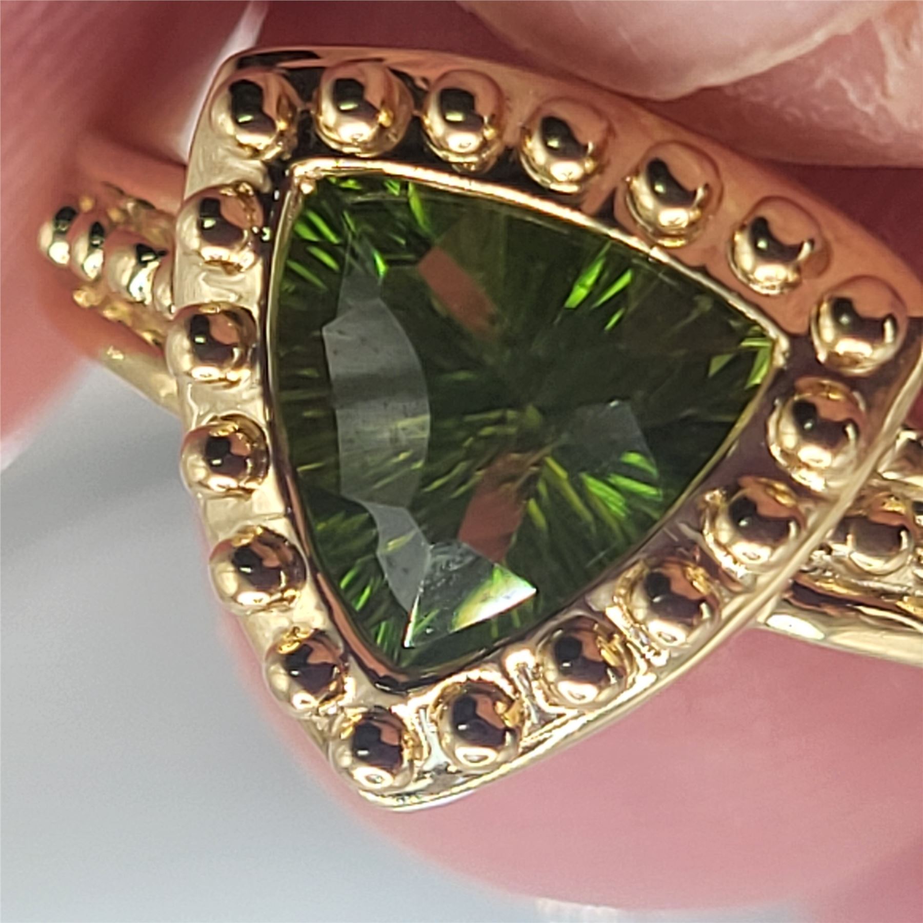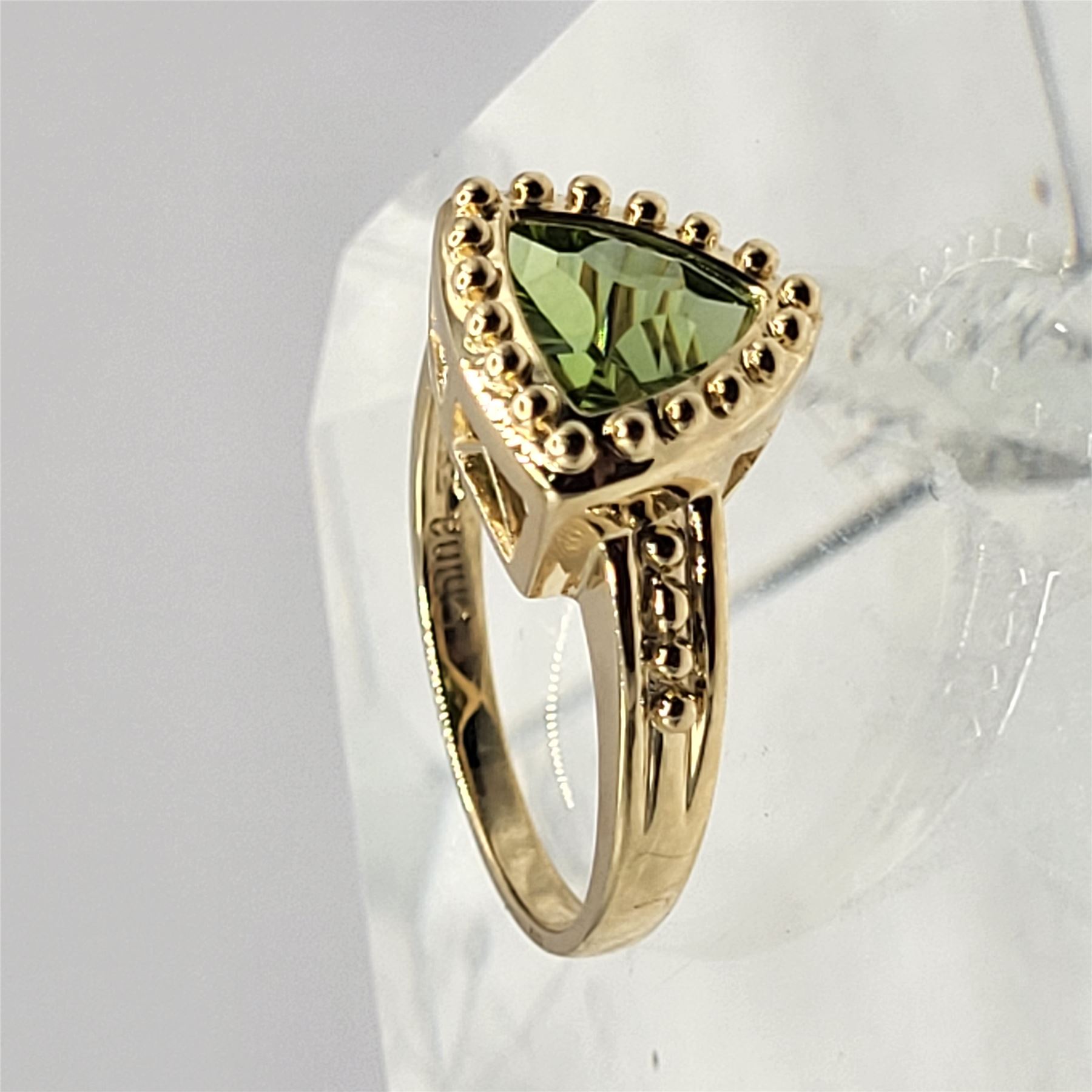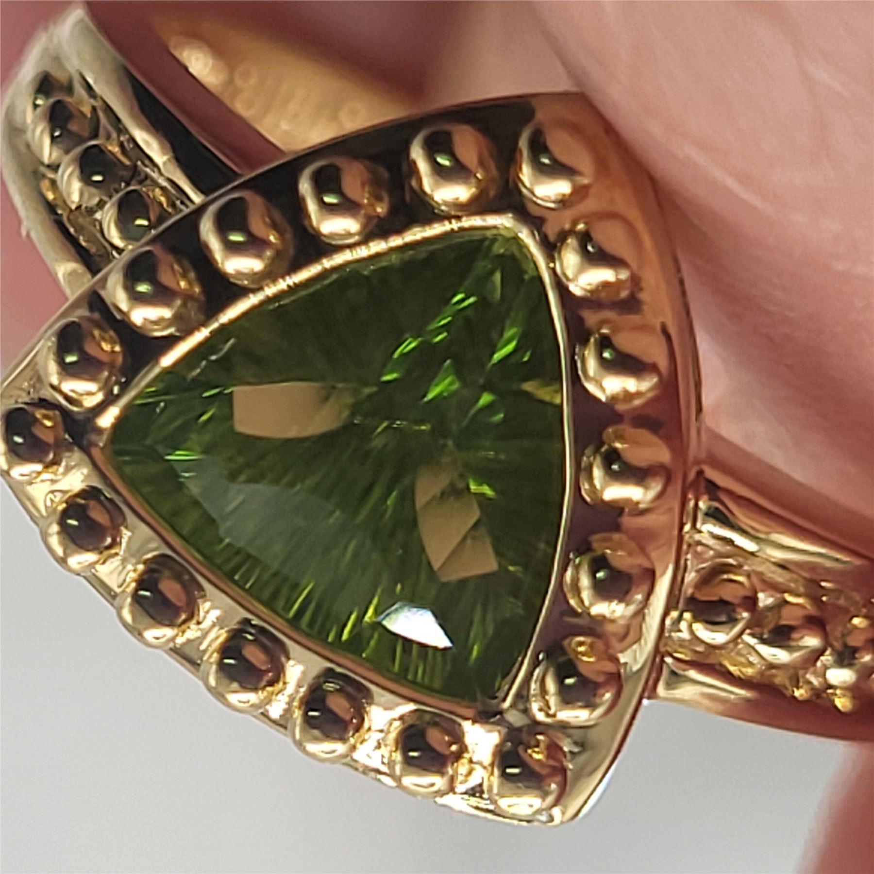 This 14 karat yellow gold ring is quite spectacular with an approximate 1.25 carat fancy trilliant-cut, channel-set, genuine peridot. The peridot is laser-cut with fancy scalloped facets along the girdle that extends onto the table and down along the pavilion. It is bezel-set into a beaded frame with a trussed gallery and beaded shoulders. This ring is approximately US size 7 and can be sized for an additional charge. Please contact Bidfair Fine Jewelry for sizing details.& nbsp; This is a brand new item that has been held in back stock. It is in excellent condition, but may have minor signs of storage, such as fine scratches or patina. Admin: 33110/4brb