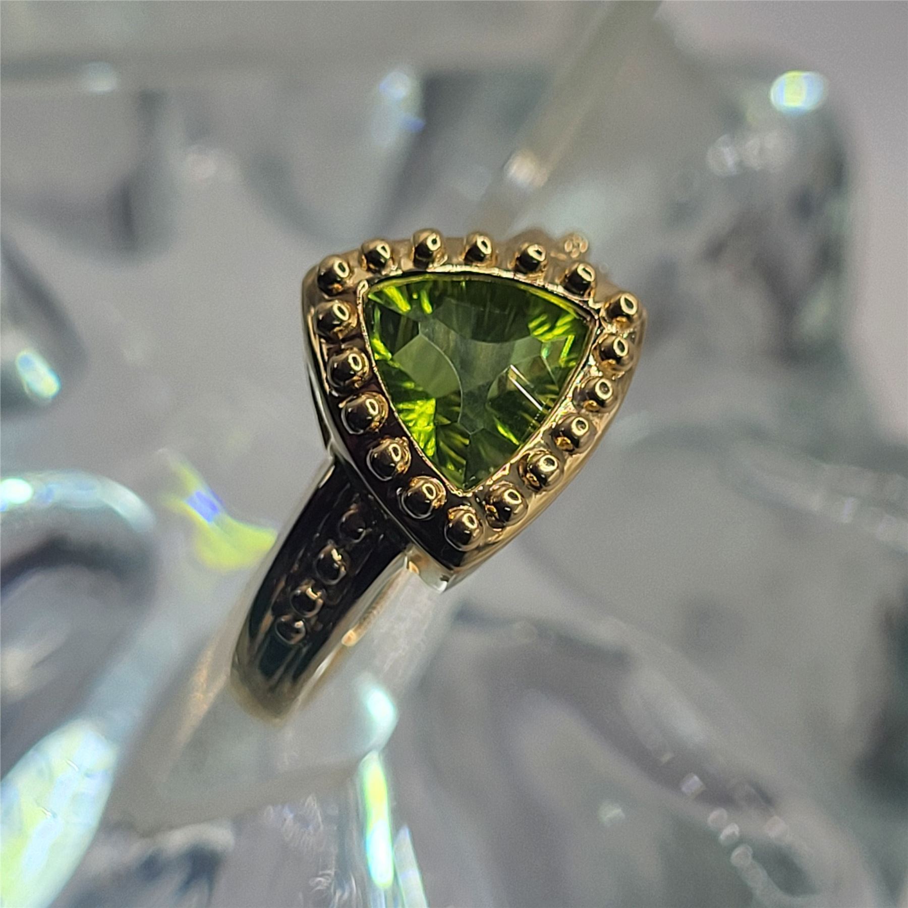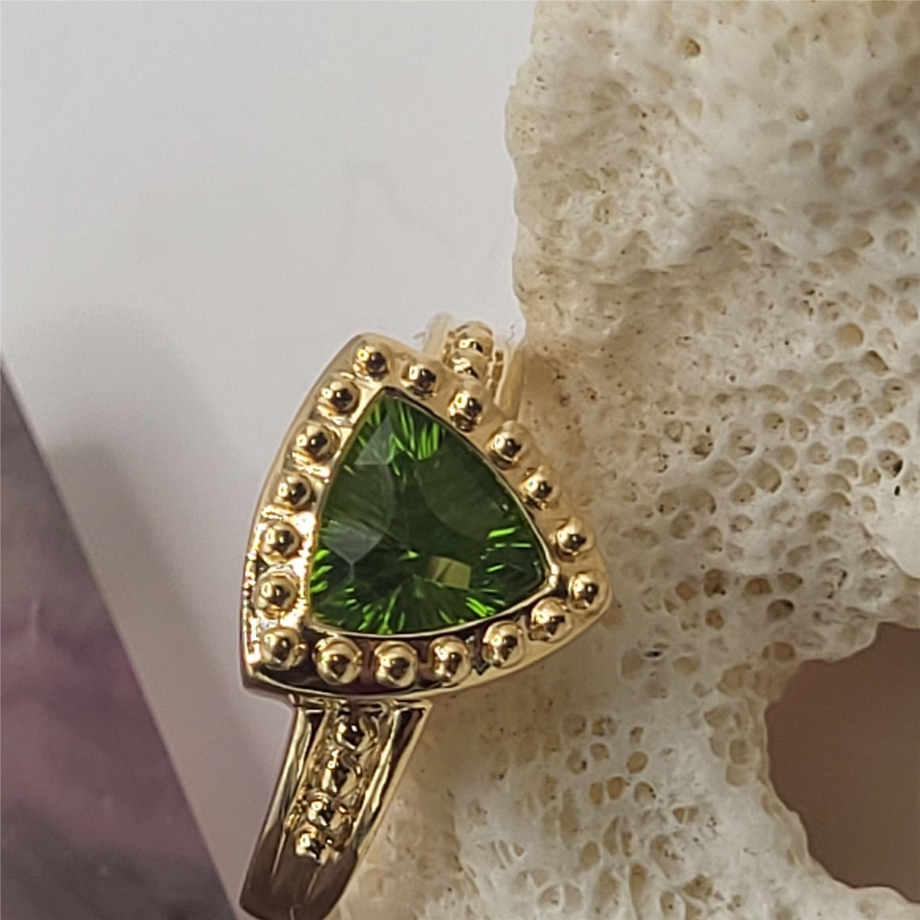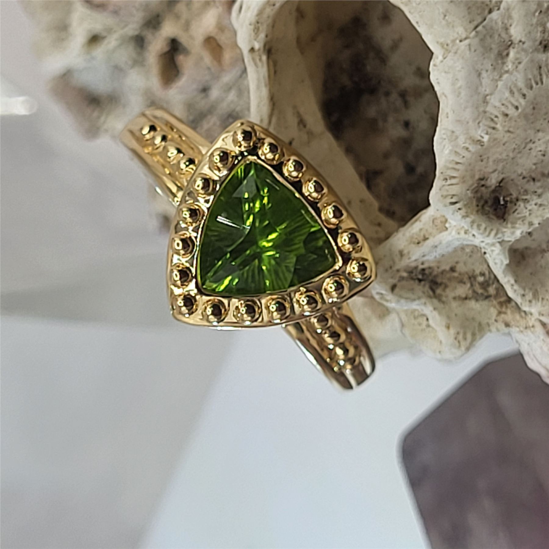 This 14 karat yellow gold ring is quite spectacular with an approximate 1.25 carat fancy trilliant-cut, channel-set, genuine peridot. The peridot is laser-cut with fancy scalloped facets along the girdle that extends onto the table and down along the pavilion. It is bezel-set into a beaded frame with a trussed gallery and beaded shoulders. This ring is approximately US size 7 and can be sized for an additional charge. Please contact Bidfair Fine Jewelry for sizing details.& nbsp; This is a brand new item that has been held in back stock. It is in excellent condition, but may have minor signs of storage, such as fine scratches or patina. Admin: 33110/4brb