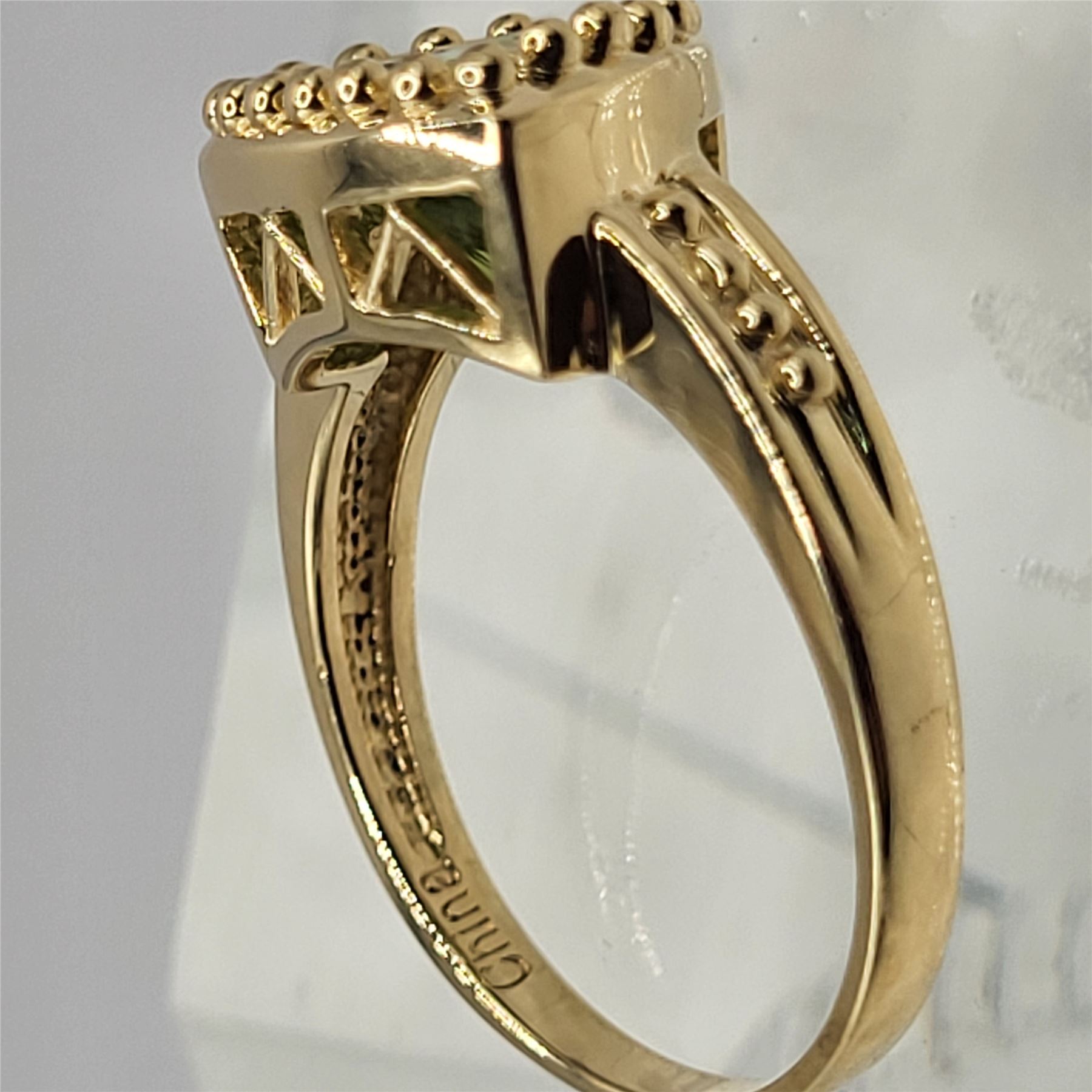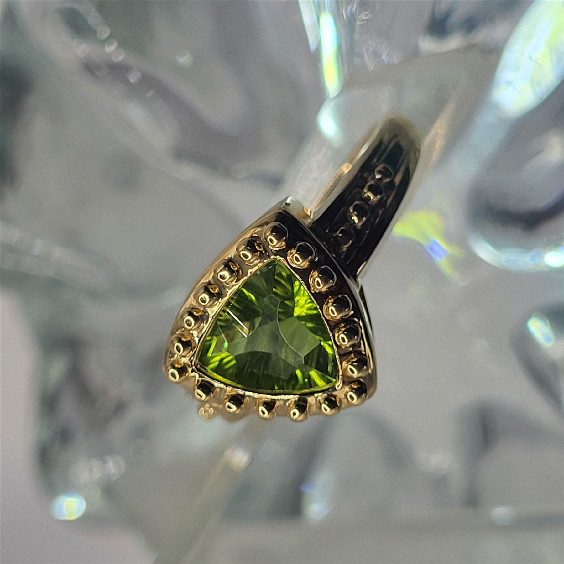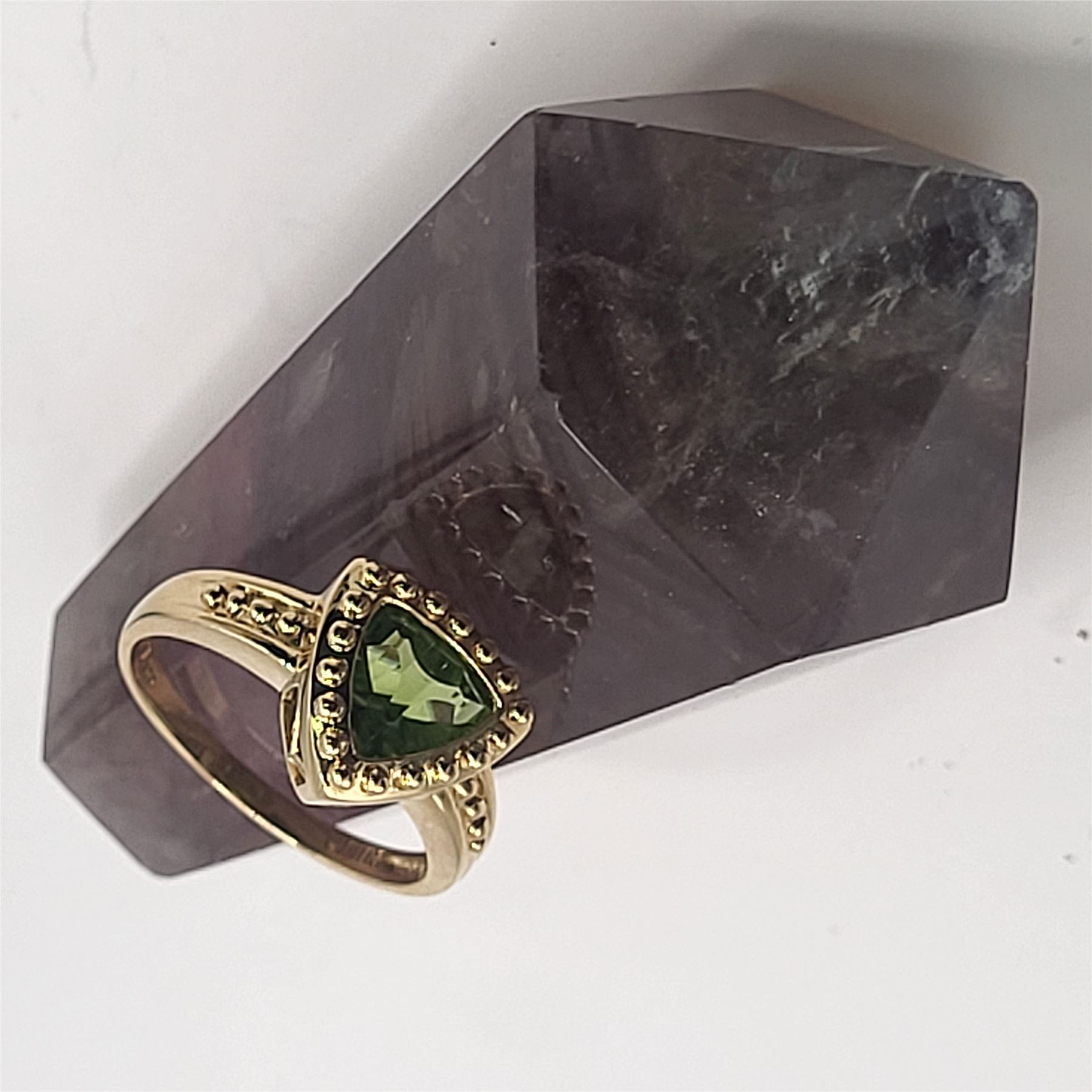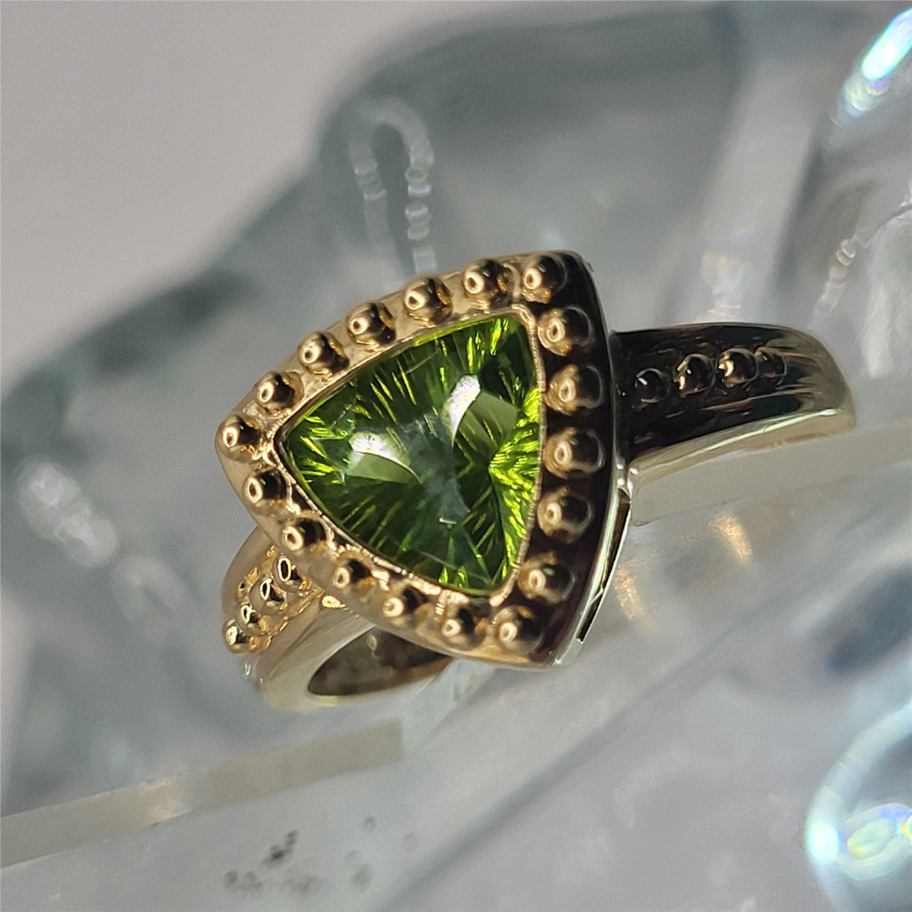 This 14 karat yellow gold ring is quite spectacular with an approximate 1.25 carat fancy trilliant-cut, channel-set, genuine peridot. The peridot is laser-cut with fancy scalloped facets along the girdle that extends onto the table and down along the pavilion. It is bezel-set into a beaded frame with a trussed gallery and beaded shoulders. This ring is approximately US size 7 and can be sized for an additional charge. Please contact Bidfair Fine Jewelry for sizing details.& nbsp; This is a brand new item that has been held in back stock. It is in excellent condition, but may have minor signs of storage, such as fine scratches or patina. Admin: 33110/4brb