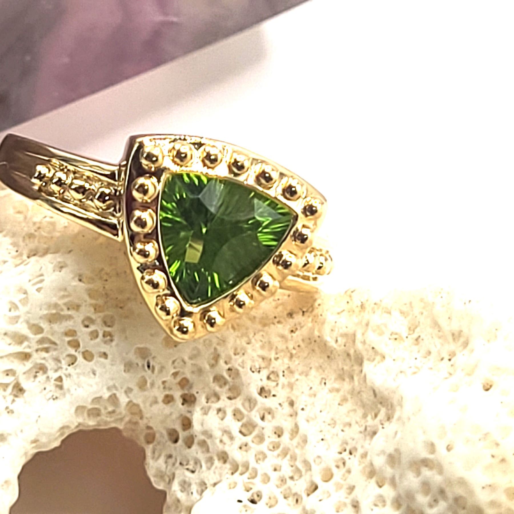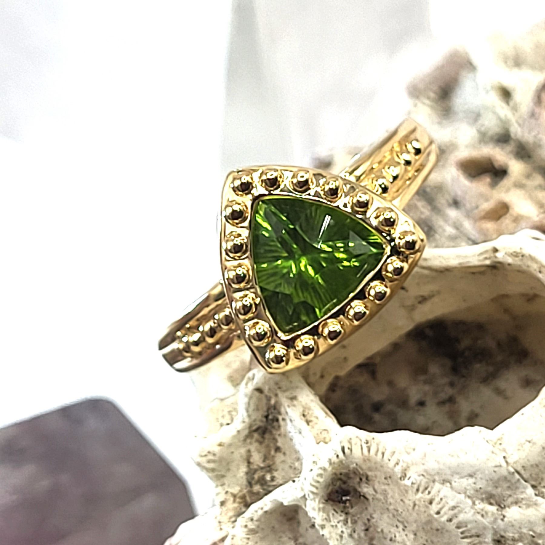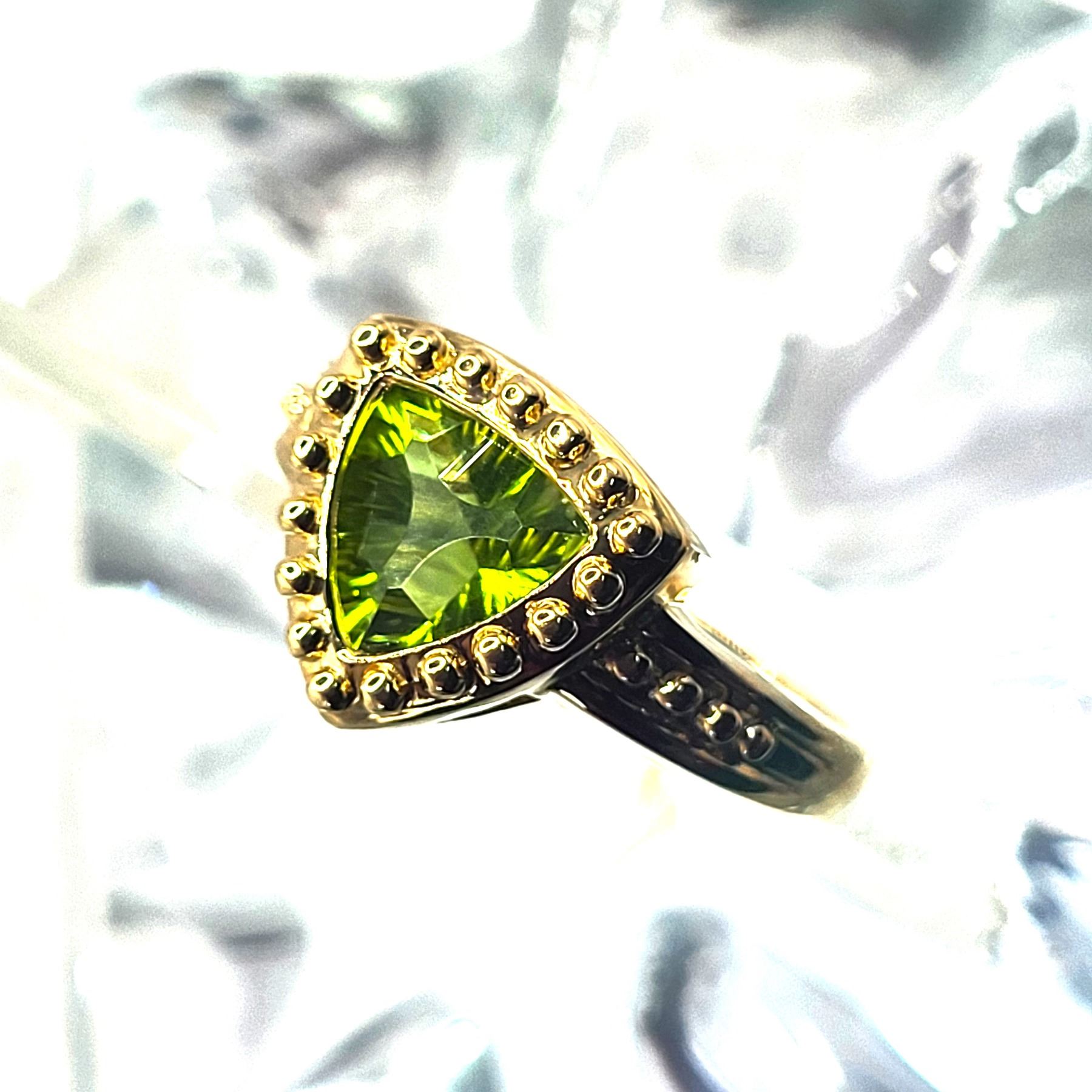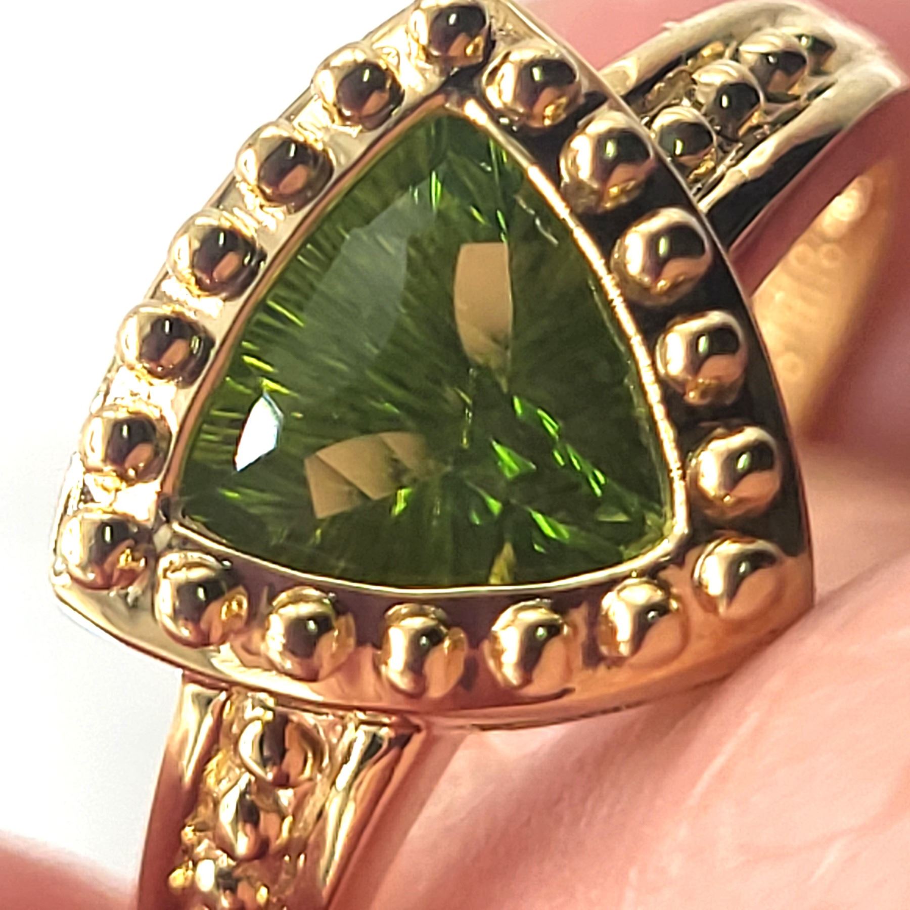 This 14 karat yellow gold ring is quite spectacular with an approximate 1.25 carat fancy trilliant-cut, channel-set, genuine peridot. The peridot is laser-cut with fancy scalloped facets along the girdle that extends onto the table and down along the pavilion. It is bezel-set into a beaded frame with a trussed gallery and beaded shoulders. This ring is approximately US size 7 and can be sized for an additional charge. Please contact Bidfair Fine Jewelry for sizing details. Admin: 33110/4brb