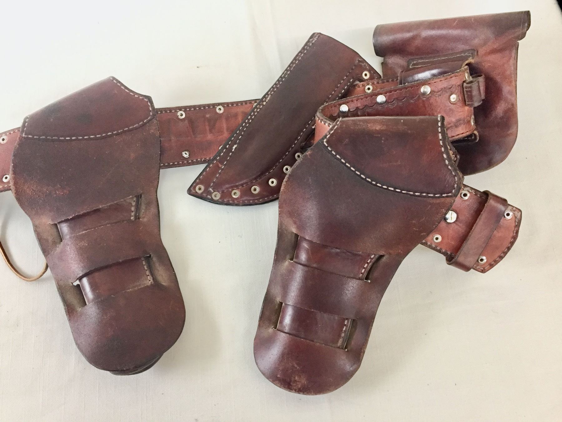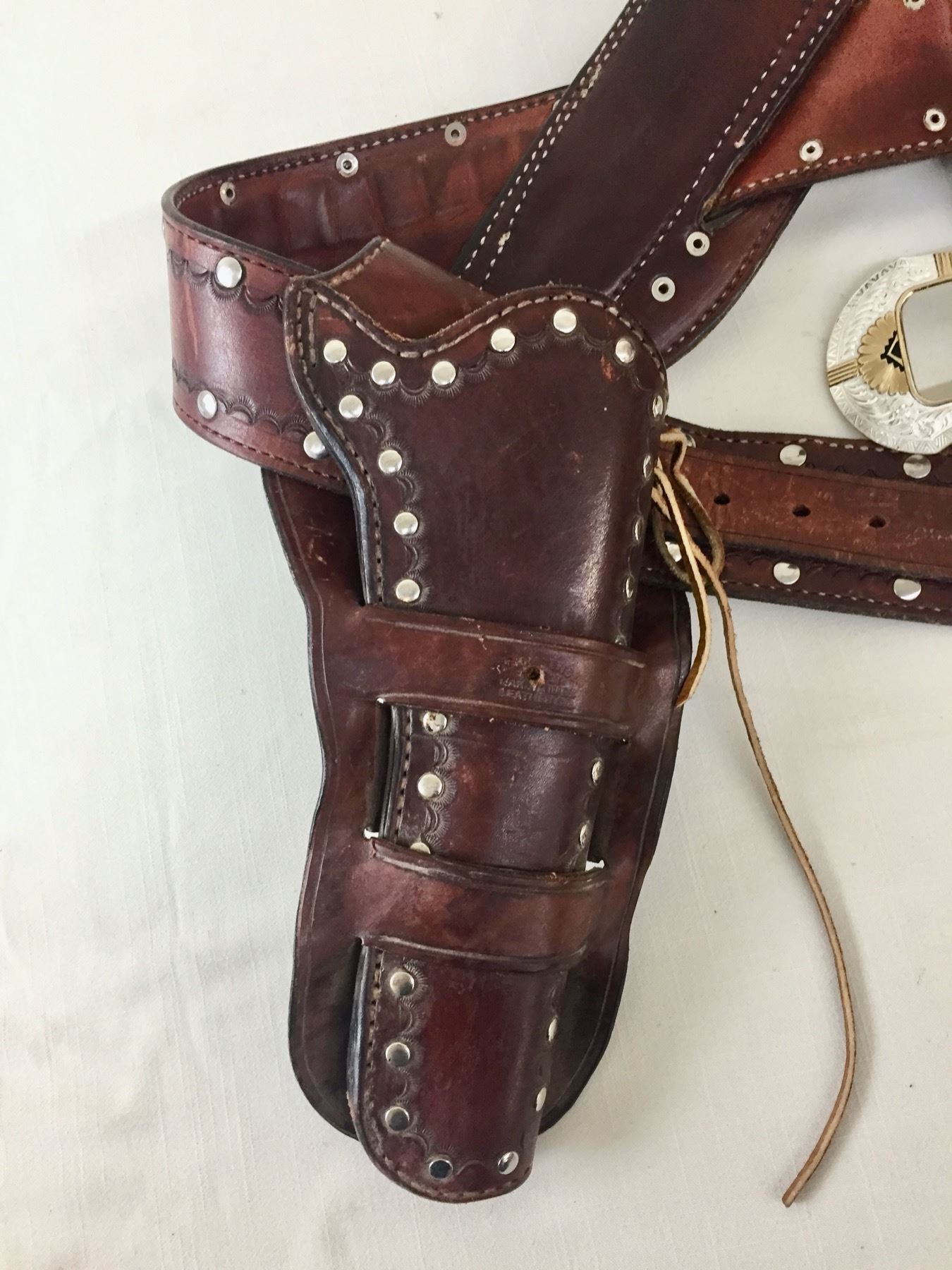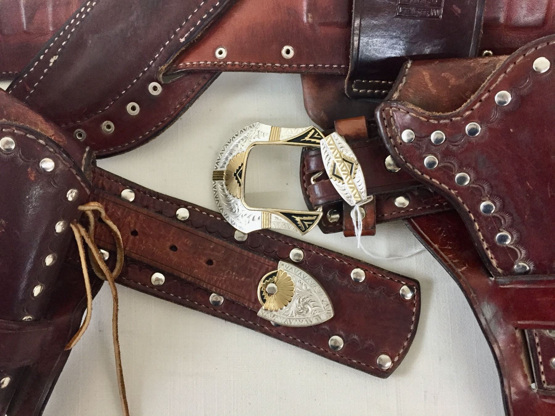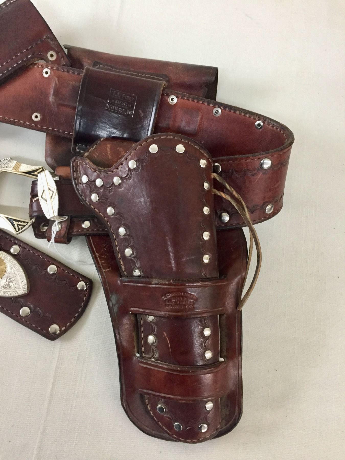 Description: Available for your enjoyment we offer for sale in this lot a very nice, fancy two gun rig featuring tooled leather and leather accents. Also has a knife sheath and leather possibles bag. Maker: The holsters are marked T. Christensen Early Times Leather Co., the bag is marked VA Franz, Las Vegas, NV. and the buckle set is by Montana Silversmith. Approx. Age: Vintage. Size: Belt 47”, holster 10” long and the other holster measures 12” long. Condition: Good for its age, normal wear expected. Please look closely at the pictures - they are an important part of our description. Shipping: There will be a $8 handling / packaging fee for shipping this lot. The actual cost of postage will be added on top of that.