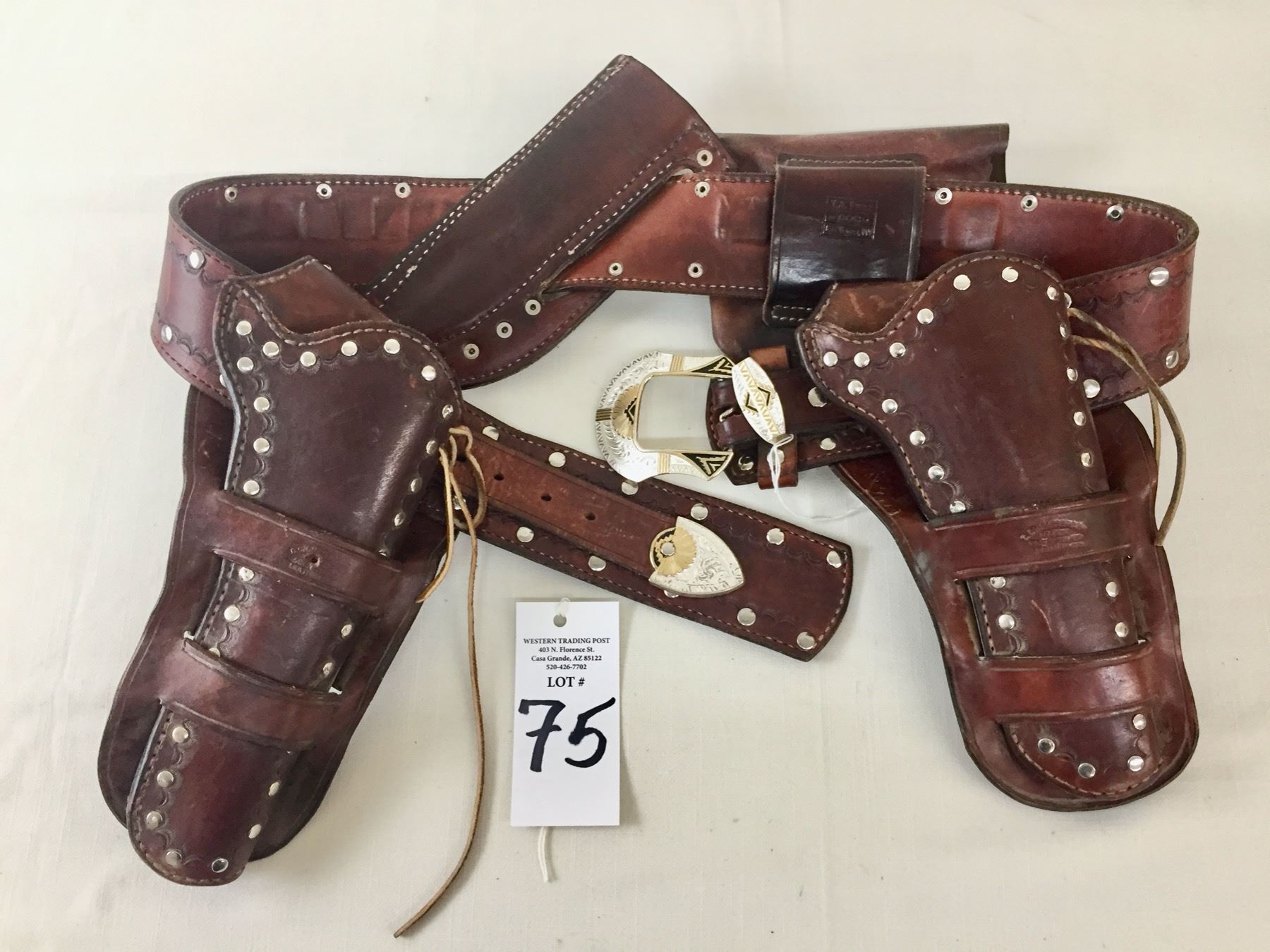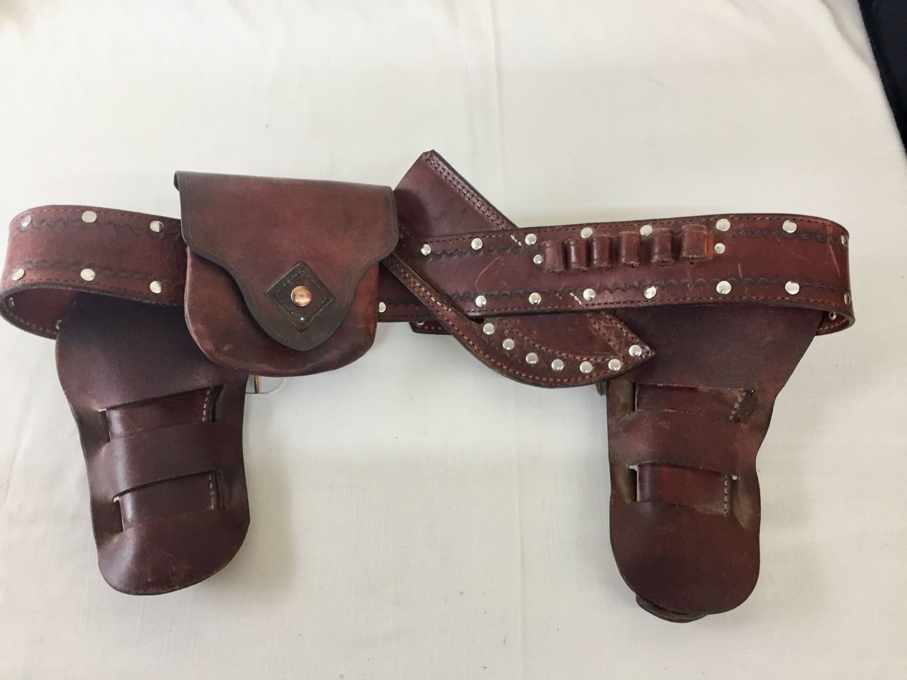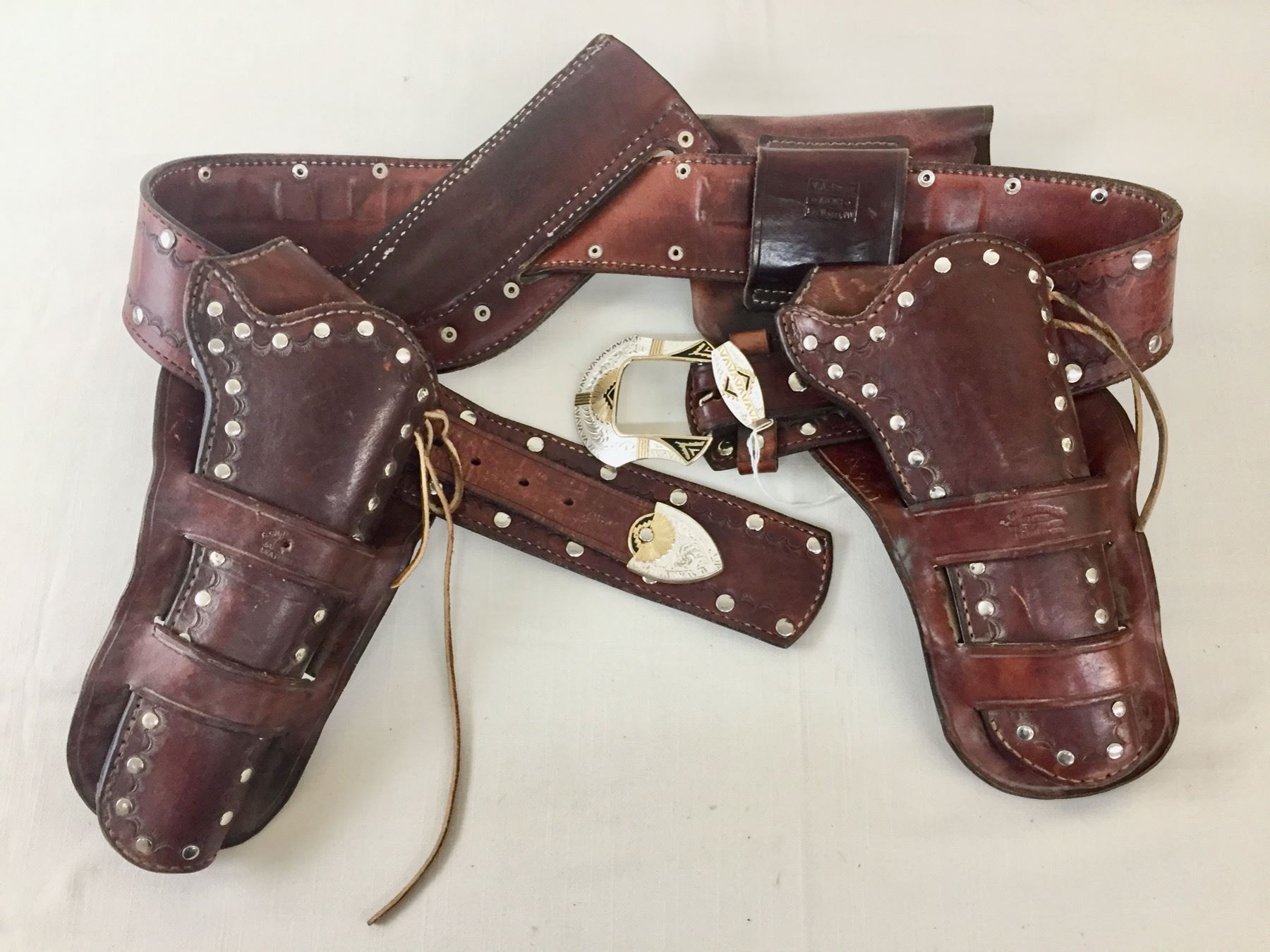 Description: Available for your enjoyment we offer for sale in this lot a very nice, fancy two gun rig featuring tooled leather and leather accents. Also has a knife sheath and leather possibles bag. Maker: The holsters are marked T. Christensen Early Times Leather Co., the bag is marked VA Franz, Las Vegas, NV. and the buckle set is by Montana Silversmith. Approx. Age: Vintage. Size: Belt 47”, holster 10” long and the other holster measures 12” long. Condition: Good for its age, normal wear expected. Please look closely at the pictures - they are an important part of our description. Shipping: There will be a $8 handling / packaging fee for shipping this lot. The actual cost of postage will be added on top of that.