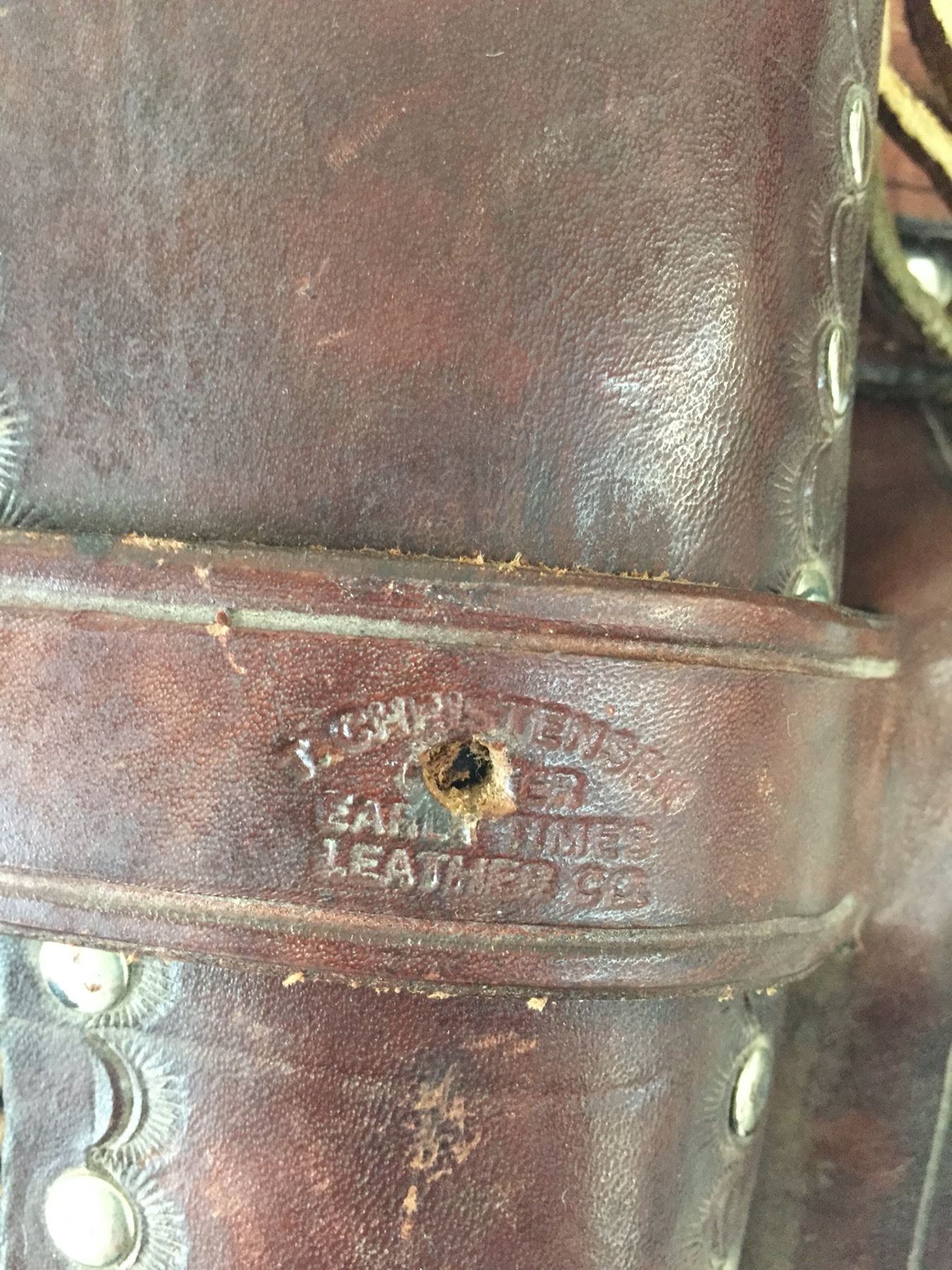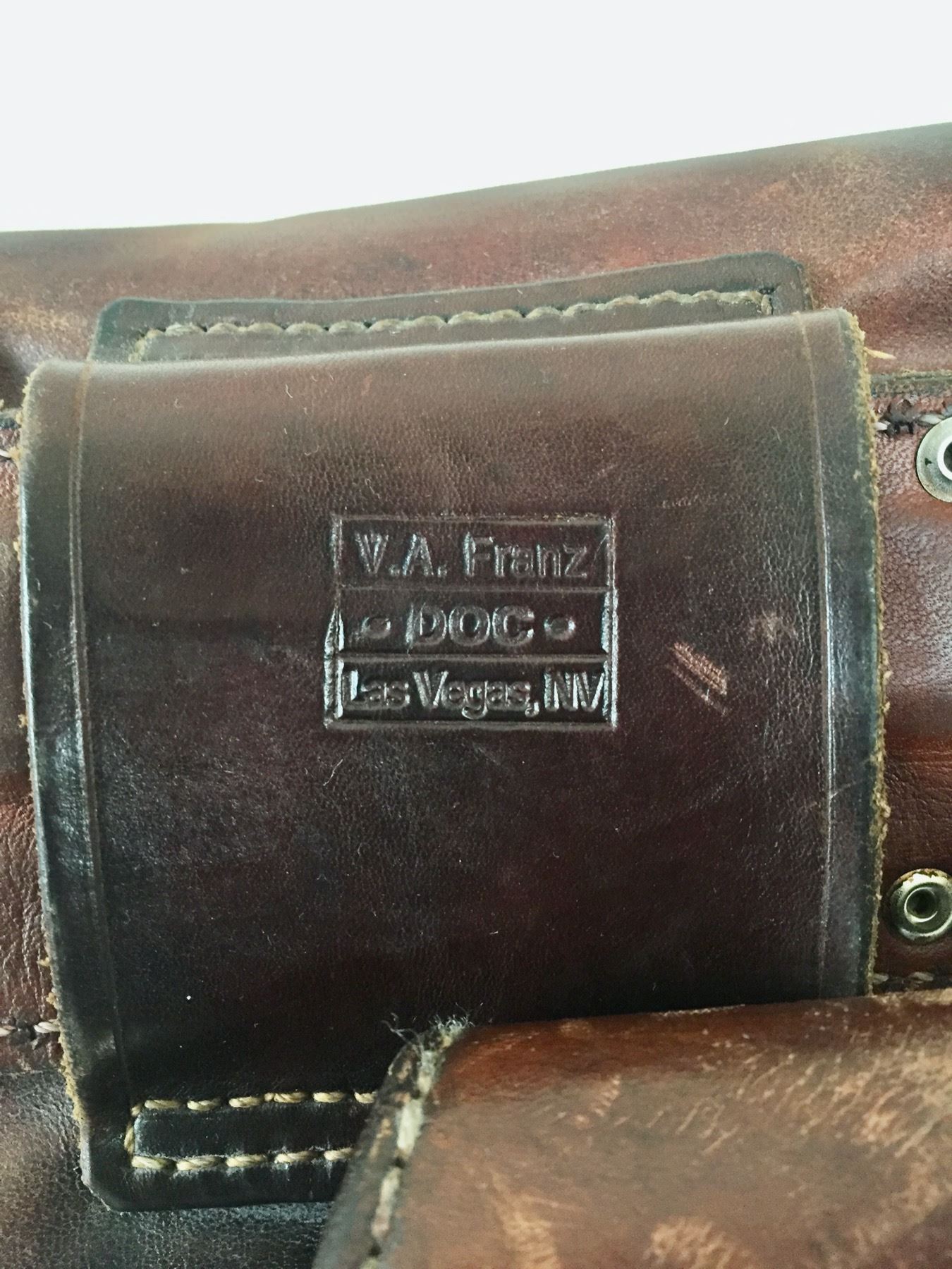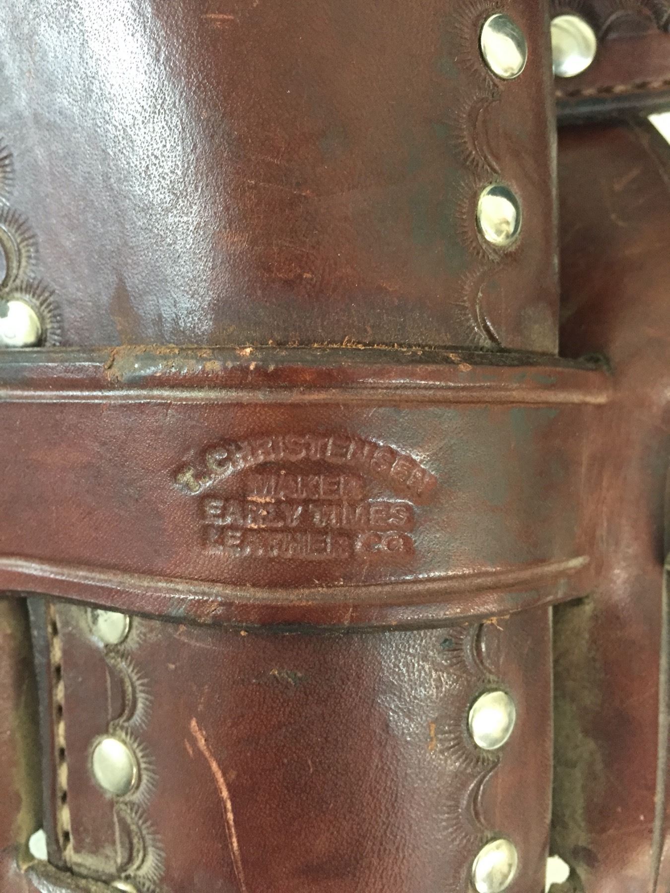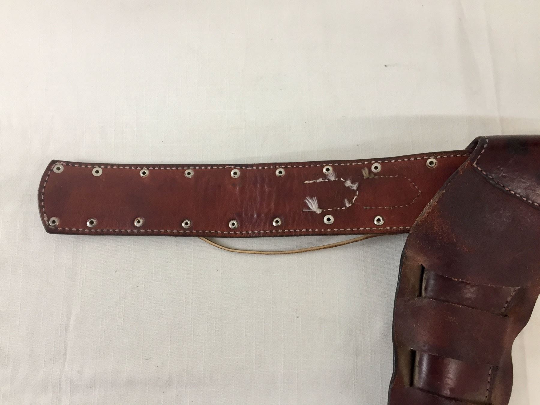 Description: Available for your enjoyment we offer for sale in this lot a very nice, fancy two gun rig featuring tooled leather and leather accents. Also has a knife sheath and leather possibles bag. Maker: The holsters are marked T. Christensen Early Times Leather Co., the bag is marked VA Franz, Las Vegas, NV. and the buckle set is by Montana Silversmith. Approx. Age: Vintage. Size: Belt 47”, holster 10” long and the other holster measures 12” long. Condition: Good for its age, normal wear expected. Please look closely at the pictures - they are an important part of our description. Shipping: There will be a $8 handling / packaging fee for shipping this lot. The actual cost of postage will be added on top of that.
