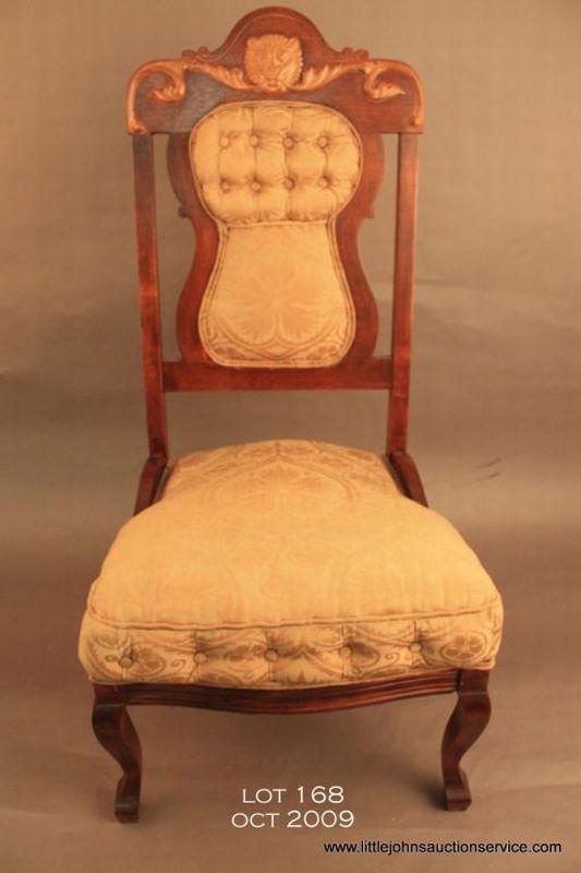 Fancy Victorian side chair with silk brocade. Possibly original upholstery and carved back in lion w/scroll motif. This exact chair was formerly in the Mackay Museum Mansion display sold by Little John's in 1994. C.H. Mackay was themining magnate who ran the Gould and Curry mine in Virginia City Nevada. This chair was prominent in the mansion's display and was identified to an individual at one time. Est. $500 - $1,000