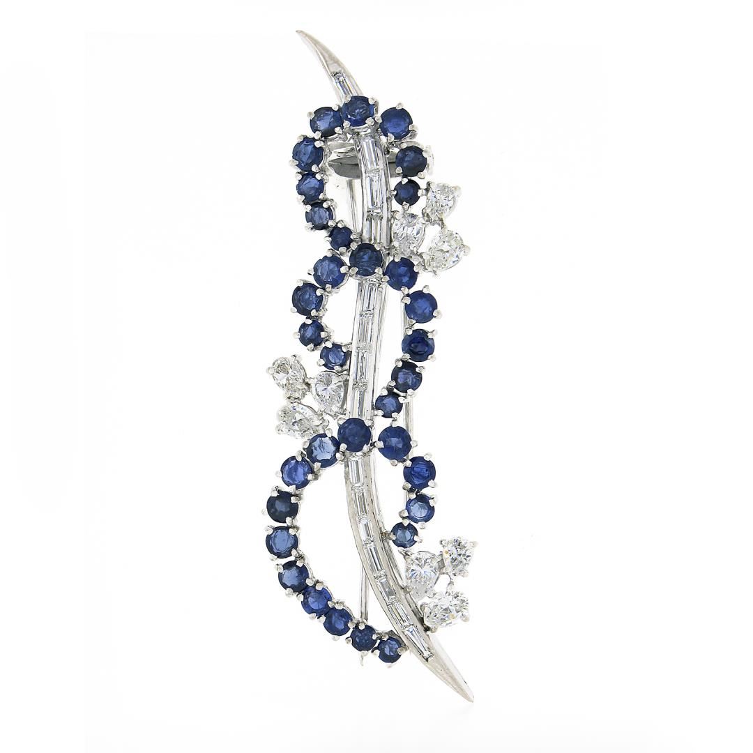 A vintage solid 18k white gold swirl brooch, with 9 pear cut natural diamonds (G/H - VS2/SI1 ; 1.70ctw), 15 baguette cut natural diamonds (G/H- VS1/VS2 ; 0.85ctw), and 33 round brilliant cut natural sapphires (3.50ctw ). Measures 18.60x62.20mm and weighs a total of 11.86 grams.