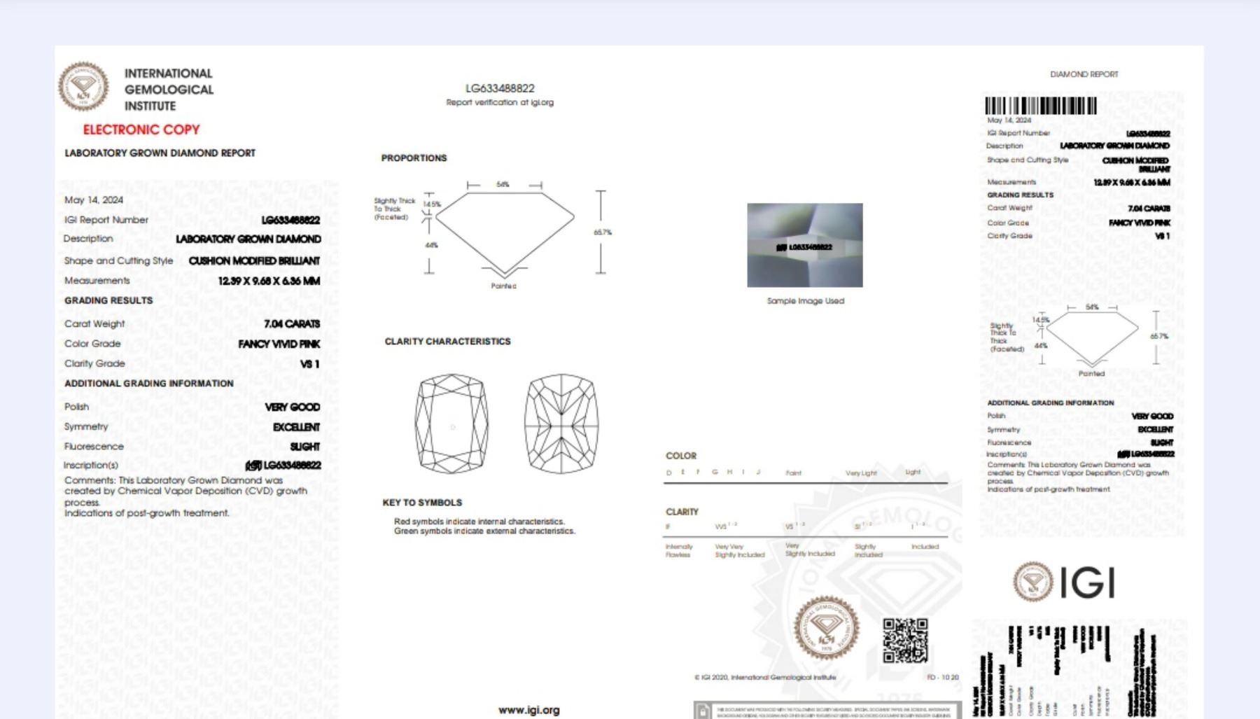 Fancy Vivid Pink Diamond 7.04 Cts - VS Clarity; IGI lab ----Laser Inscription: IGI Number Laser Inscription on Girdle( All Our Diamonds are Guarnteed authentic Lab Grown Diamonds) (Stock Ref---US363-FD)