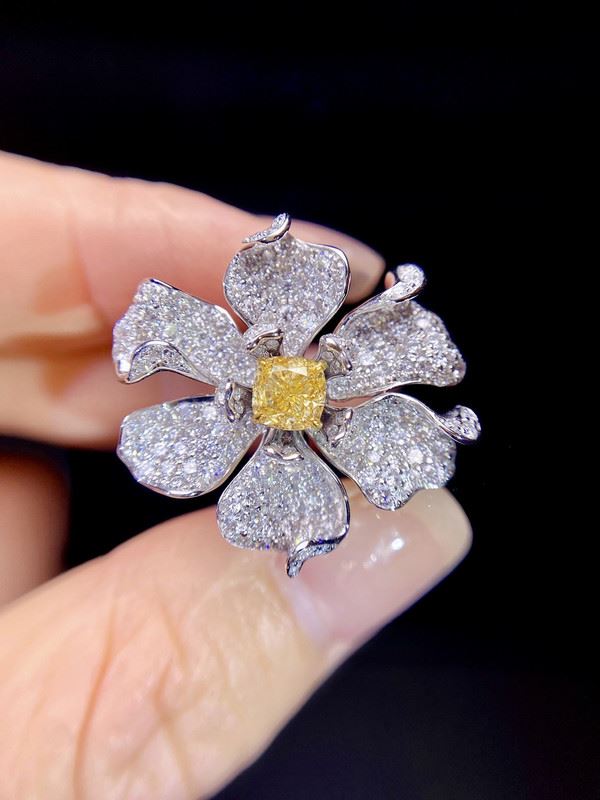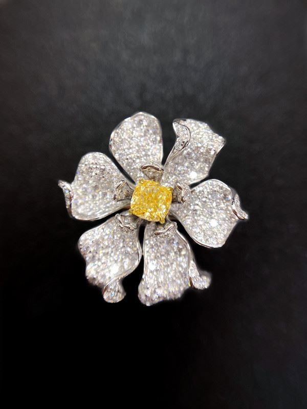 A cushion fancy yellow diamond centers the bloom, surrounded by six softly ruffled pavé diamond petals. With a discreet convertible mechanism, it transforms from a statement ring to a graceful pendant. The white-metal setting heightens the sunny glow—versatile for everyday polish and evening elegance. Ring size: 6, circumference: 52 mm, diameter: 16.6 mm, .main diamond: 4.259ct, side diamonds: 2.072ct. Note: Comes with a GIA Natural Diamond Report and a Beijing NGTC certificate.