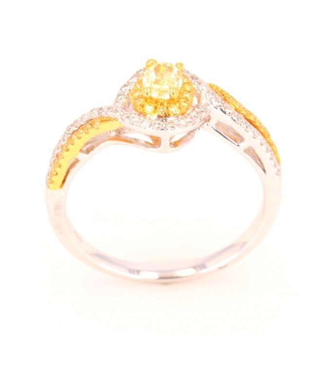 This is a beautiful Fancy Yellow Diamond and nearly colorless Diamond 14K gold ring in brand new condition. At the center shows an oval brilliant cut Fancy Intense Yellow Diamond with weight of 0.24 carats and very high clarity of VS1-VS2 showing an halo bezel and halo split shoulder being set with 32 round brilliant yellow diamonds (weight of 0.14 carats) and 42 round brilliant Diamonds (weight of 0.17 carats). The ring has a 14 karat yellow gold weight of 2.83 grams and is in a size 7 US.