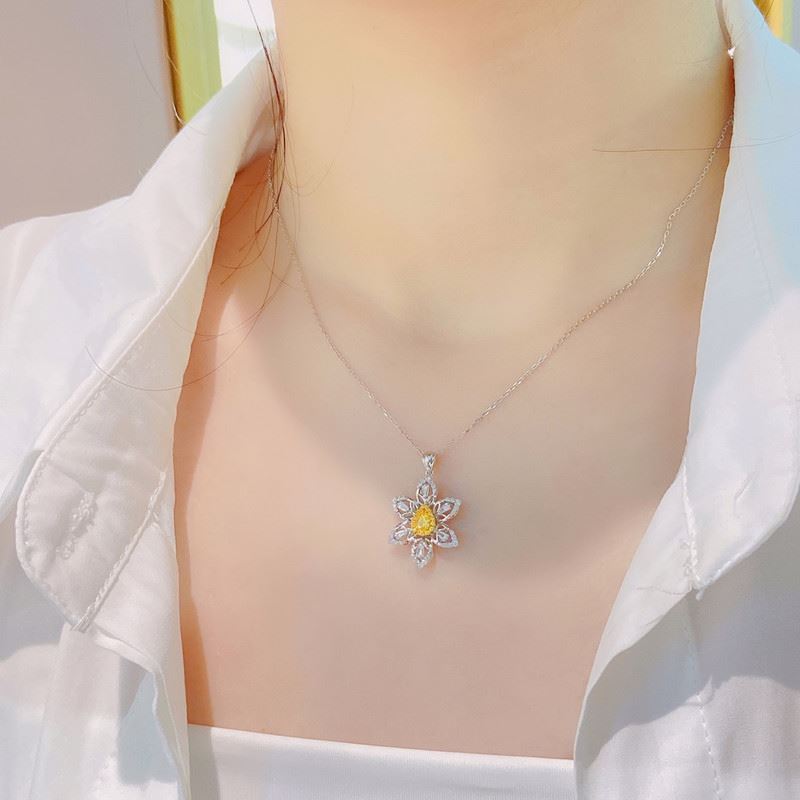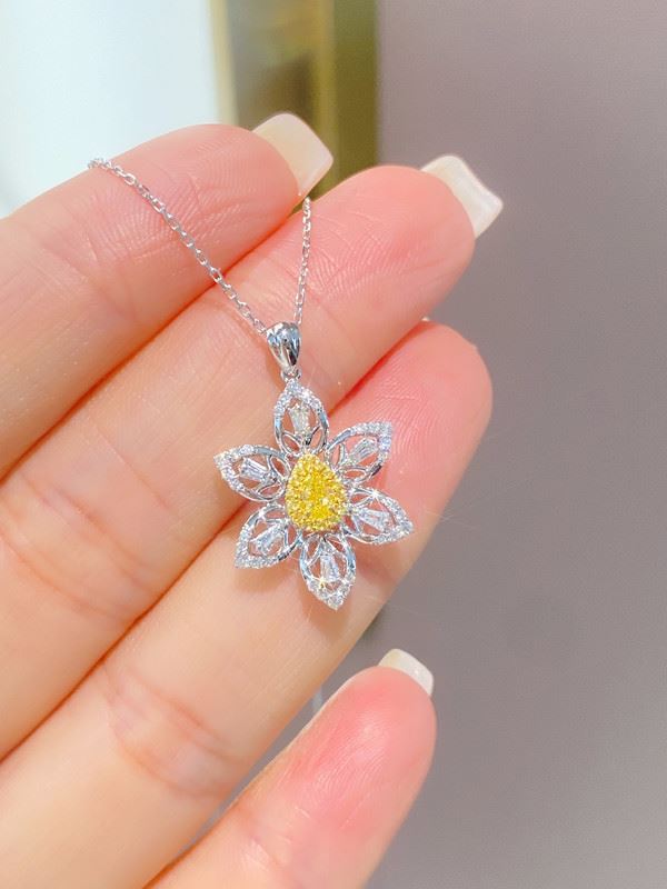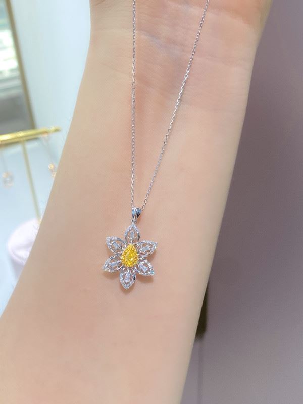 A pear-shaped fancy yellow diamond sits at the heart of a six-petal bloom, while openwork petals are traced with pavé white diamonds for airy sparkle. Suspended from a white-metal chain, it’s soft, luminous, and effortlessly versatile from day to evening. Main stone: 0.188ct, side diamonds: 0.384ct. Note: Comes with an AGL certificate and a domestic jewelry identification certificate.